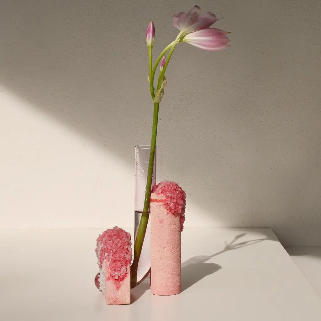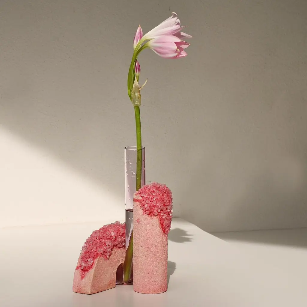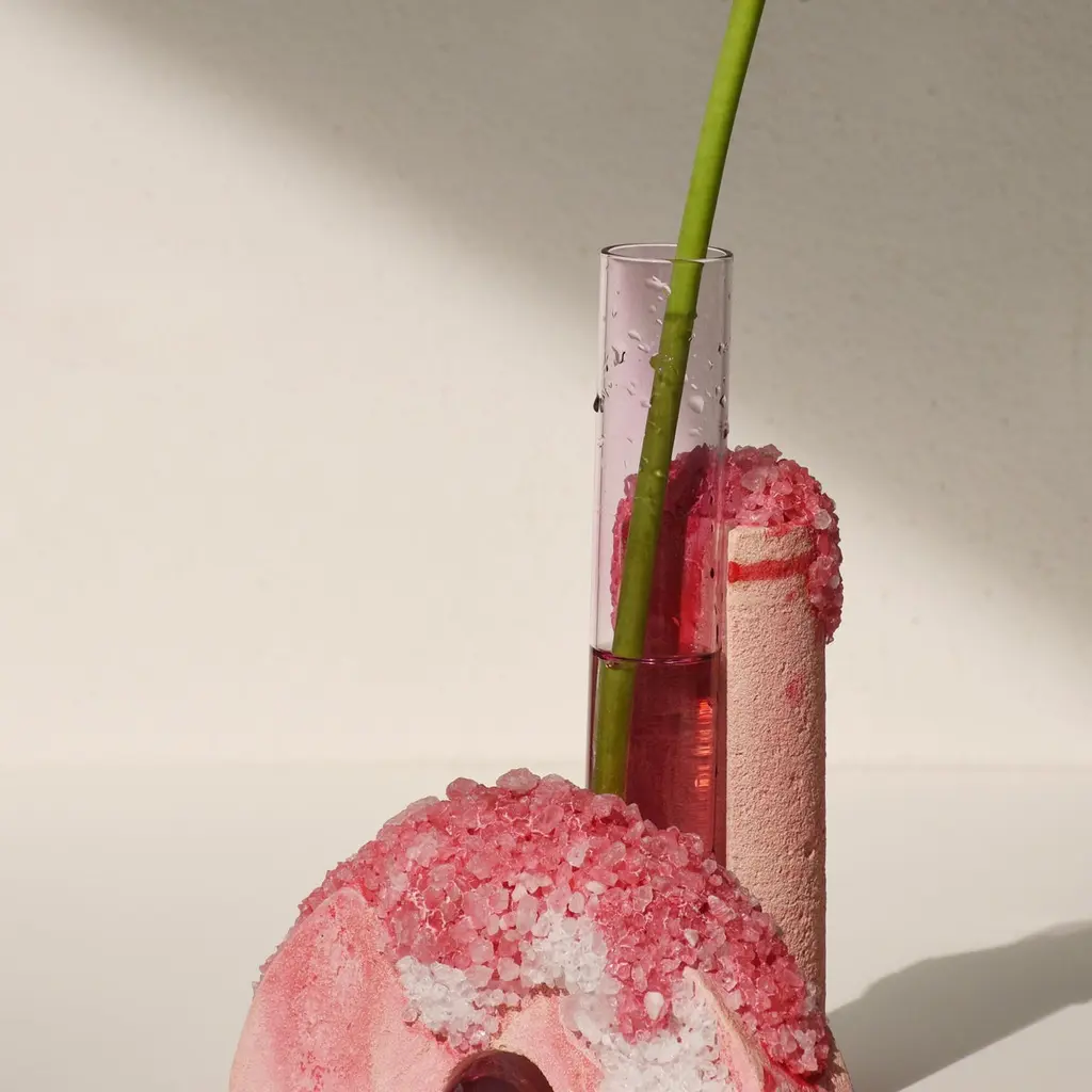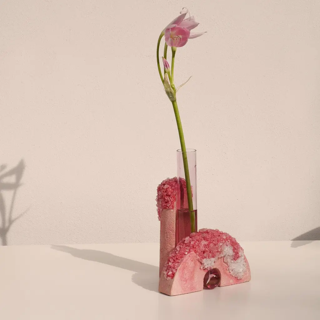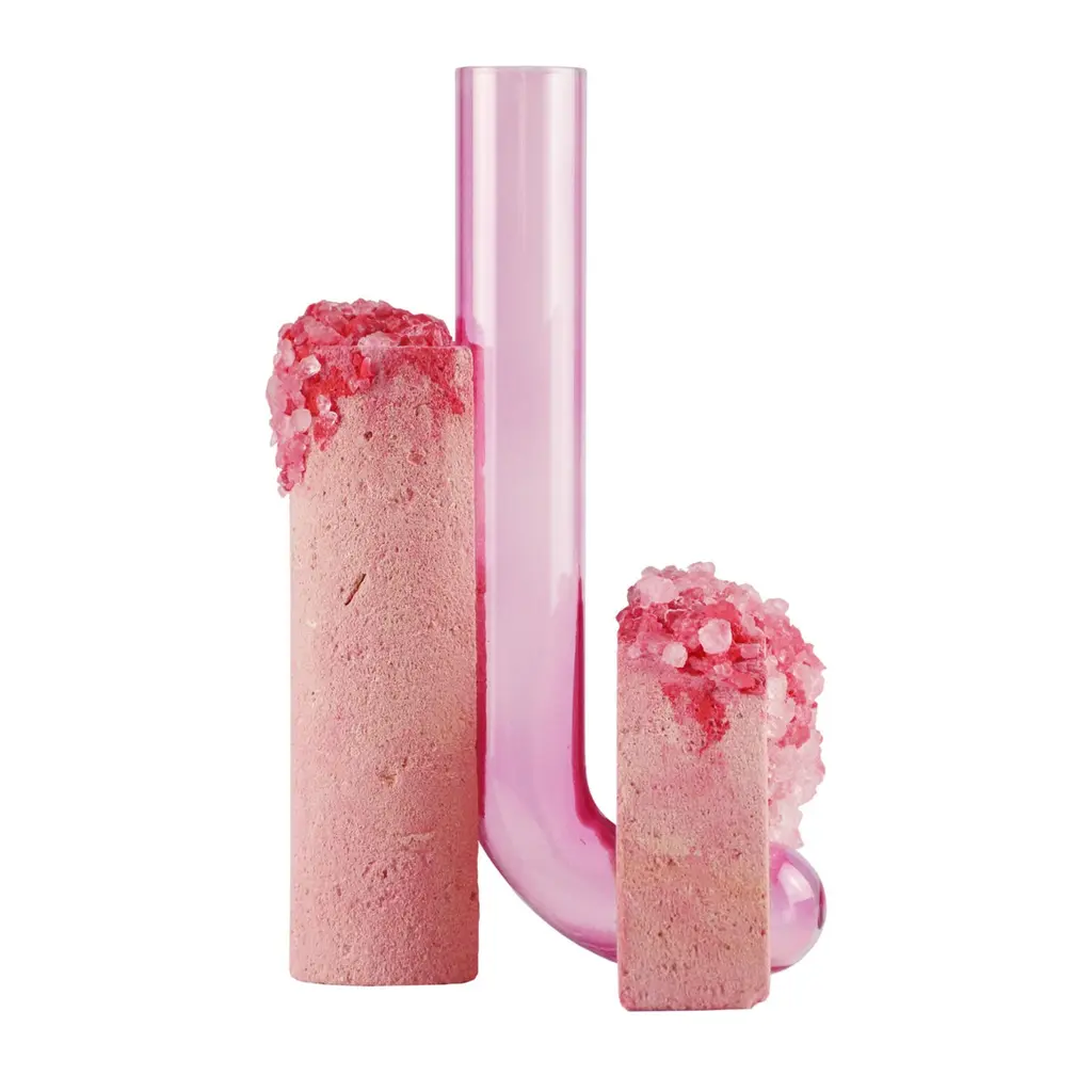 Spring Cochlea della Metamorfosi 1 Seasons Edition Vase by Coki Barbieri.Dimensions: W 18,5 x D 15 x H 24 cm.Materials: Handcrafted stone made with Matera stone fragments, sedimentary rocks of the Italian Apennines and pure water, Italian rock salt crystals, pink mineral pigments from Italian soils, pink painted borosilicate glass.Cochlea della Metamorfosi 1 - SEASONS EDITION - SummerEmbellished with Italian rock salt crystals colored with natural pigments from the Italian subsoil, this vase from the Cochlea collection (inspired by the metamorphosis of snails) represents architecture and nature united together: curved and geometric shapes resulting from glass and sustainable stone.Like all COKI products, it is entirely made in Italy with raw materials processed according to the highest standards of recovery of virgin stones and using only substances that are not harmful to humans and the environment, without components of animal origin.The particular technique Glaciazione makes it possible to unite crystals and the handcrafted stone created from fragments of historical stones found in Matera (Città dei Sassi, UNESCO World Heritage, European Capital of Culture) and sedimentary rocks of the Italian Apennines, recovered and reprocessed following a sustainable production cycle. This material research is originalfrom the COKI studio and uses a natural chemical and physical adhesion process between the two materials. The result is a composite material, biodegradable in water, so it is recommended not to wet the stone part and always keep it away from sources of humidity.A precious objects collection made in Italy with natural and vegan origin materials, conceived by architectural and product designer Coki Barbieri and created by the local craftsmen to expand a new slow living awareness and surround oneself with a few objects, capable of staying alongside us over time.The climate emergency and increased future anxiety push our work to imagine alternative ways of living, producing, and consuming. For that Coki Barbieri uses notions of geology, chemistry, and design culture to create new products (and materials) from fragments and waste from natural products (such as stone and minerals).Coki Barbieri established her eponymous studio-workshop in Rimini in 2017, bringing to life a sustainable way of conceiving the product design for home. Nature inspires her environmentally conscious creations, which are imbued with emotional energy while maintaining their aesthetic impact and practical functionality. Coki collaborates with talented Italian craftsmen to produce one-of-a-kind homeware objects capable of unlocking new synergies between concepts, materials, and use.