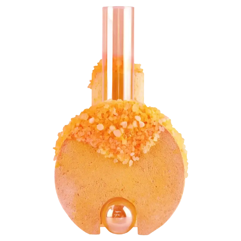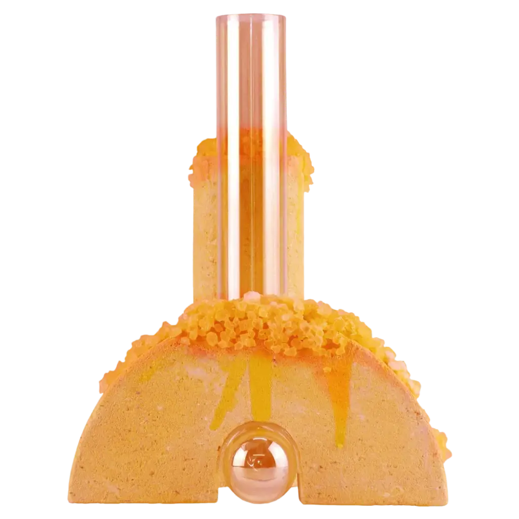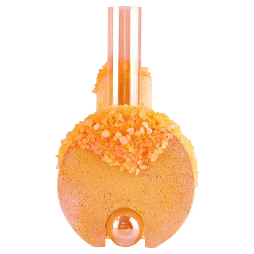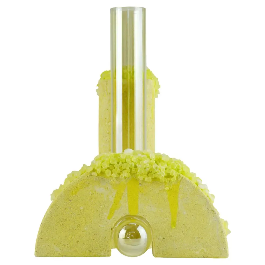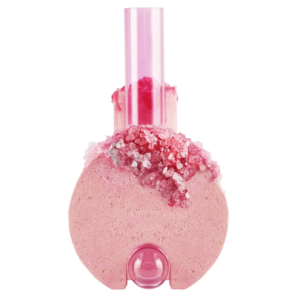 Spring Cochlea della Metamorfosi 1 Seasons Edition Vase by Coki Barbieri.Dimensions: W 18,5 x D 15 x H 24 cm.Materials: Handcrafted stone made with Matera stone fragments, sedimentary rocks of the Italian Apennines and pure water, Italian rock salt crystals, pink mineral pigments from Italian soils, pink painted borosilicate glass.Cochlea della Metamorfosi 1 - SEASONS EDITION - SummerEmbellished with Italian rock salt crystals colored with natural pigments from the Italian subsoil, this vase from the Cochlea collection (inspired by the metamorphosis of snails) represents architecture and nature united together: curved and geometric shapes resulting from glass and sustainable stone.Like all COKI products, it is entirely made in Italy with raw materials processed according to the highest standards of recovery of virgin stones and using only substances that are not harmful to humans and the environment, without components of animal origin.The particular technique Glaciazione makes it possible to unite crystals and the handcrafted stone created from fragments of historical stones found in Matera (Città dei Sassi, UNESCO World Heritage, European Capital of Culture) and sedimentary rocks of the Italian Apennines, recovered and reprocessed following a sustainable production cycle. This material research is originalfrom the COKI studio and uses a natural chemical and physical adhesion process between the two materials. The result is a composite material, biodegradable in water, so it is recommended not to wet the stone part and always keep it away from sources of humidity.A precious objects collection made in Italy with natural and vegan origin materials, conceived by architectural and product designer Coki Barbieri and created by the local craftsmen to expand a new slow living awareness and surround oneself with a few objects, capable of staying alongside us over time.The climate emergency and increased future anxiety push our work to imagine alternative ways of living, producing, and consuming. For that Coki Barbieri uses notions of geology, chemistry, and design culture to create new products (and materials) from fragments and waste from natural products (such as stone and minerals).Coki Barbieri established her eponymous studio-workshop in Rimini in 2017, bringing to life a sustainable way of conceiving the product design for home. Nature inspires her environmentally conscious creations, which are imbued with emotional energy while maintaining their aesthetic impact and practical functionality. Coki collaborates with talented Italian craftsmen to produce one-of-a-kind homeware objects capable of unlocking new synergies between concepts, materials, and use.