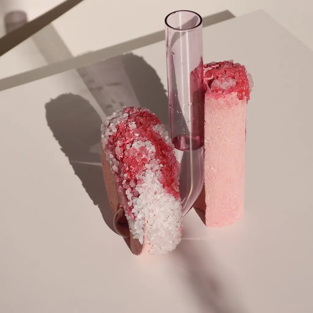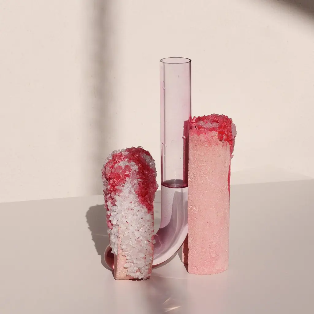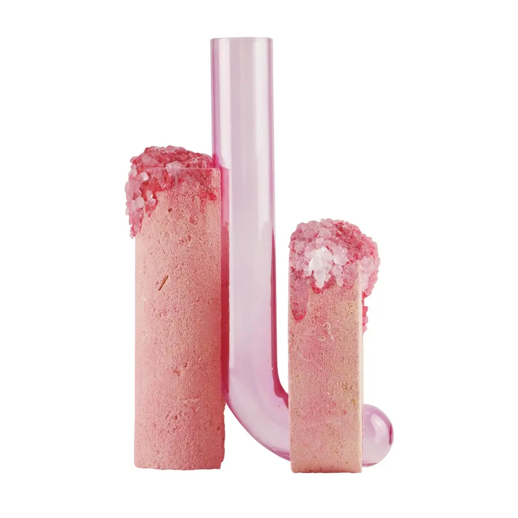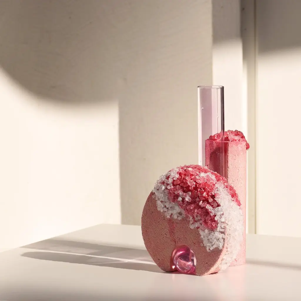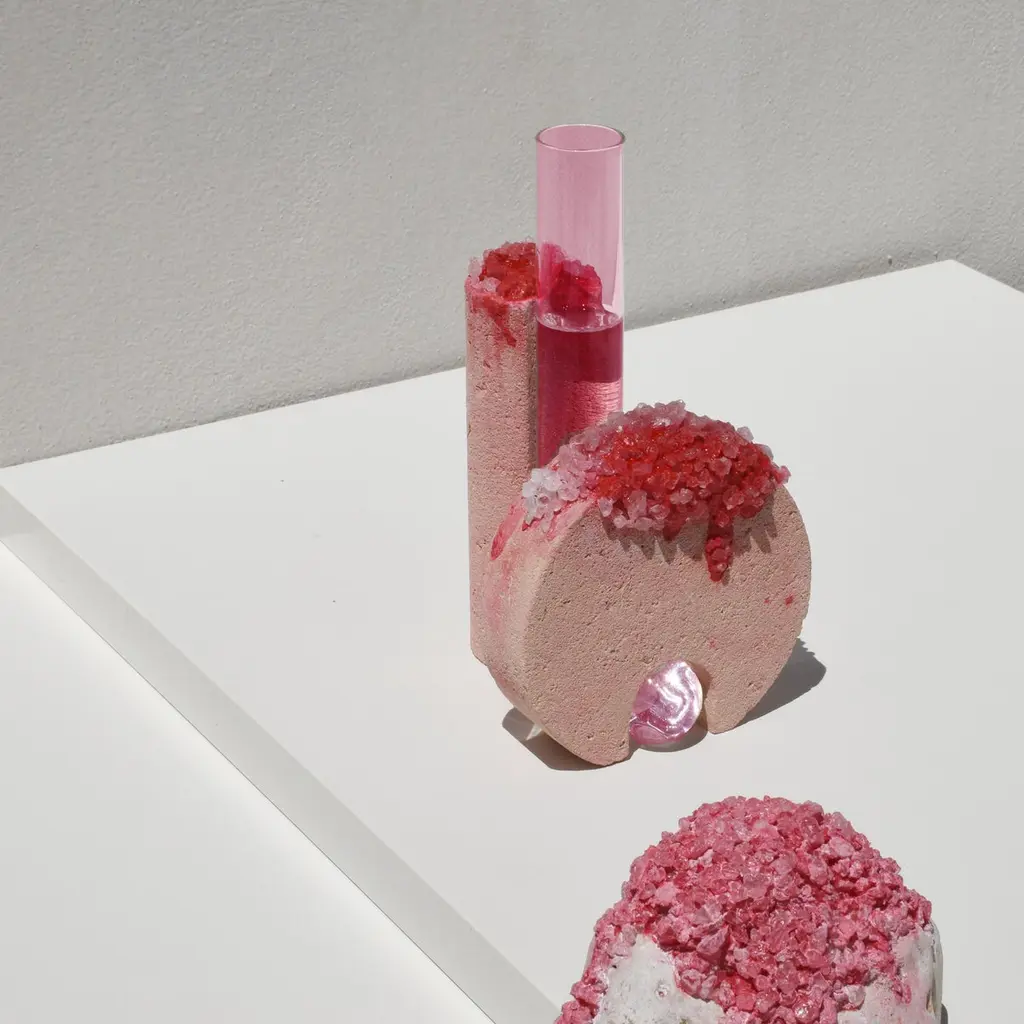 Spring Cochlea della Metamorfosi 2 seasons edition vase by Coki BarbieriDimensions: W 14 x D 15 x H 24 cm.Materials: handcrafted stone made with Matera stone fragments, sedimentary rocks of the Italian Apennines and pure water, Italian rock salt crystals, pink mineral pigments from Italian soils, pink painted borosilicate glass.Cochlea della Metamorfosi 2 - SEASONS EDITION - Spring.Embellished with Italian rock salt crystals colored with natural pigments from the Italian subsoil, this vase from the Cochlea collection (inspired by the metamorphosis of snails) represents architecture and nature united together: curved and geometric shapes resulting from glass and sustainable stone.Like all COKI products, it is entirely made in Italy with raw materials processed according to the highest standards of recovery of virgin stones and using only substances that are not harmful to humans and the environment, without components of animal origin.The particular technique Glaciazione makes it possible to unite crystals and the handcrafted stone created from fragments of historical stones found in Matera (Città dei Sassi, UNESCO World Heritage, European Capital of Culture) and sedimentary rocks of the Italian Apennines, recovered and reprocessed following a sustainable production cycle. This material research is originalfrom the COKI studio and uses a natural chemical and physical adhesion process between the two materials. The result is a composite material, biodegradable in water, so it is recommended not to wet the stone part and always keep it away from sources of humidity.A precious objects collection made in Italy with natural and vegan origin materials, conceived by architectural and product designer Coki Barbieri and created by the local craftsmen to expand a new slow living awareness and surround oneself with a few objects, capable of staying alongside us over time.The climate emergency and increased future anxiety push our work to imagine alternative ways of living, producing, and consuming. For that Coki Barbieri uses notions of geology, chemistry, and design culture to create new products (and materials) from fragments and waste from natural products (such as stone and minerals).Coki Barbieri established her eponymous studio-workshop in Rimini in 2017, bringing to life a sustainable way of conceiving the product design for home. Nature inspires her environmentally conscious creations, which are imbued with emotional energy while maintaining their aesthetic impact and practical functionality. Coki collaborates with talented Italian craftsmen to produce one-of-a-kind homeware objects capable of unlocking new synergies between concepts, materials, and use.