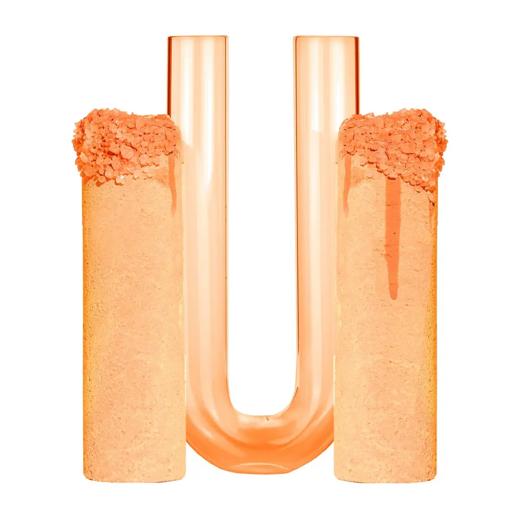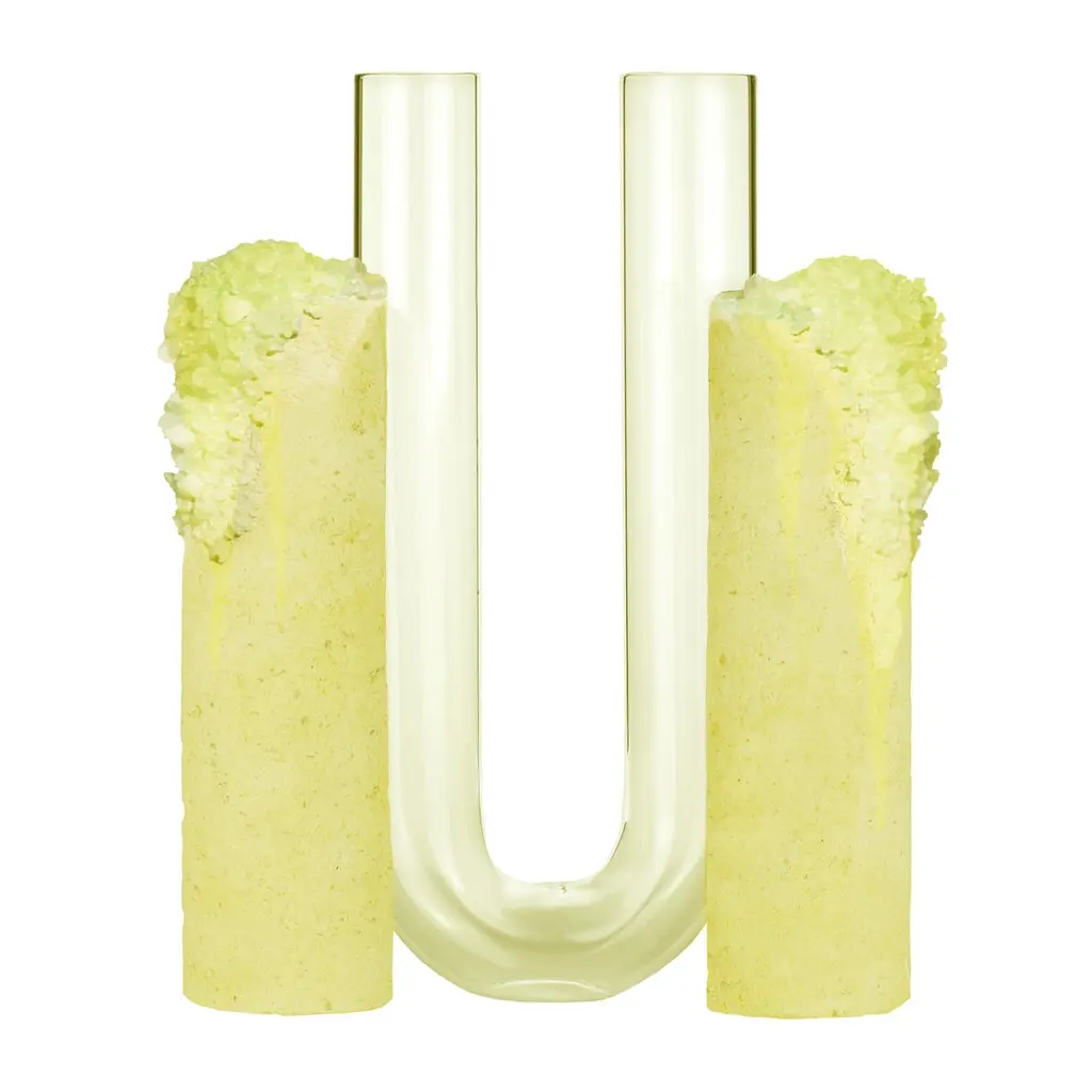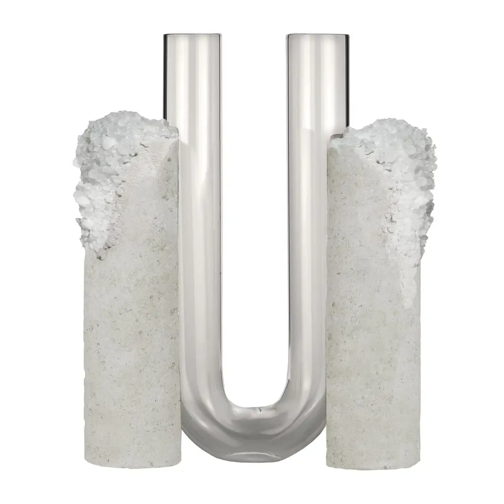 Spring Cochlea dello Sviluppo seasons edition vase by Coki Barbieri.Dimensions: W 24 x D 8 x H 30 cm.Materials: Handcrafted stone made with Matera stone fragments, sedimentary rocks of the Italian Apennines and pure water, Italian rock salt crystals, pink mineral pigments from Italian soils, pink painted borosilicate glass.Cochlea dello Sviluppo - SEASONS EDITION - SpringEmbellished with Italian rock salt crystals colored with natural pigments from the Italian subsoil, this vase from the Cochlea collection (inspired by the metamorphosis of snails) represents architecture and nature united together: curved and geometric shapes resulting from glass and sustainable stone.Like all COKI products, it is entirely made in Italy with raw materials processed according to the highest standards of recovery of virgin stones and using only substances that are not harmful to humans and the environment, without components of animal origin.The particular technique Glaciazione makes it possible to unite crystals and the handcrafted stone created from fragments of historical stones found in Matera (Città dei Sassi, UNESCO World Heritage, European Capital of Culture) and sedimentary rocks of the Italian Apennines, recovered and reprocessed following a sustainable production cycle. This material research is originalfrom the COKI studio and uses a natural chemical and physical adhesion process between the two materials. The result is a composite material, biodegradable in water, so it is recommended not to wet the stone part and always keep it away from sources of humidity.Coki Barbieri established her eponymous studio-workshop in Rimini in 2017, bringing to life a sustainable way of conceiving the product design for home. Nature inspires her environmentally conscious creations, which are imbued with emotional energy while maintaining their aesthetic impact and practical functionality. Coki collaborates with talented Italian craftsmen to produce one-of-a-kind homeware objects capable of unlocking new synergies between concepts, materials, and use.