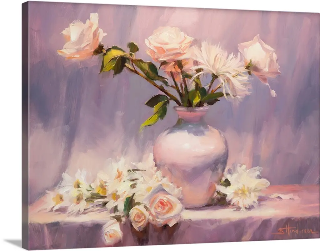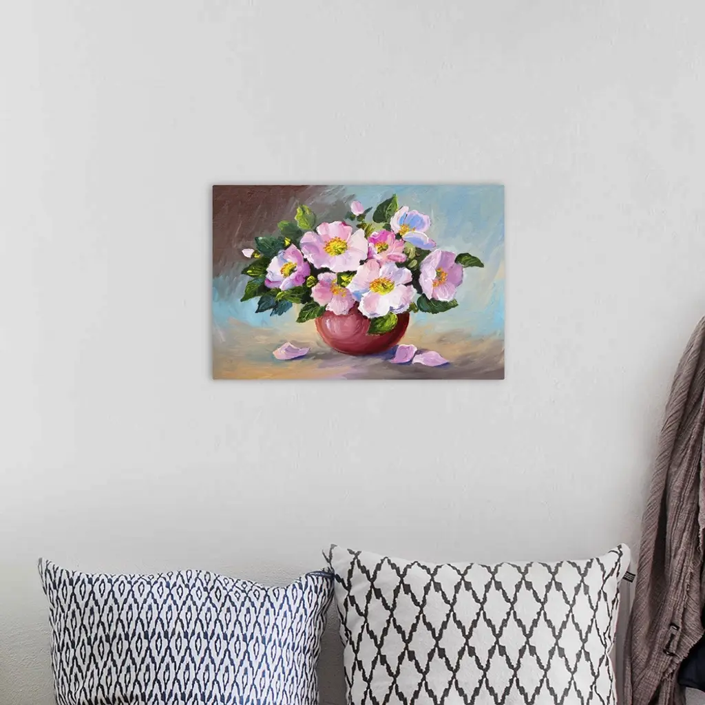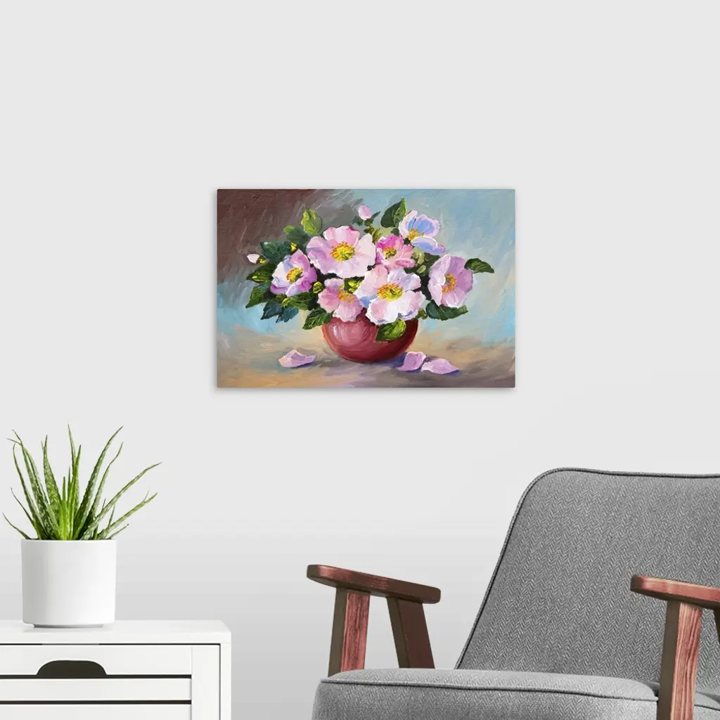 Originally an oil painting of spring pink wild roses in a vase on canvas.