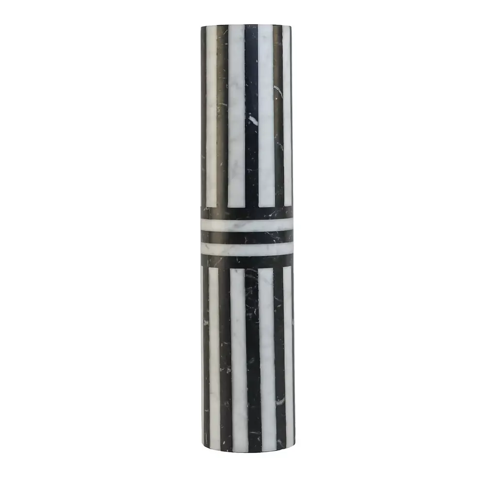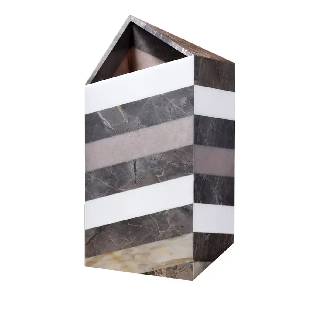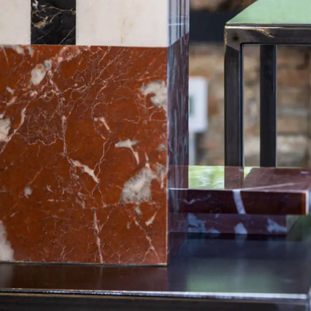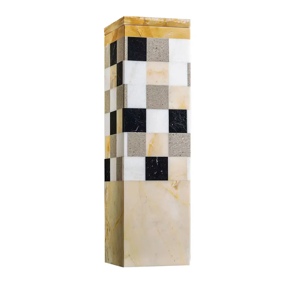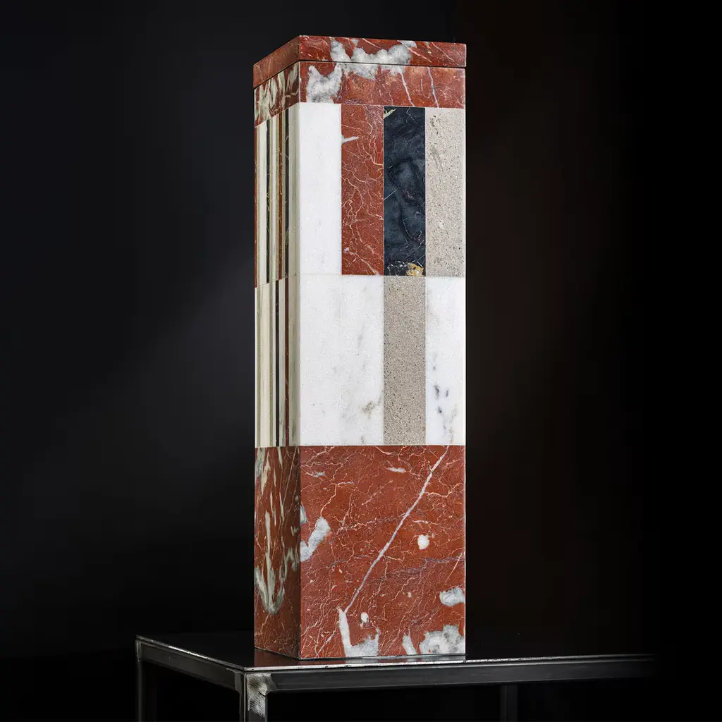 The Square A Vase is a striking piece crafted from exquisite red marble, along with a harmonious blend of other premium stones, designed by Luciano Setten. Each element of the vase has been meticulously crafted, featuring a base, body, and square lid that cohesively unite to create the impression of a singular, elegant block of material. The use of Rosso Francia, Bianco Cristallino Venato, Nero Portoro, and Aurisina marbles, all polished to perfection, enhances the visual appeal and tactile texture. This systematic assembly ensures a continuous, circular perception that captivates the eye. An epoxy adhesive secures the marble to a sturdy metal or PMMA core. Due to the natural characteristics of the marble, slight variations in color and pattern may occur, ensuring that each piece is truly unique.