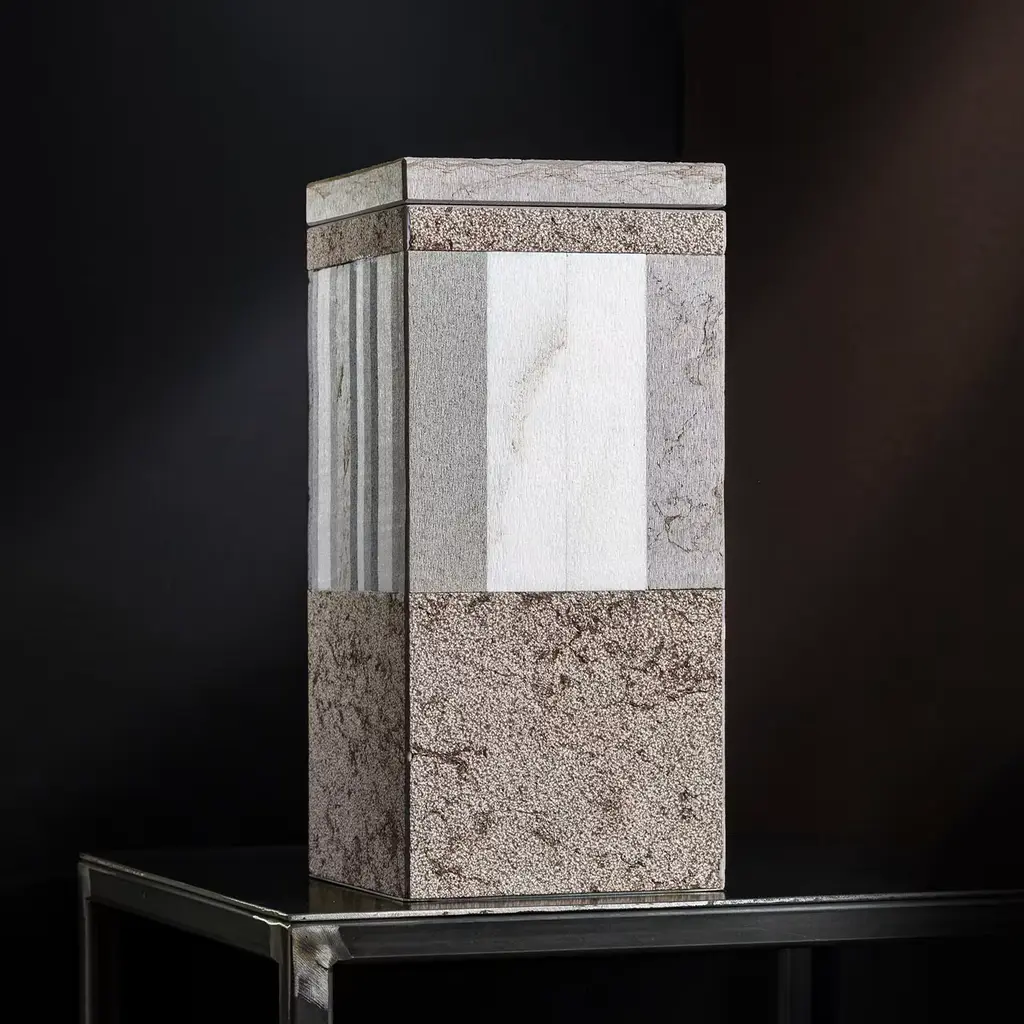 Square B Vase is a stunning piece crafted with meticulous attention to detail. Designed by Luciano Setten, this decorative vase exemplifies a bold geometric aesthetic, showcasing a rectangular form that seamlessly integrates various natural marbles. The base, body, and lid are composed of Castellavazzo bocciardato marble, beautifully complemented by accents of Basaltina, Aurisina, and Bianco Lasa, creating a harmonious blend of textures and colors. Once the pieces are tailored, they are systematically arranged to ensure a cohesive flow, resembling a continuous block of material. The square lid serves as a functional element, effectively sealing the vase while providing an artistic flair, perfect for contemporary or classic decor.