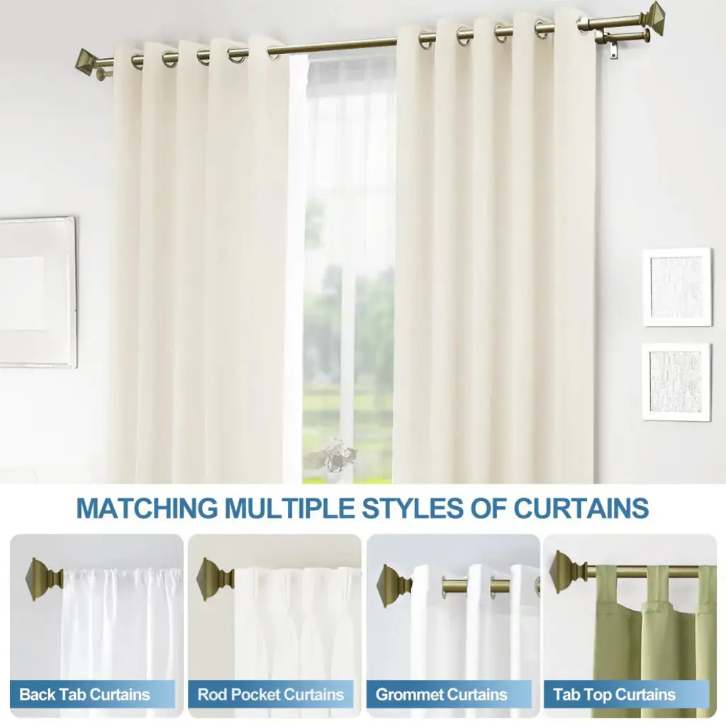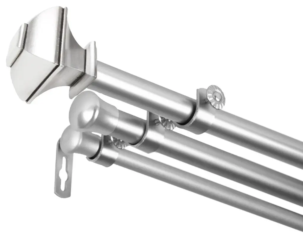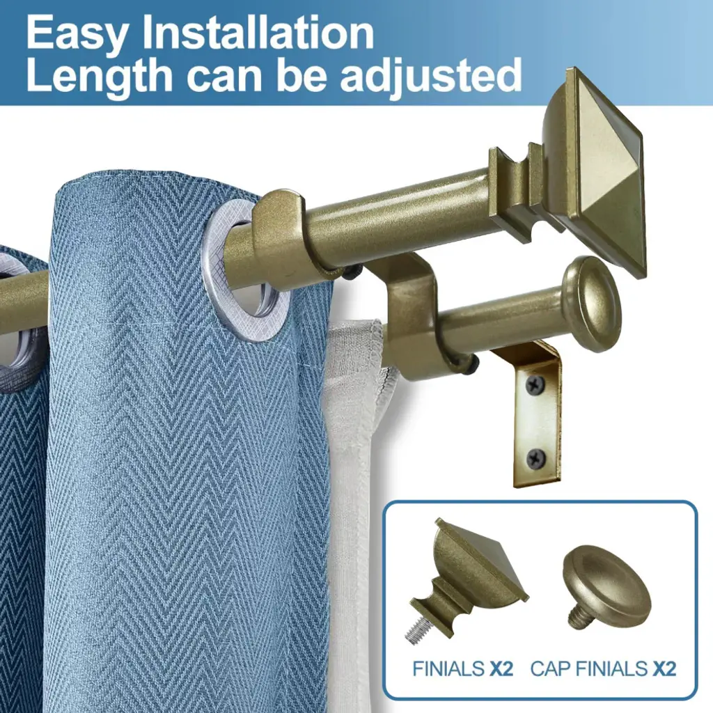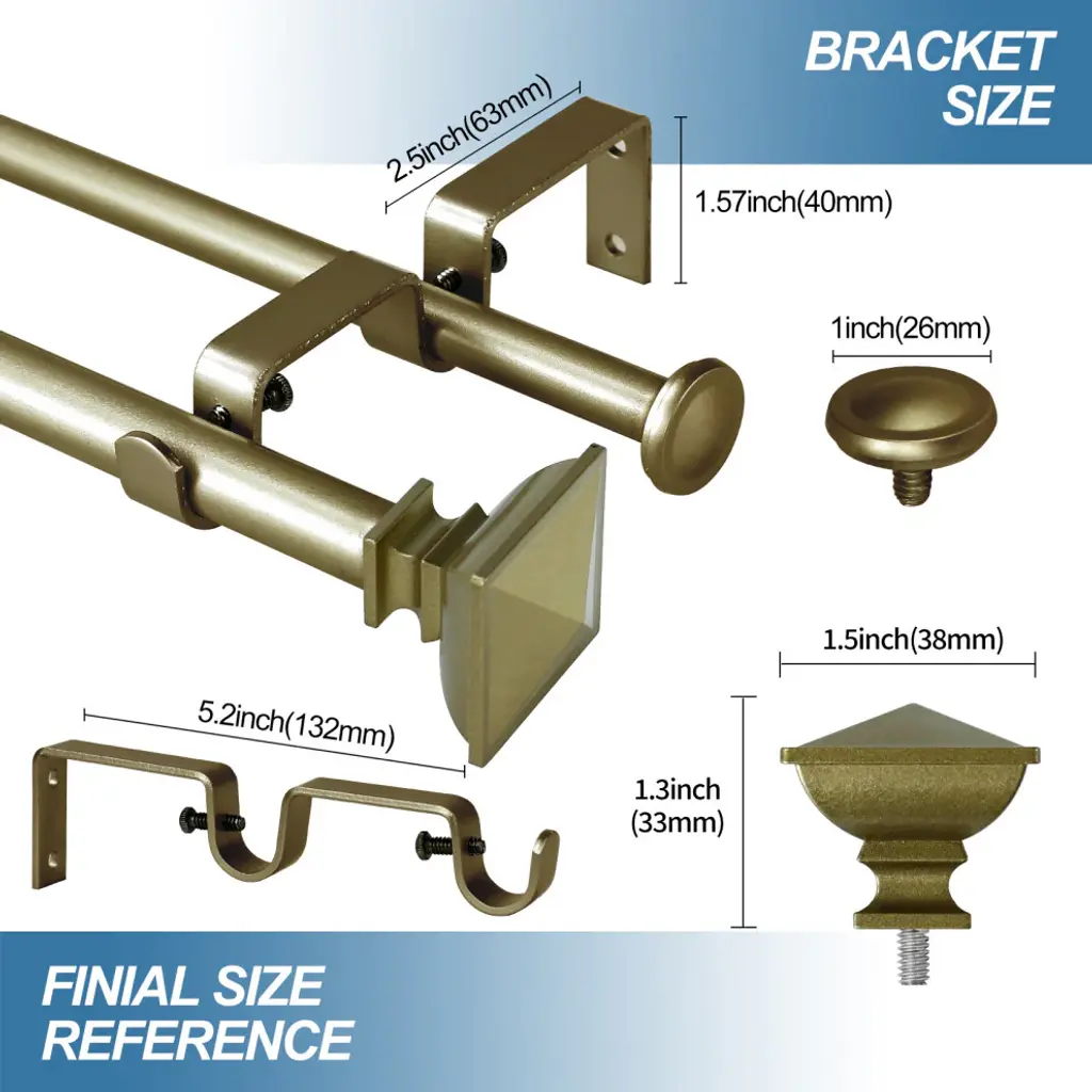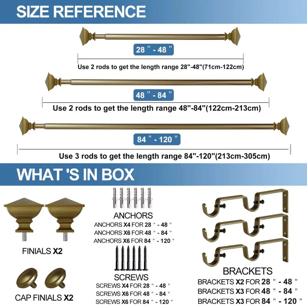 The rod set includes 2 rods, 2 sets of two finials, and double brackets in an antique gold finishThe front adjustable curtain rod measures 5/8" diameter and comes with square urn finials; the back adjustable curtain rod measures 1/2" diameter and comes with flat button shaped finials. Both rods extend from 84" to 120".Three matching double brackets included. All brackets measure 5" long, 2 1/2" to center of first bracket cup, and 5" to center of second bracket cup. 1 1/2" wall mount span.Available in 5 finishes: Black, Glossy White, Bronze, Pewter, and Antique GoldMounting hardware included for easy installation.