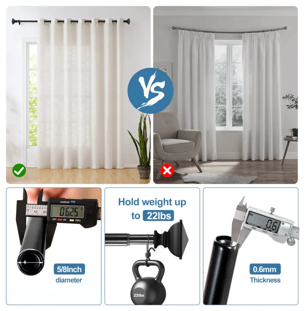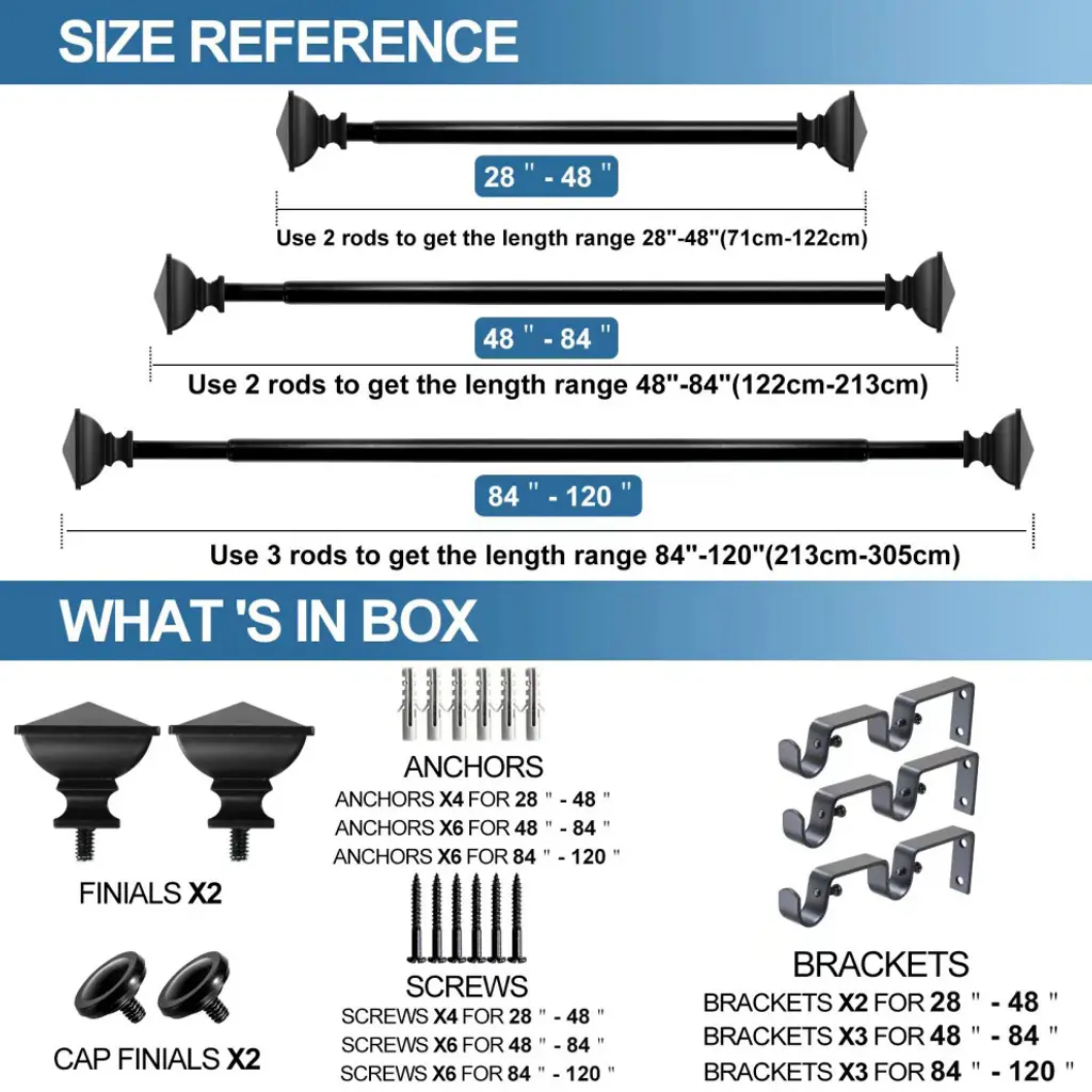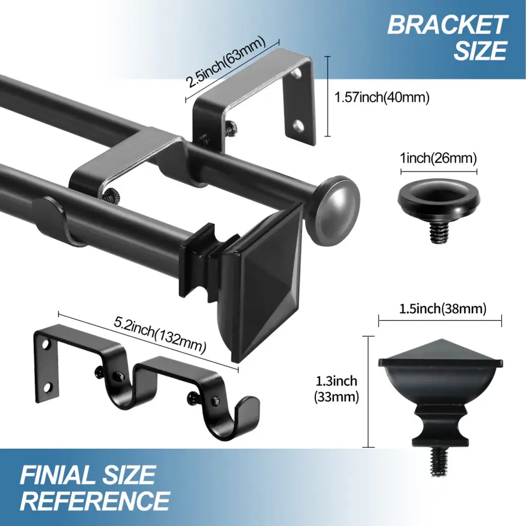 The rod set includes 2 rods, 2 sets of two finials, and double brackets in a black finishThe front adjustable curtain rod measures 5/8" diameter and comes with square urn finials; the back adjustable curtain rod measures 1/2" diameter and comes with flat button shaped finials. Both rods extend from 24" to 48".Two matching double brackets included. Both brackets measure 5" long, 2 1/2" to center of first bracket cup, and 5" to center of second bracket cup. 1 1/2" wall mount span.Available in 5 finishes: Black, Glossy White, Bronze, Pewter, and Antique GoldMounting hardware included for easy installation.