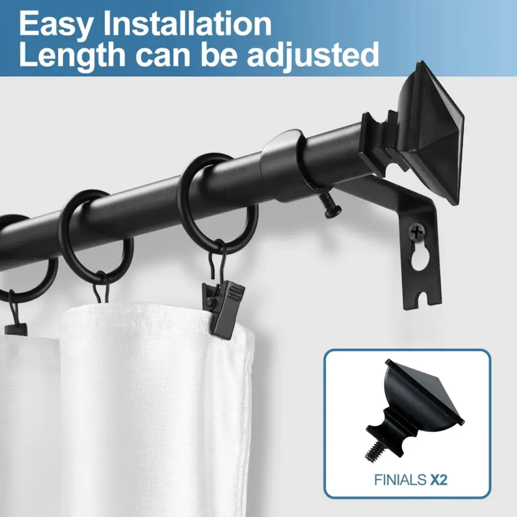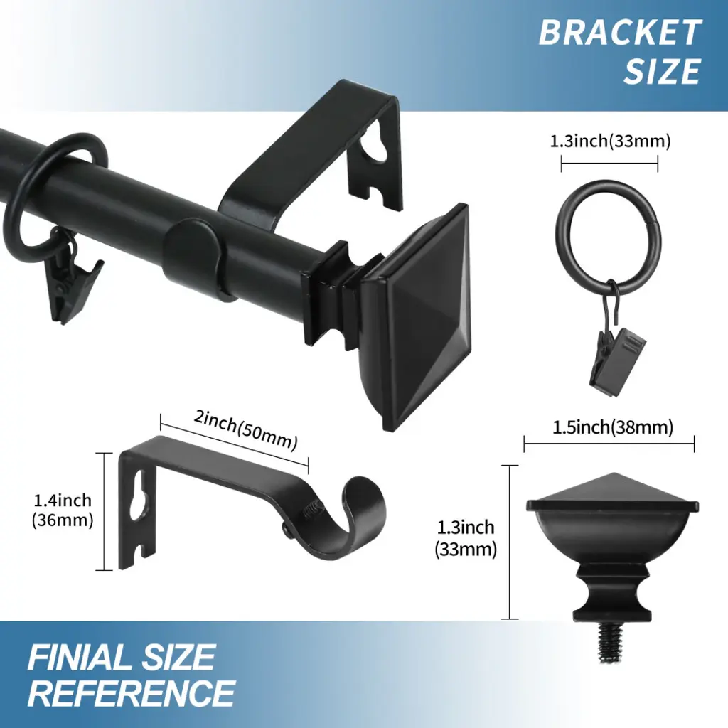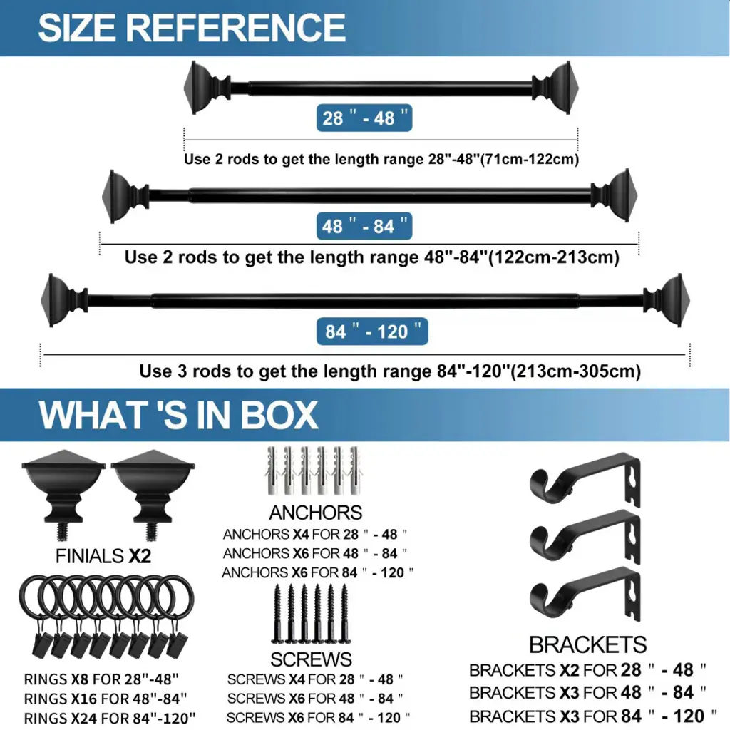 The rod set includes 1 rod, 1 set of two finials, matching curtain rings, and brackets in a black finish.The adjustable curtain rod measures 5/8" diameter and comes with square urn finials. The rod extends from 84" to 120".Three matching brackets included. All brackets measures 3" long, 2 1/2" to center bracket cup; 1 1/2" wall mount span. Includes 24 rings with clips and eyelets.Available in 5 finishes: Black, Glossy White, Bronze, Pewter, and Antique GoldMounting hardware included for easy installation.