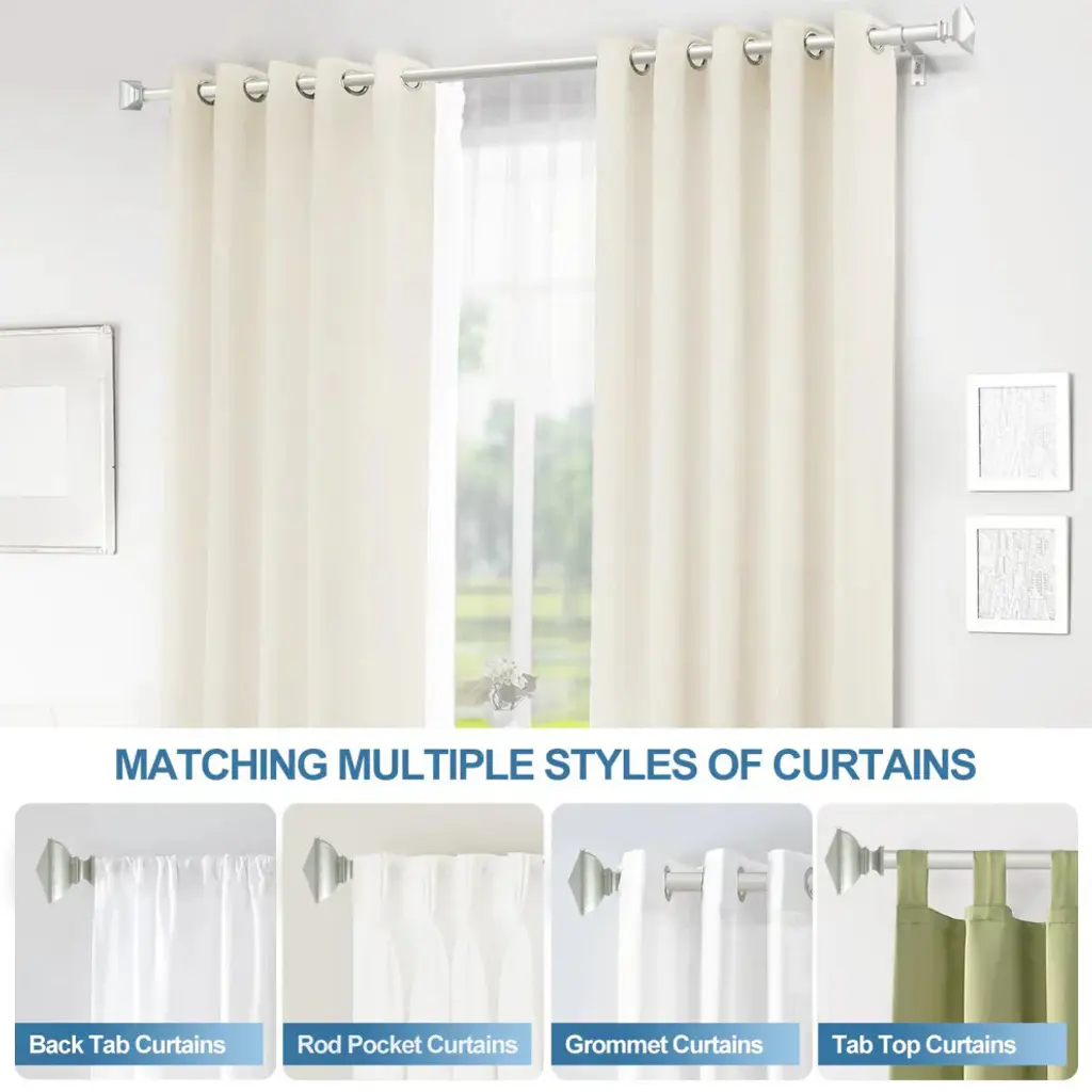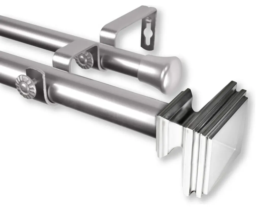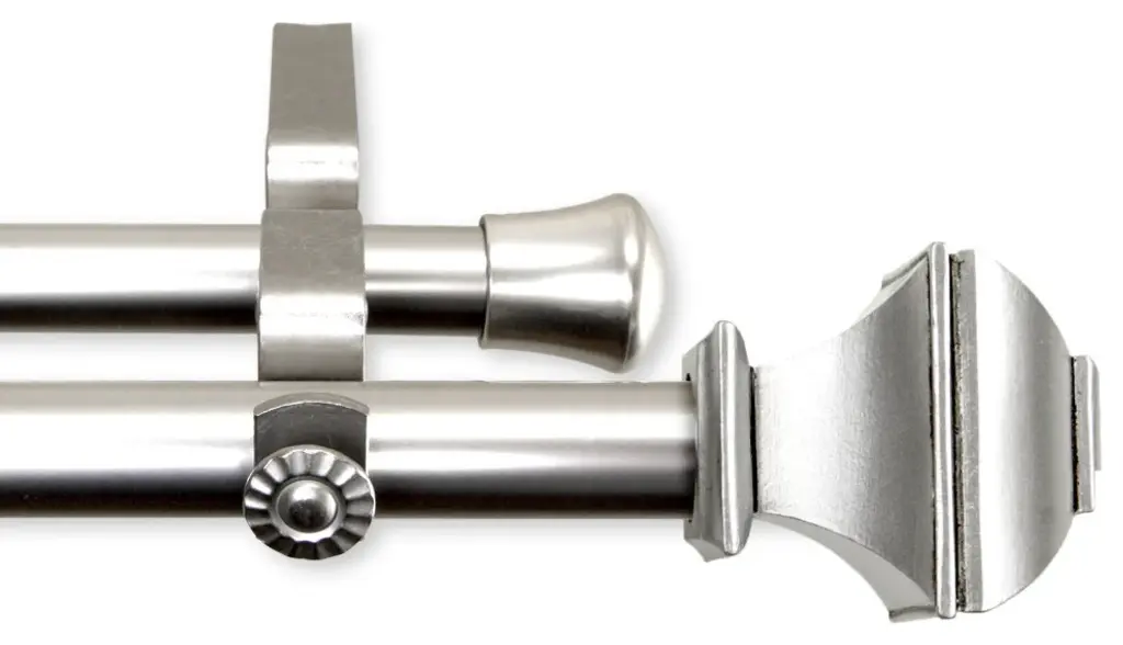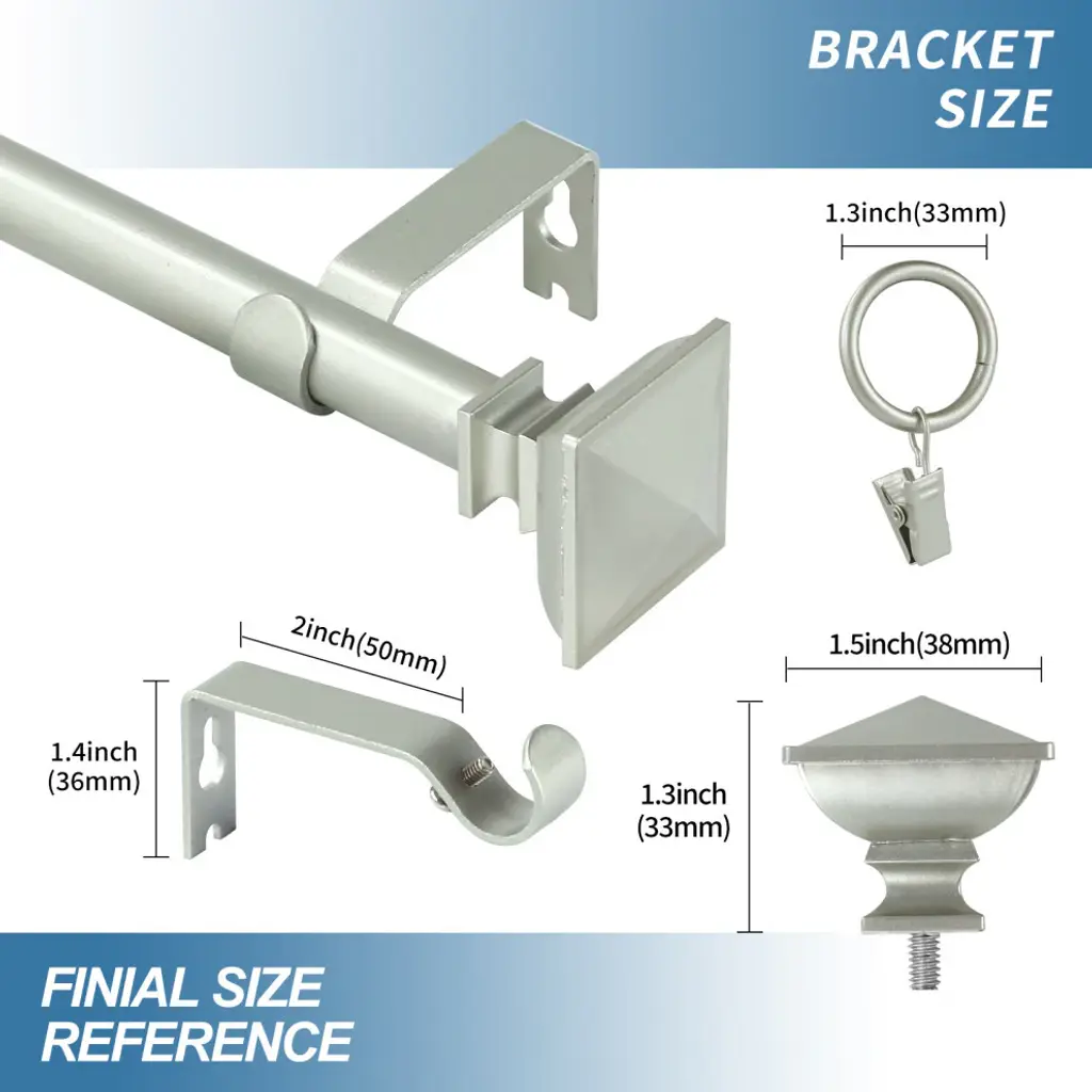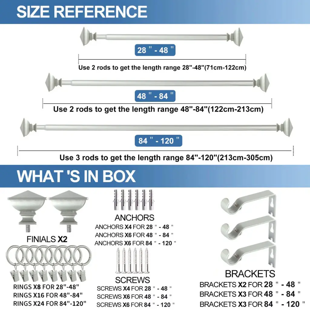 The rod set includes 1 rod, 1 set of two finials, matching curtain rings, and brackets in a pewter finish.The adjustable curtain rod measures 5/8" diameter and comes with square urn finials. The rod extends from 84" to 120".Three matching brackets included. All brackets measures 3" long, 2 1/2" to center bracket cup; 1 1/2" wall mount span. Includes 24 rings with clips and eyelets.Available in 5 finishes: Black, Glossy White, Bronze, Pewter, and Antique GoldMounting hardware included for easy installation.