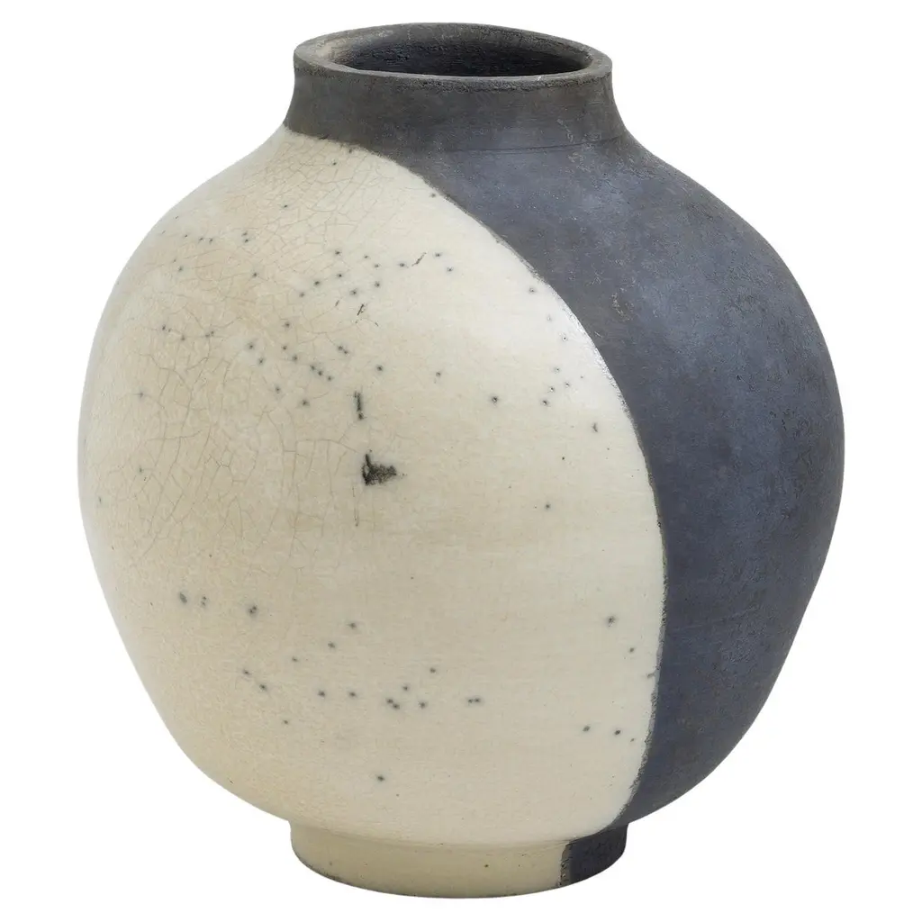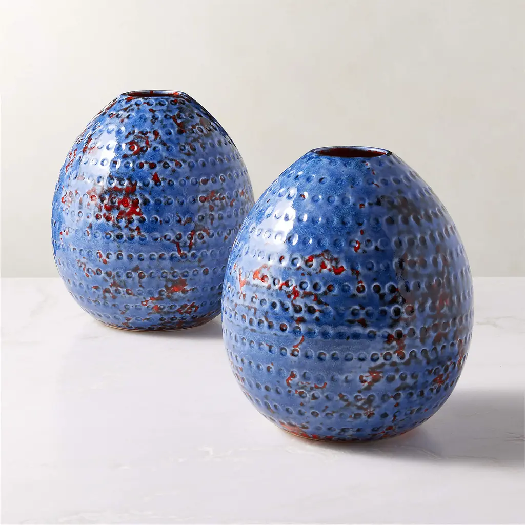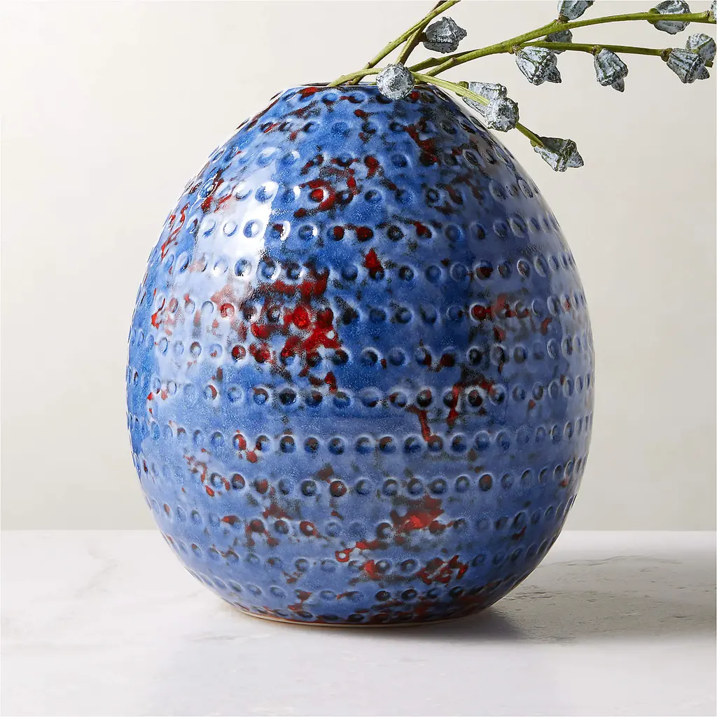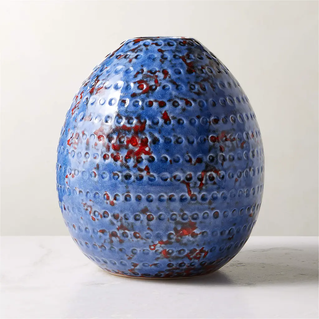 Handcrafted in Portugal, glazed earthenware vase is a striking accent, whether standing alone or displaying dried botanicals. Influenced by German glazing techniques prevalent in midcentury and postmodern designs, the vessel's simple shape gains visual interest from the blue glaze's explosive reaction when fired. Pops of vibrant red from a unique selenium glaze can be seen underneath. CB2 exclusive.