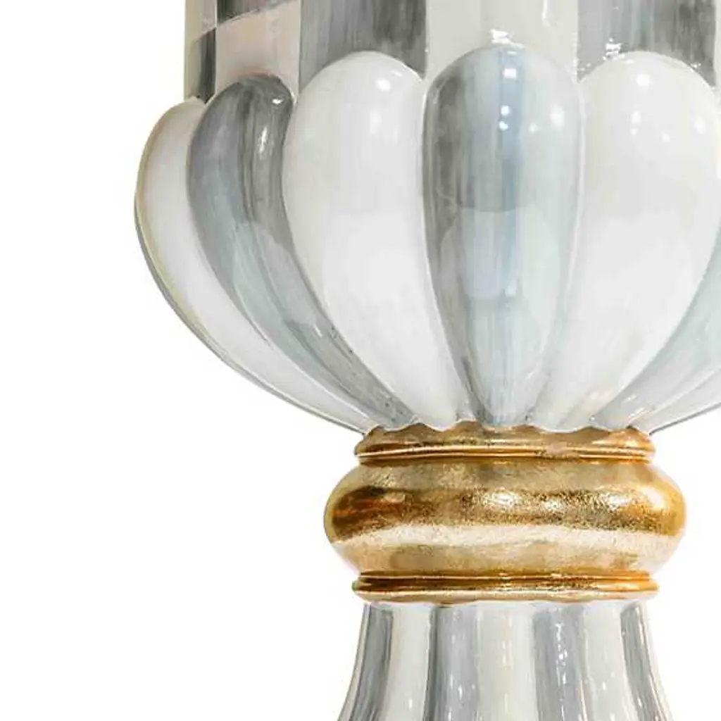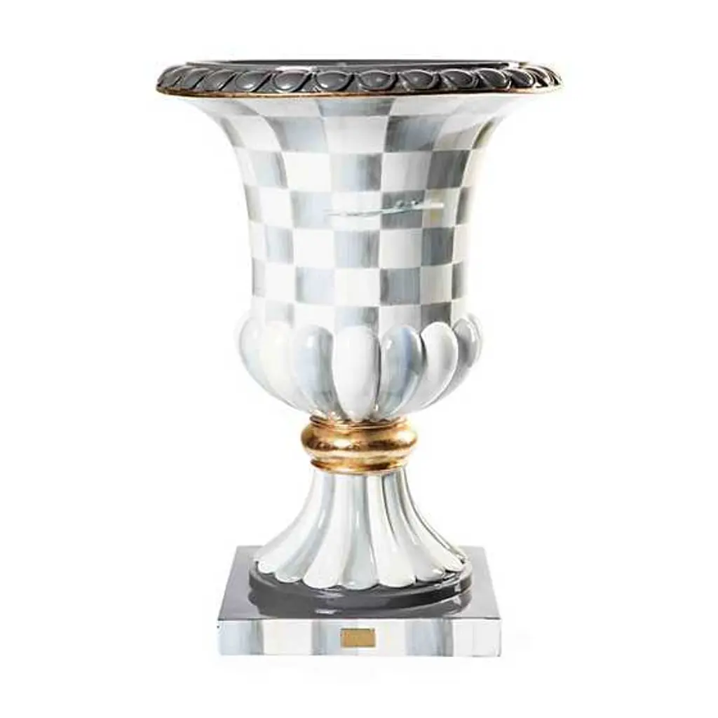 Elevate the presentation of our stacked seasonal accents with the weather-resistant Sterling Check Pedestal Urn. Crafted of durable fiberglass and resin, it's hand-painted with our signature grey and white checks and stripes with golden embellishments. There is a drainage hole in the bottom, so you can add your own plants.