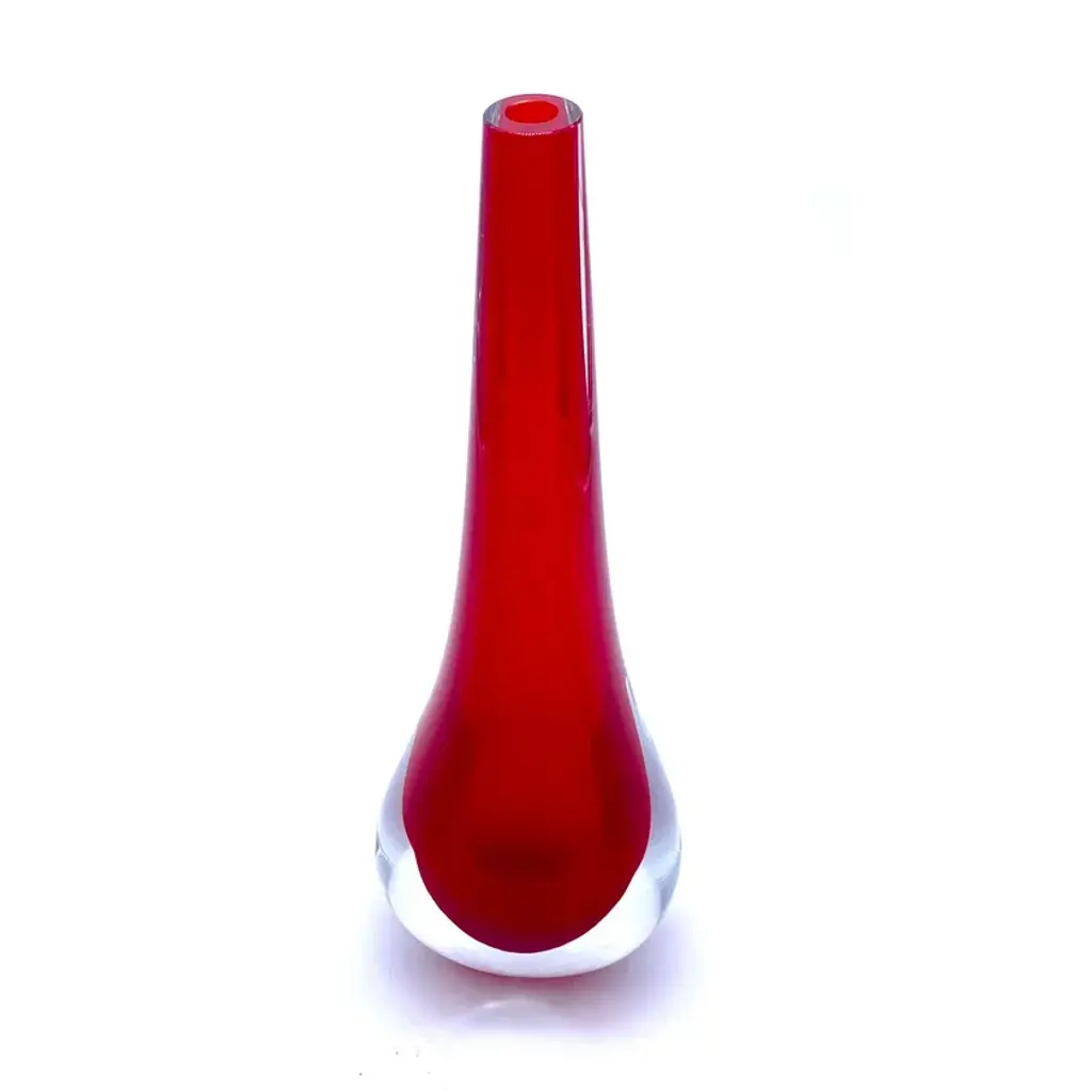 STILLA RED is a murano glass decorative vase, entirely realized by hand in a red color. The elongated and thin shape of this artwork makes it a unique creation to complete any home decor solution with originality and a touch of color.The Drop series is part of our Murano Glass Luxury Vase Collection. Observing them evokes the sensation of a drop of colored glass, dense and textural, smoothly nestled inside transparent glass, creating absolutely unique plays of color and transparency. Stilla is a modern vase ideal for elegantly decorating any room in your home, bringing light and significance to your dining room table or placing it at the center of your living room. All our products are artisanal and of the highest production quality. Non-substantial variations in shape, size, color, and/or minor imperfections are inevitable and are typical of manual glasswork, highlighting the artisanal craftsmanship.