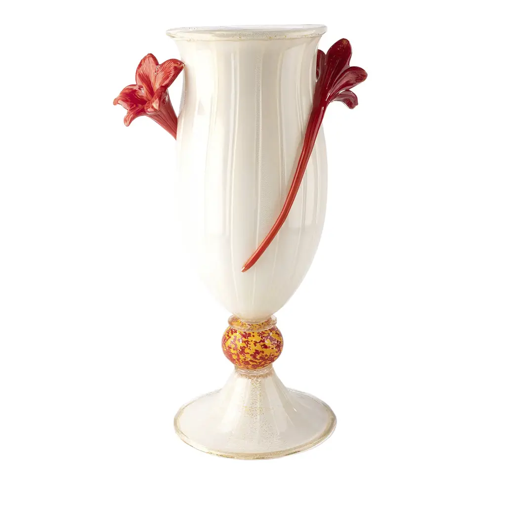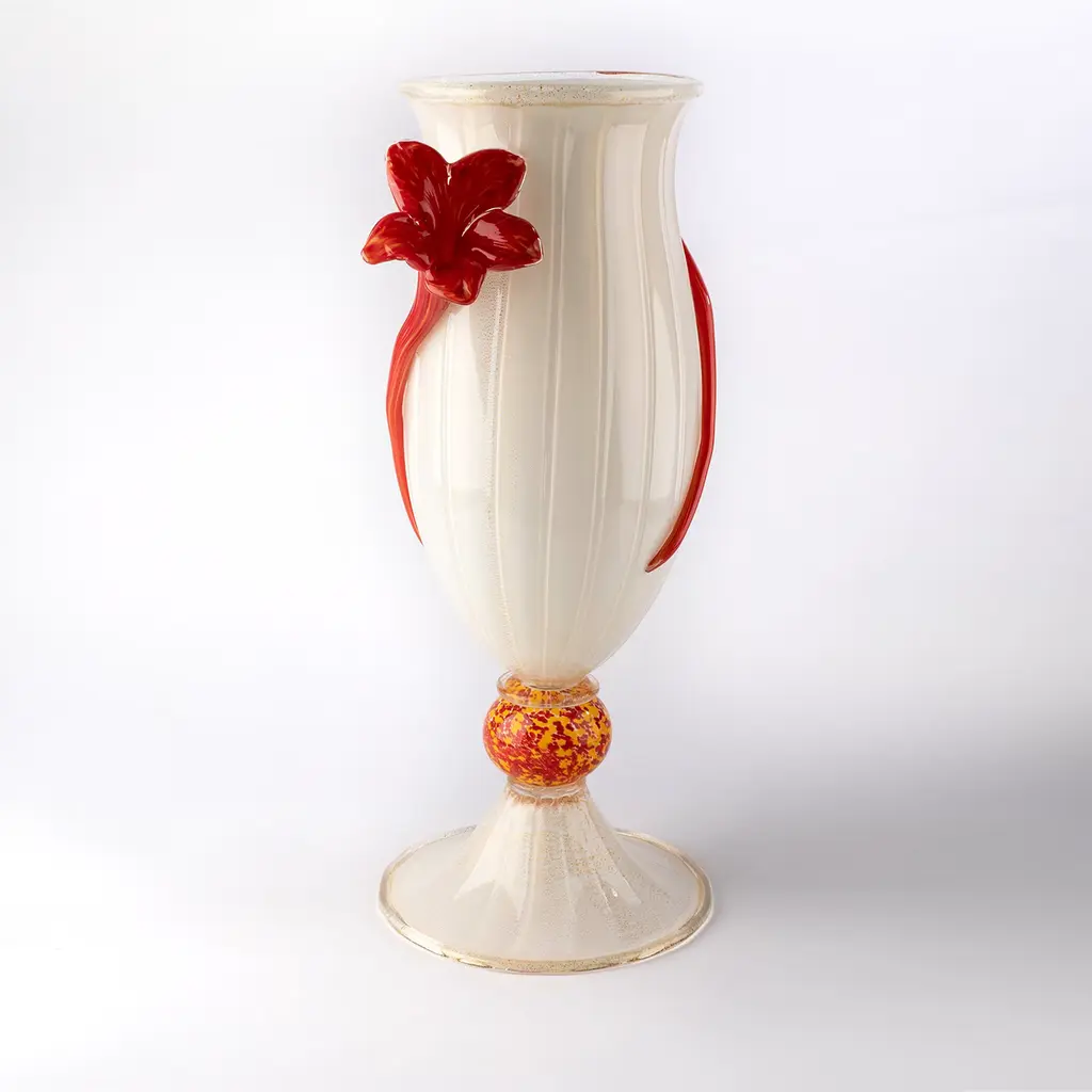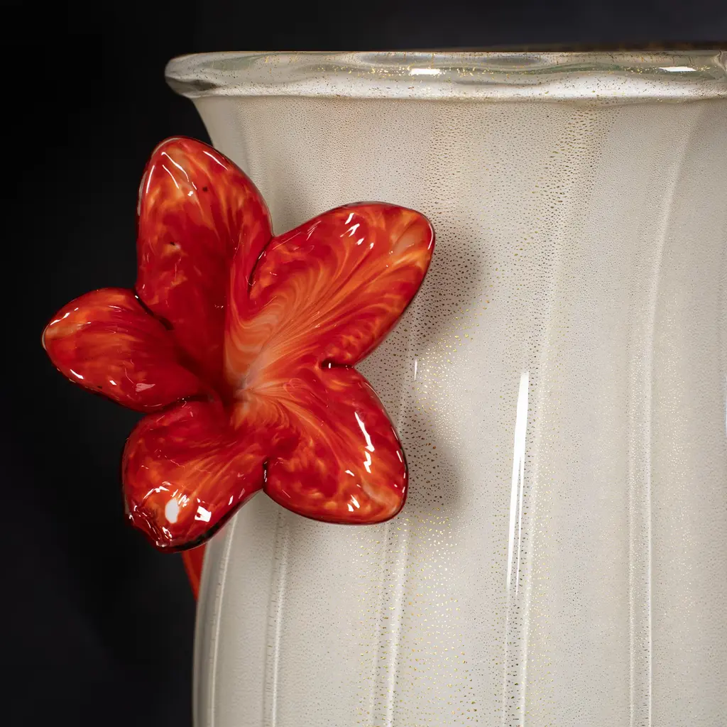 This delightful vase minutely mouth-blown from white Murano glass is distinguished by an artful goblet shape reinvented with a romantic twist given by the graceful red flowers embracing its body. Exquisitely adorned with gentle grooves, its silhouette also incorporates an ovoid volume, standing right onto the flared base, that englobes a myriad of tiny specks in red and yellow for a dynamic color contrast.