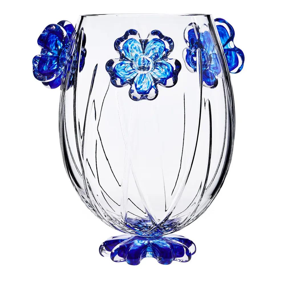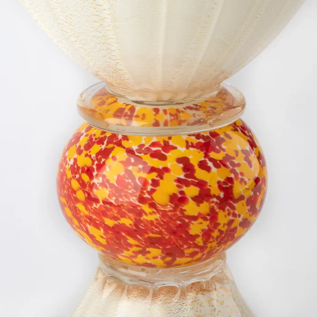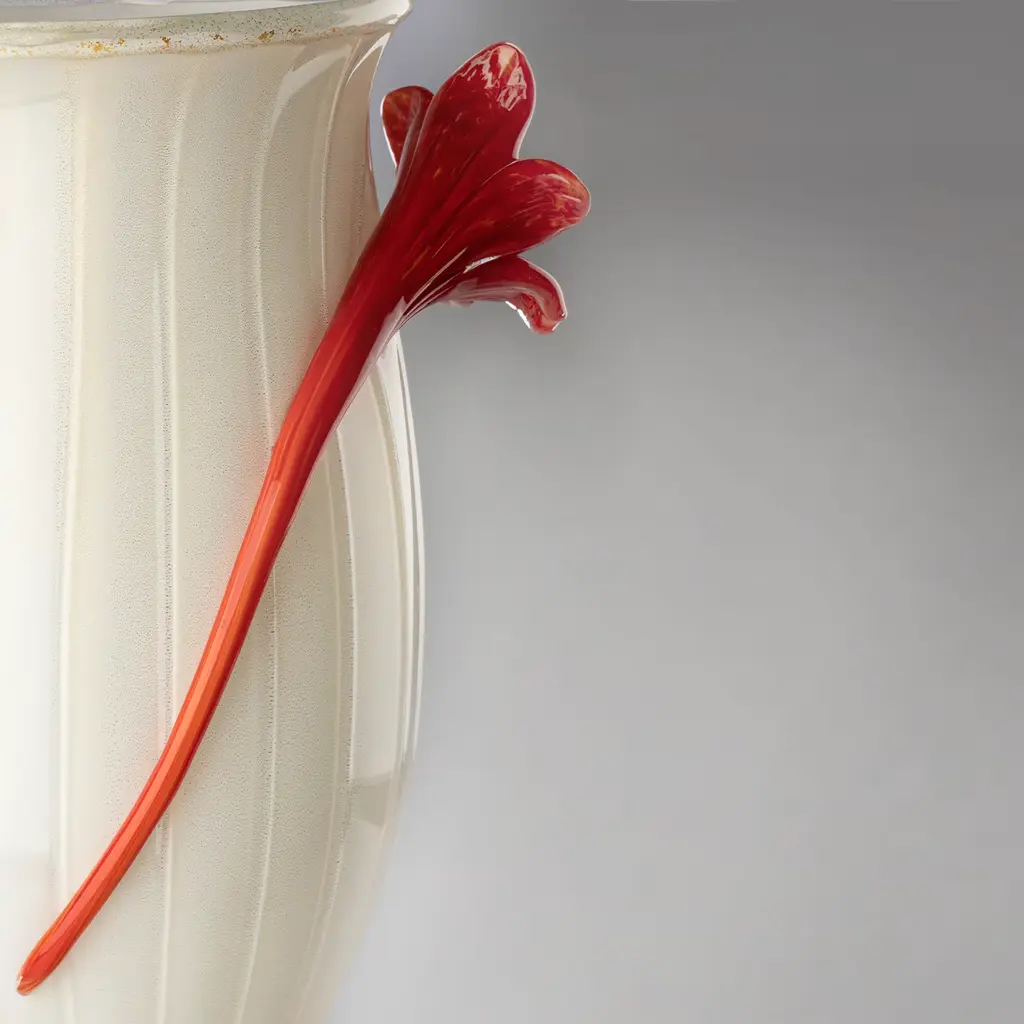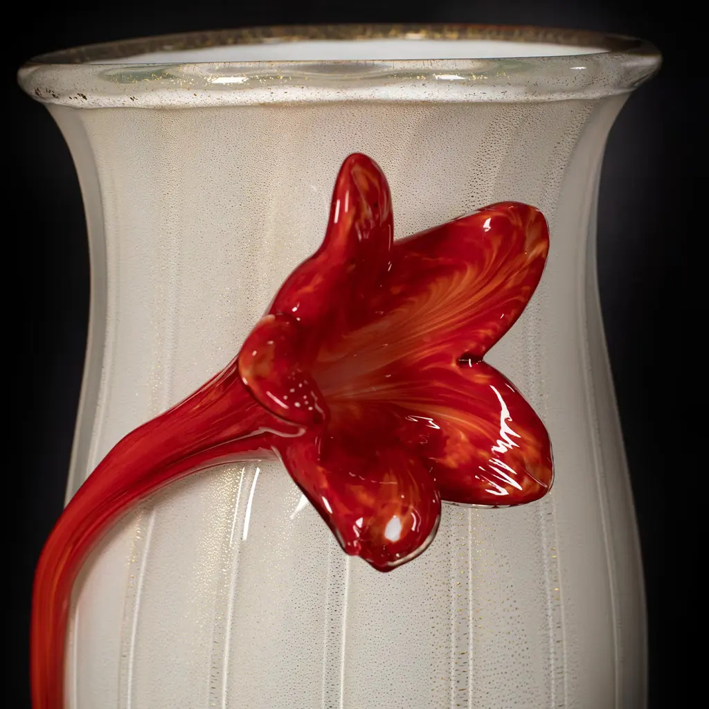 This delightful vase minutely mouth-blown from white Murano glass is distinguished by an artful goblet shape reinvented with a romantic twist given by the graceful red flowers embracing its body. Exquisitely adorned with gentle grooves, its silhouette also incorporates an ovoid volume, standing right onto the flared base, that englobes a myriad of tiny specks in red and yellow for a dynamic color contrast.