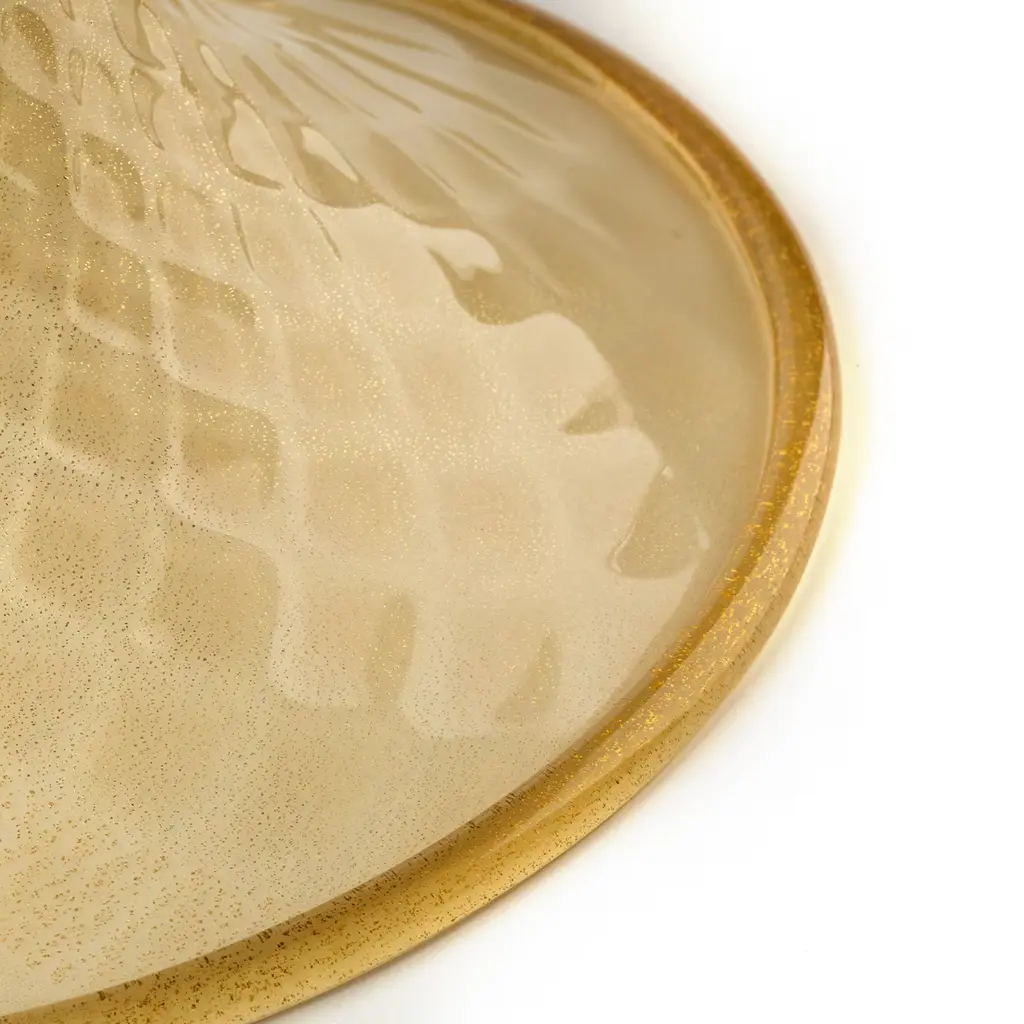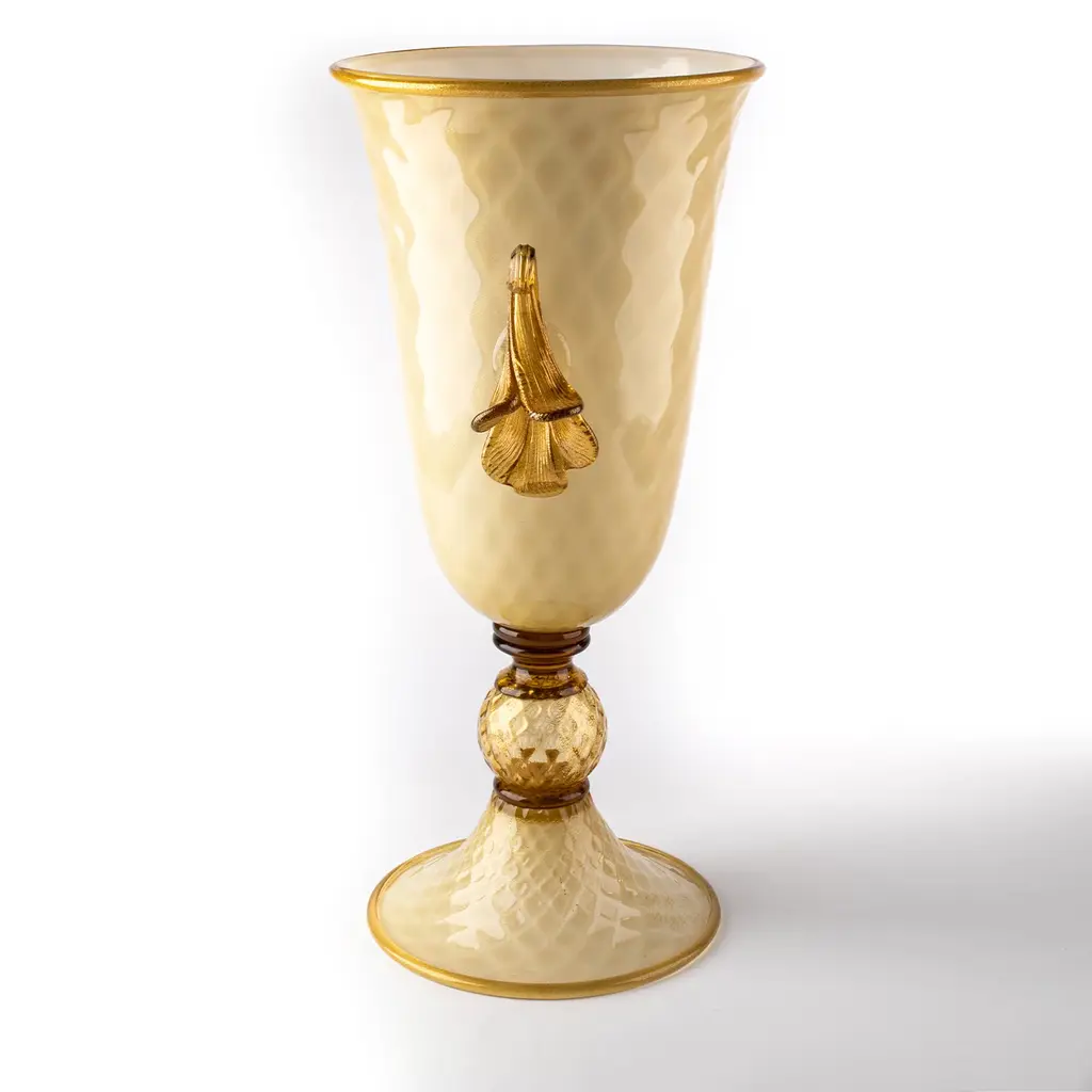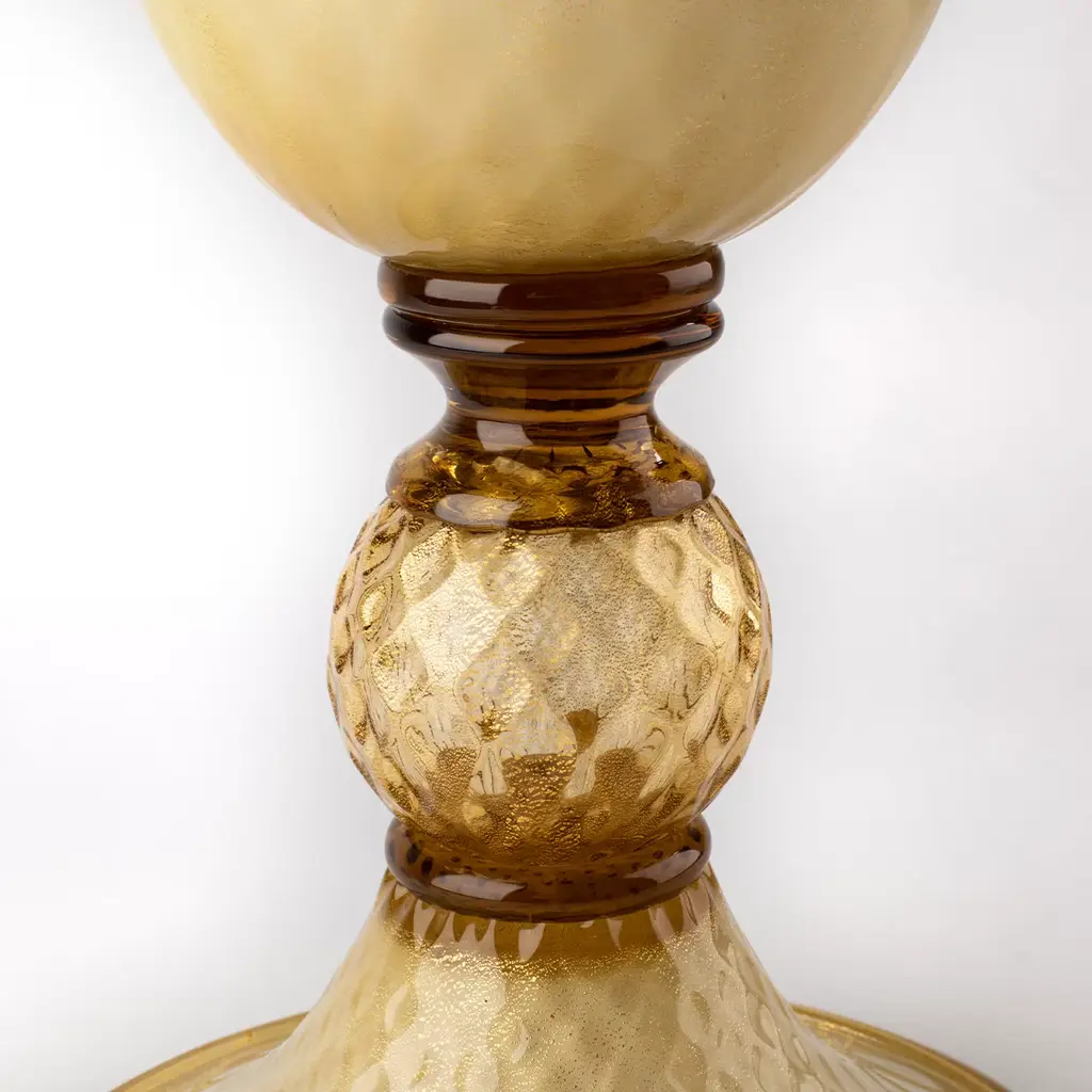 A clever combination of rich details increases the opulent character of this goblet-shaped vase, deftly mouth-blown by Murano master artisans. Amber-toned, transparent glass features the floral elements accenting the sides and for the spherical element connecting the flared base to the cup where flowers will find a truly luxurious house. 24 K gold leaf inserts adorn the piece, creating charming shimmers.