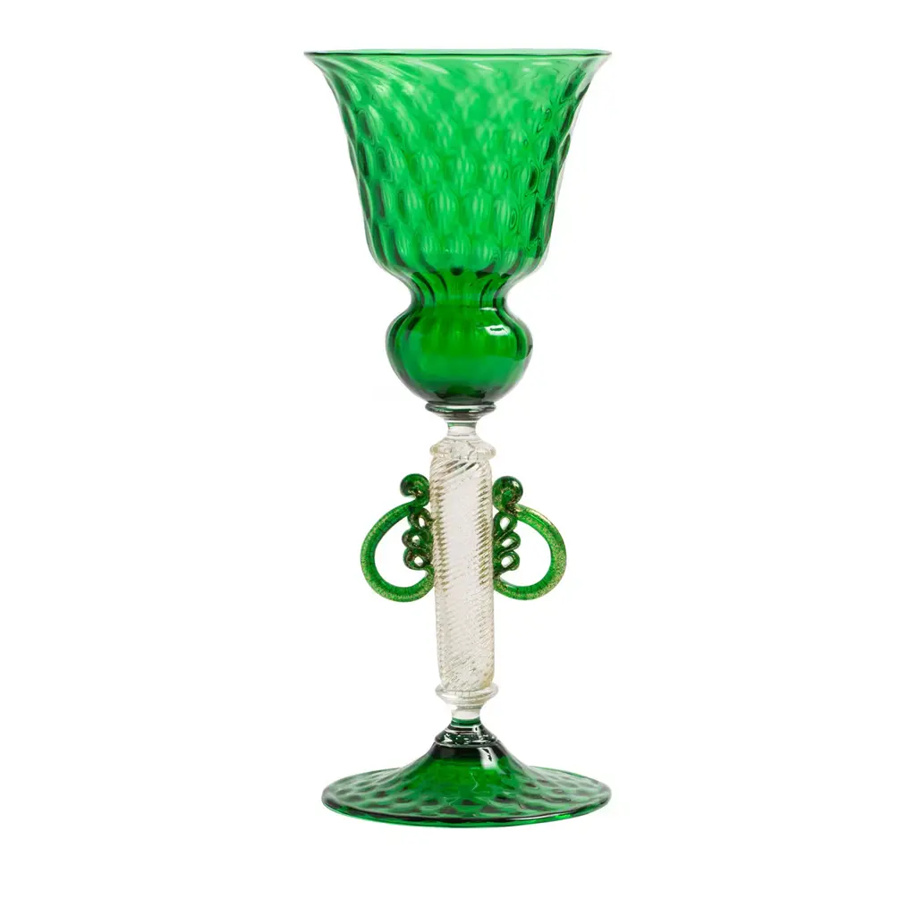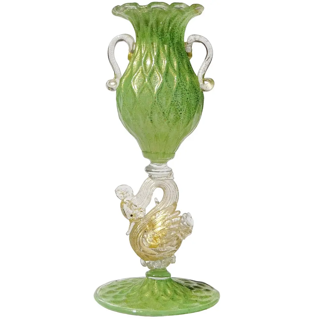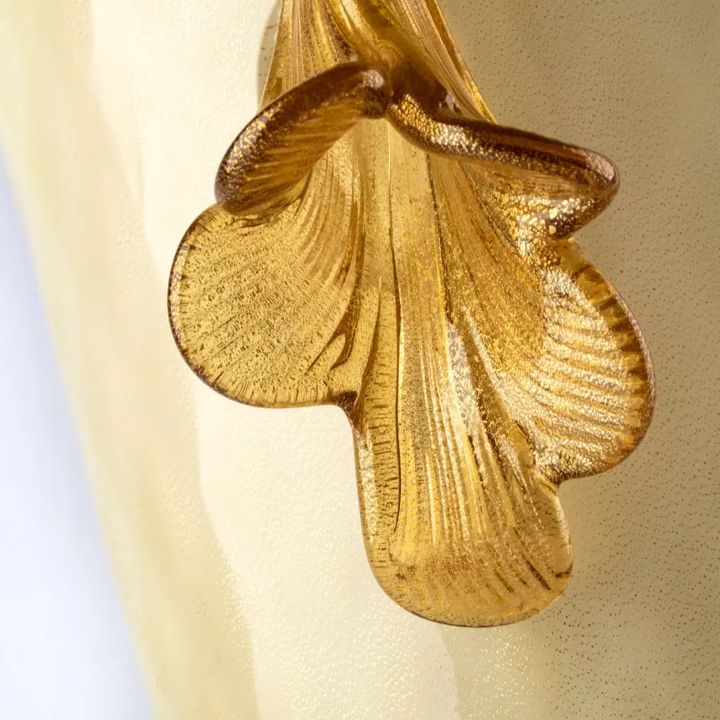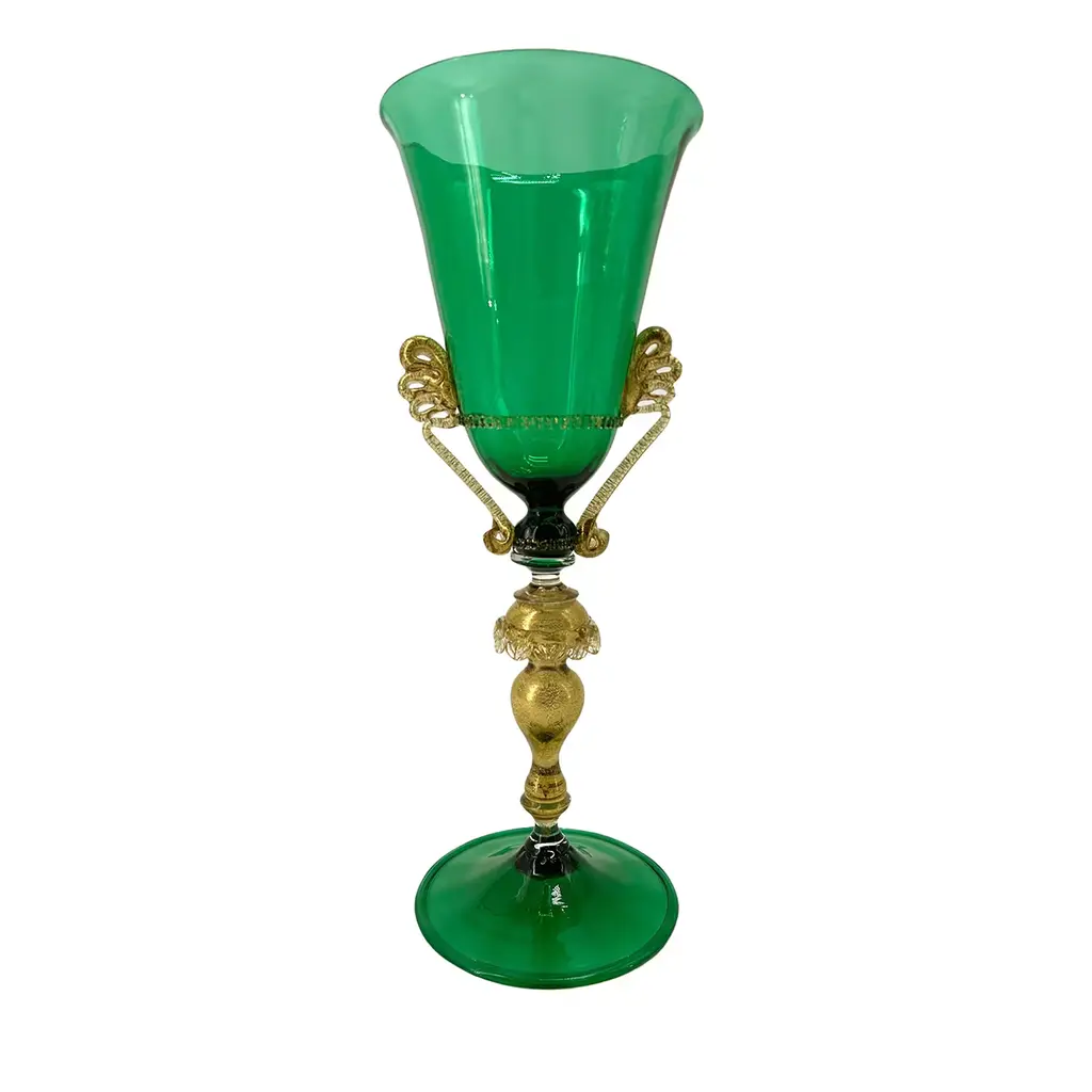 A clever combination of rich details increases the opulent character of this goblet-shaped vase, deftly mouth-blown by Murano master artisans. Amber-toned, transparent glass features the floral elements accenting the sides and for the spherical element connecting the flared base to the cup where flowers will find a truly luxurious house. 24 K gold leaf inserts adorn the piece, creating charming shimmers.