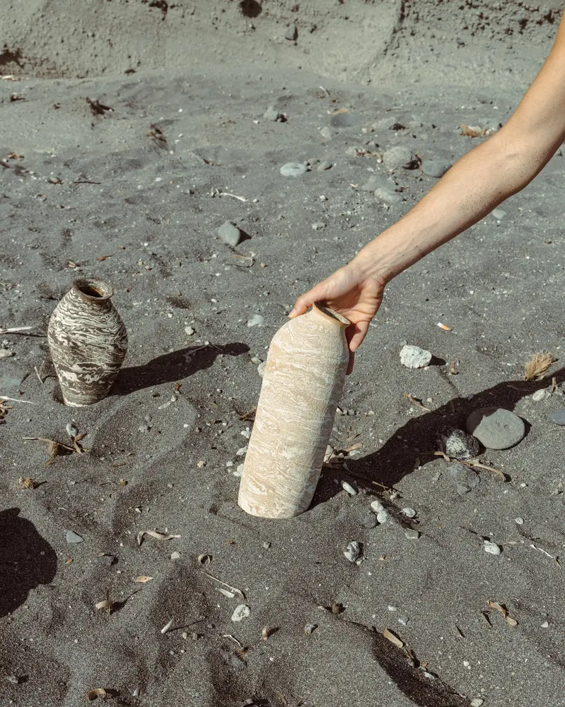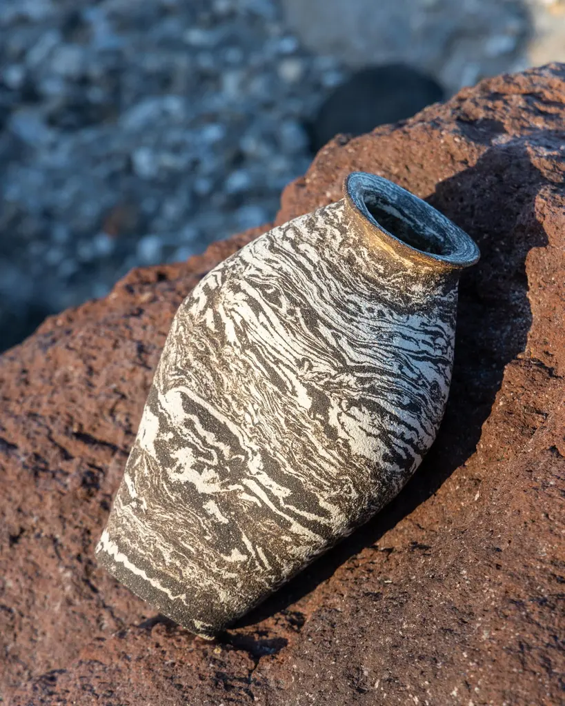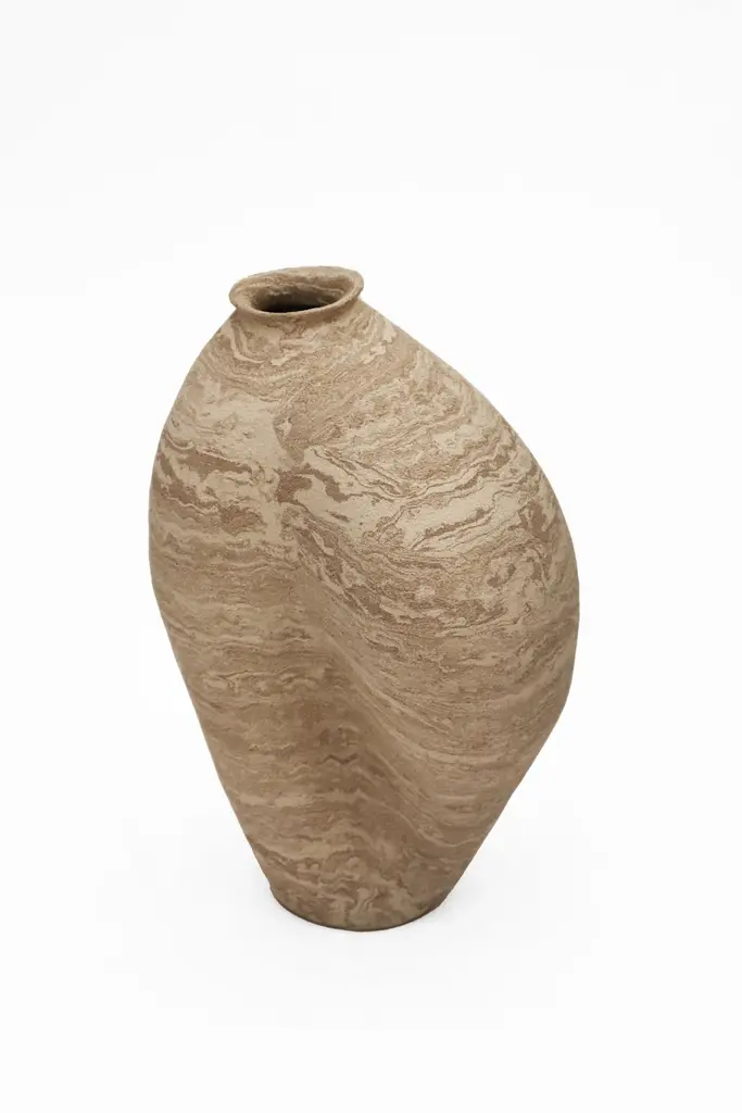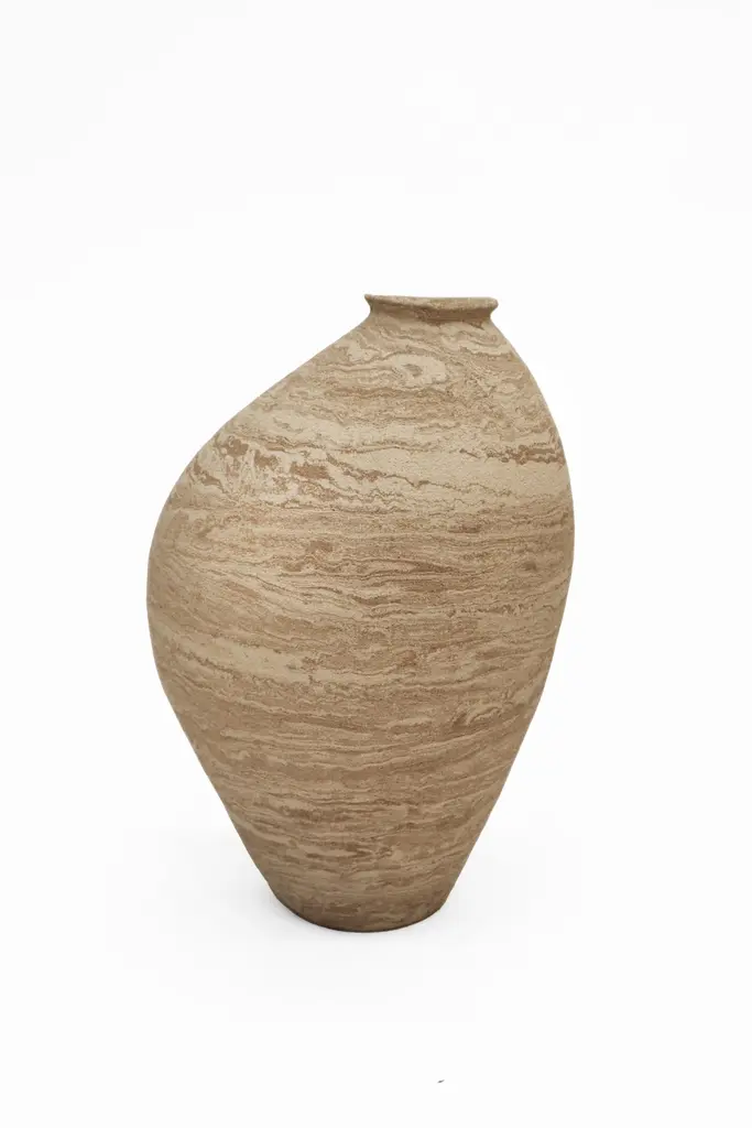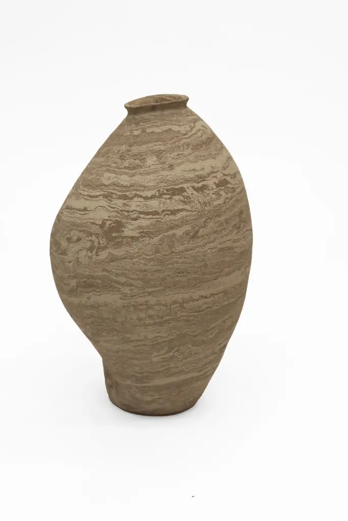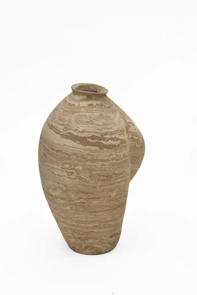 Stomata 10 vase by Anna KarountzouDimensions: W 17 x D 14 x H 30 cmMaterials: Mixed beige and white stoneware clay, clear glaze inside, fired at 1240Born and based in Athens, Greece, with a background in conservation of works of art and antiquities, her work is inspired by ancient civilizations and natural settings.Anna started creating ceramics in 2014 after graduating. Conservation has been a strong influence since the beginning. Her way of working was guided by absolute discipline, concentration, attention to detail, patience and dedication. The background knowledge in the science of materials worked as a tools in understanding how to create her own glazes.With focus on vessels that provoke an earthy feeling, combining the ancient with the contemporary. Using materials found in places she feels connected with, her work captivates memories.Ceramics functional and sculptural, all formed by traditional hand- building techniques such as the coiling and pinching method. Unique and one of a kind pieces, slowly made by hand. All pots have been fired at a high temperature to ensure their durability.“At first, I worked on perfecting my coiling method and achieving the ideal symmetry to a flawless piece. After years of exploring and practicing my craft I found what expresses me truly as an artist and a person.I often feel like each piece guides me and I follow its lead. I like to create a family of ceramics since I feel each piece is unique but together they create a wholesome feeling of peace. I opt to use materials and glazes to decorate my ceramics on earthy tones. I'm inspired by nature and I'm obsessed with the marks of time. I seek out the nostalgia of the old and one of the ways I express that is the essence of corrosion my pieces have.”.