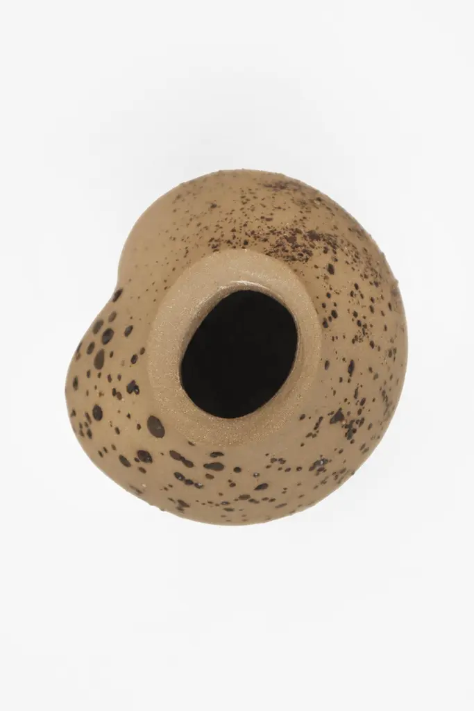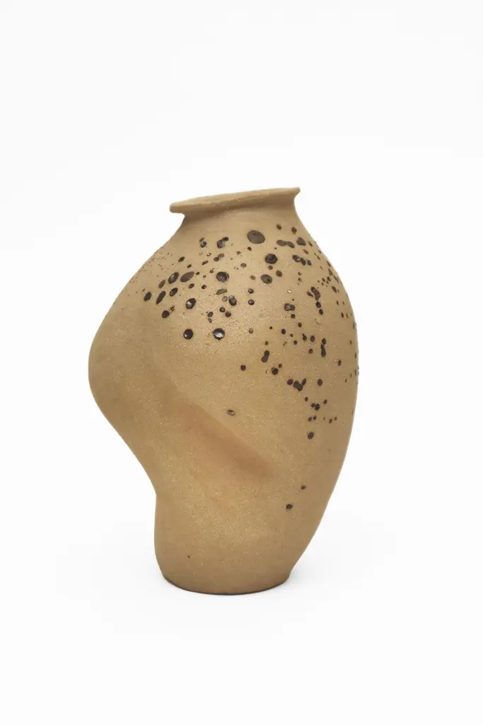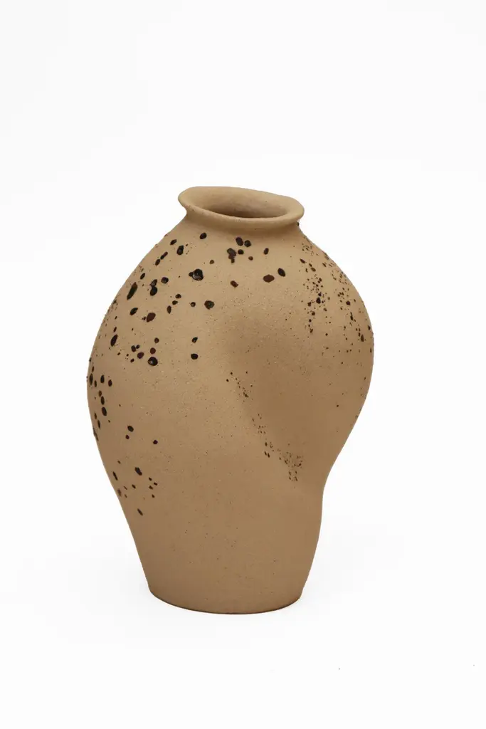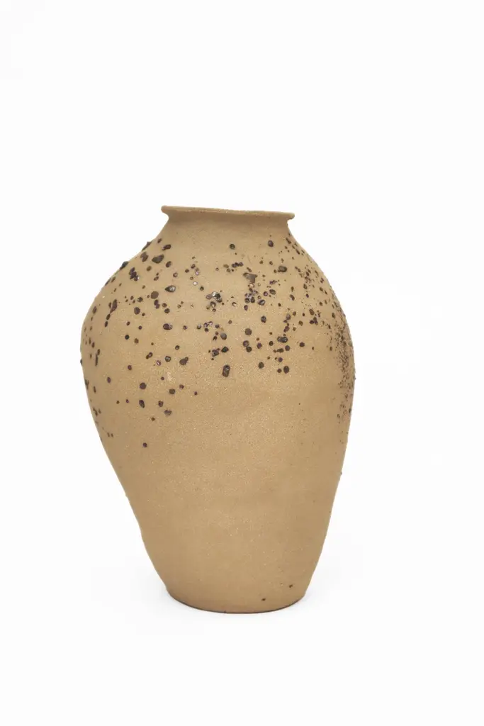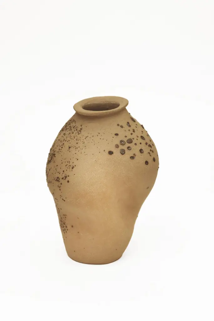 Stomata 3 vase by Anna KarountzouDimensions: W 13 x D 11 x H 22 cmMaterials: Beige stoneware clay, clear glaze inside, decorated outside with volcano rocks collected from Santorini, fired at 1240Born and based in Athens, Greece, with a background in conservation of works of art and antiquities, her work is inspired by ancient civilizations and natural settings.Anna started creating ceramics in 2014 after graduating. Conservation has been a strong influence since the beginning. Her way of working was guided by absolute discipline, concentration, attention to detail, patience and dedication. The background knowledge in the science of materials worked as a tools in understanding how to create her own glazes.With focus on vessels that provoke an earthy feeling, combining the ancient with the contemporary. Using materials found in places she feels connected with, her work captivates memories.Ceramics functional and sculptural, all formed by traditional hand- building techniques such as the coiling and pinching method. Unique and one of a kind pieces, slowly made by hand. All pots have been fired at a high temperature to ensure their durability.“At first, I worked on perfecting my coiling method and achieving the ideal symmetry to a flawless piece. After years of exploring and practicing my craft I found what expresses me truly as an artist and a person.I often feel like each piece guides me and I follow its lead. I like to create a family of ceramics since I feel each piece is unique but together they create a wholesome feeling of peace. I opt to use materials and glazes to decorate my ceramics on earthy tones. I'm inspired by nature and I'm obsessed with the marks of time. I seek out the nostalgia of the old and one of the ways I express that is the essence of corrosion my pieces have.”.