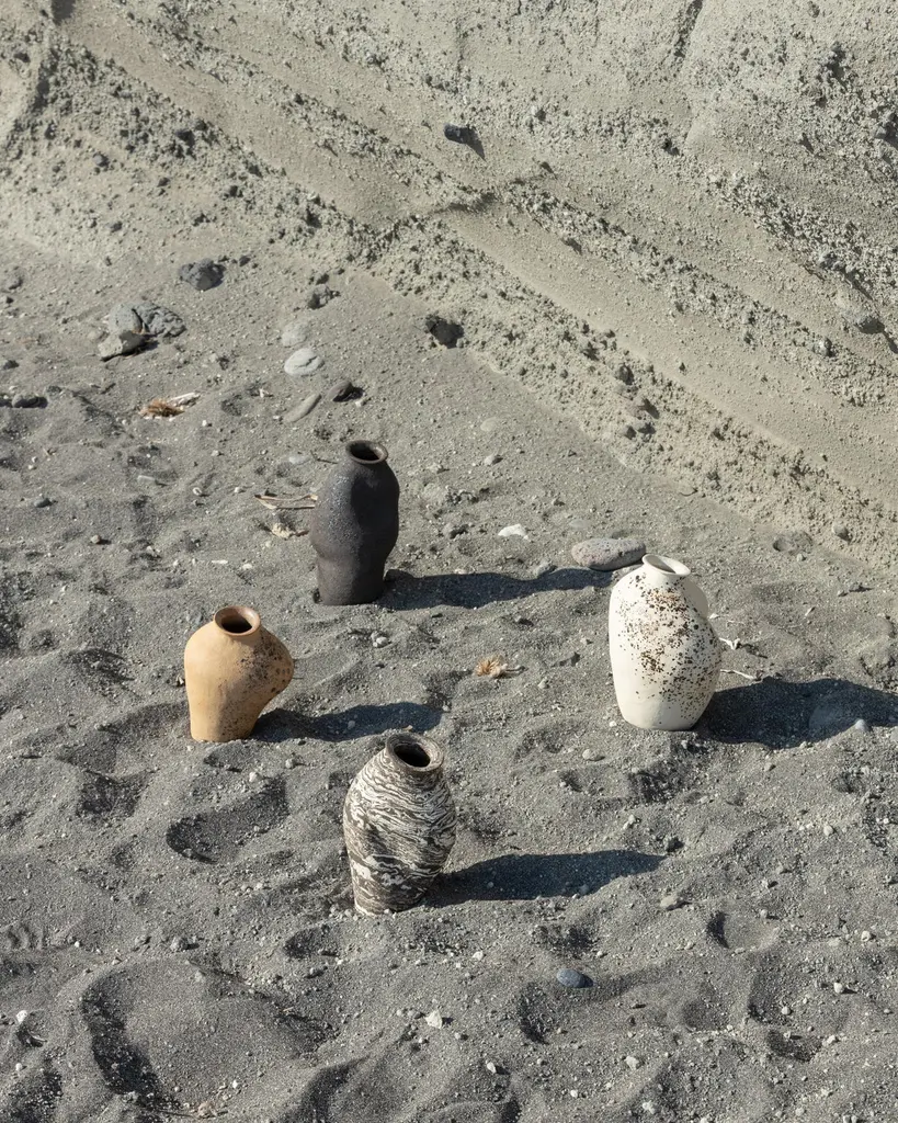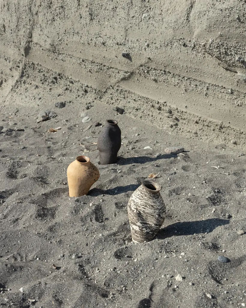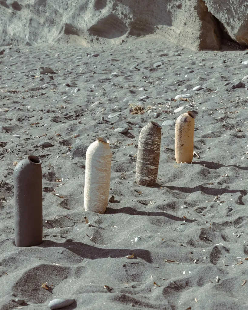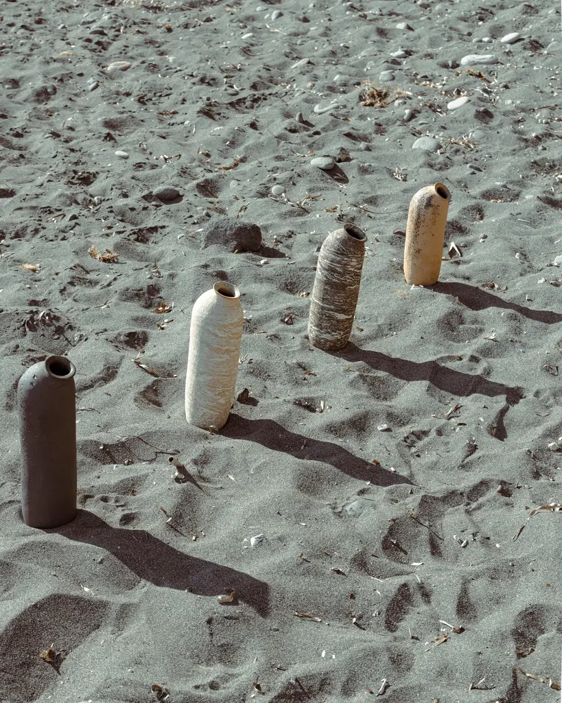 Stomata 3 vase by Anna KarountzouDimensions: W 13 x D 11 x H 22 cmMaterials: Beige stoneware clay, clear glaze inside, decorated outside with volcano rocks collected from Santorini, fired at 1240Born and based in Athens, Greece, with a background in conservation of works of art and antiquities, her work is inspired by ancient civilizations and natural settings.Anna started creating ceramics in 2014 after graduating. Conservation has been a strong influence since the beginning. Her way of working was guided by absolute discipline, concentration, attention to detail, patience and dedication. The background knowledge in the science of materials worked as a tools in understanding how to create her own glazes.With focus on vessels that provoke an earthy feeling, combining the ancient with the contemporary. Using materials found in places she feels connected with, her work captivates memories.Ceramics functional and sculptural, all formed by traditional hand- building techniques such as the coiling and pinching method. Unique and one of a kind pieces, slowly made by hand. All pots have been fired at a high temperature to ensure their durability.“At first, I worked on perfecting my coiling method and achieving the ideal symmetry to a flawless piece. After years of exploring and practicing my craft I found what expresses me truly as an artist and a person.I often feel like each piece guides me and I follow its lead. I like to create a family of ceramics since I feel each piece is unique but together they create a wholesome feeling of peace. I opt to use materials and glazes to decorate my ceramics on earthy tones. I'm inspired by nature and I'm obsessed with the marks of time. I seek out the nostalgia of the old and one of the ways I express that is the essence of corrosion my pieces have.”.