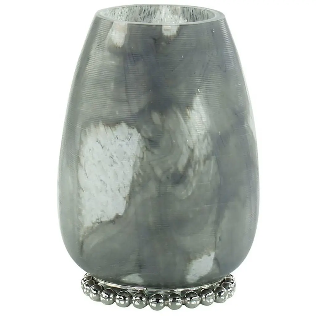 The Stone Mist Vase is a stylish decorative accent that introduces ethereal flourishes punctuated with metallic accents. Crafted from art glass, the piece displays a white tone with stone-like spotting overlain by misty flourishes of black and gray. The piece sits upon a small base of brass beads in a Polished Nickel finish.