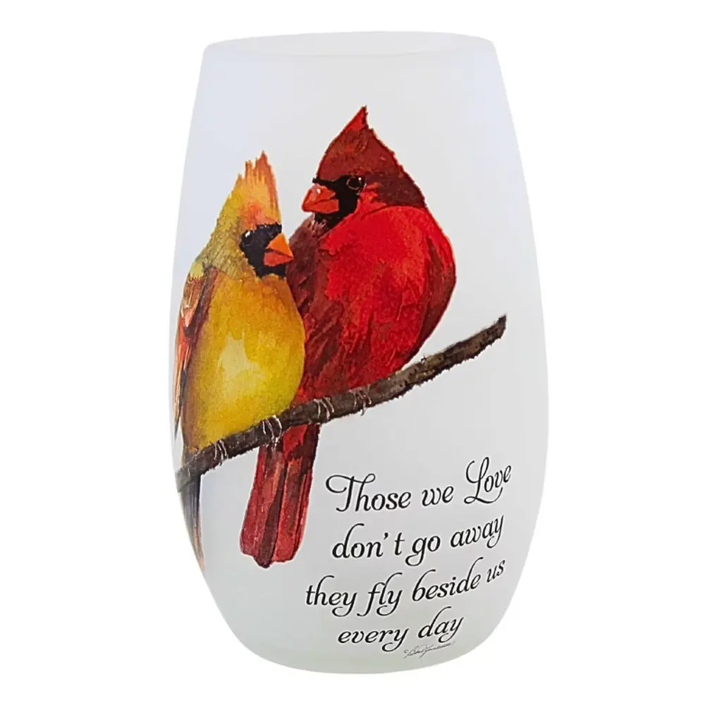 Honor loved ones with the gentle glow of the Angel Cardinals Pre-Lit Small Vase from Stony Creek. This 5.25-inch frosted glass vase features a touching message and beautiful red cardinals perched on twigs, symbolizing the presence of those we’ve lost. The soft, warm light from the electric plug-in design creates a peaceful ambiance in any room. It's a meaningful and comforting addition to your décor, perfect for remembrance during the holidays or any time of year. Measures Approximately 5.25 In H X 3.25 In W X 3.25 In D (HxWxD). Includes 1 Glass Small Electric Vase.