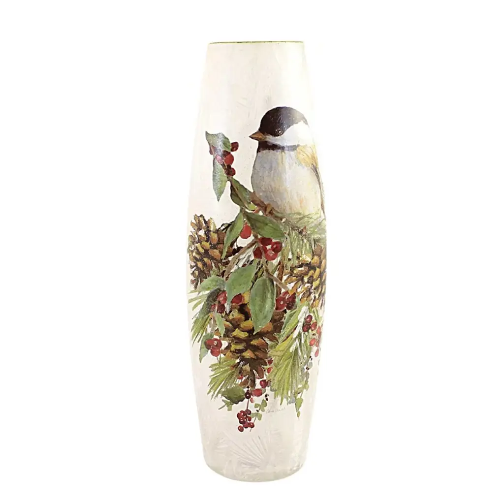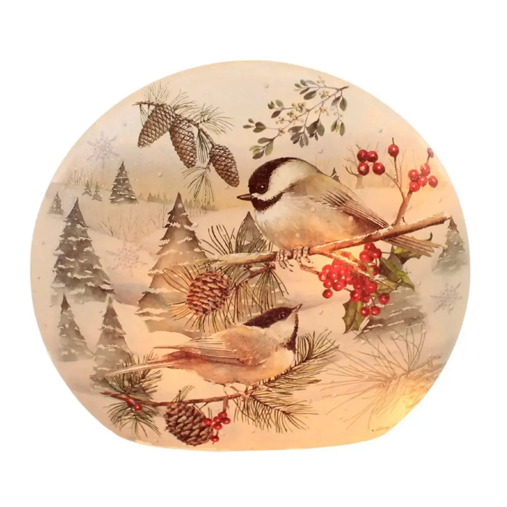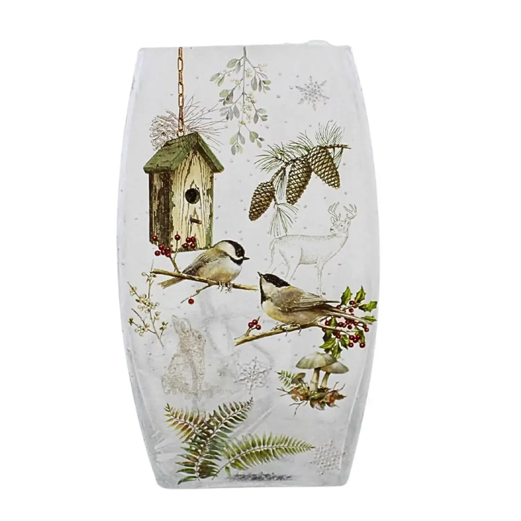 Stony Creek 8.0 Inch Winter Chickadees Pre-lit Med Vase Christmas Lighted Glass Accent , Christmas Decor Chickadee Trees Pinecones (1pc)
