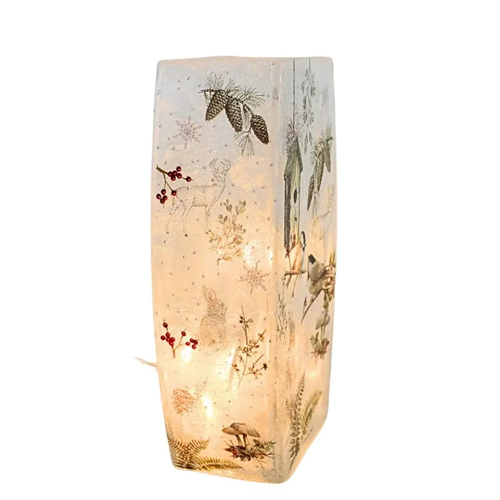 Brighten up your winter décor with the Stony Creek Winter Chickadee Pre-Lit Medium Vase. This 8-inch frosted glass vase features a serene winter scene with two chickadees perched on snow-covered branches, all accented with a touch of glitter for added sparkle. Illuminated by 11 warm interior lights, it creates a cozy glow that's perfect for adding charm to any room. Plug it into a standard outlet and enjoy effortless ambiance all season long. With replacement bulbs and fuses included, this beautiful low-wattage accent is as practical as it is enchanting. Measures Approximately 8 In H X 4.5 In W X 2.5 In D (HxWxD). Includes 1 Med Pre-Lit Vase.
