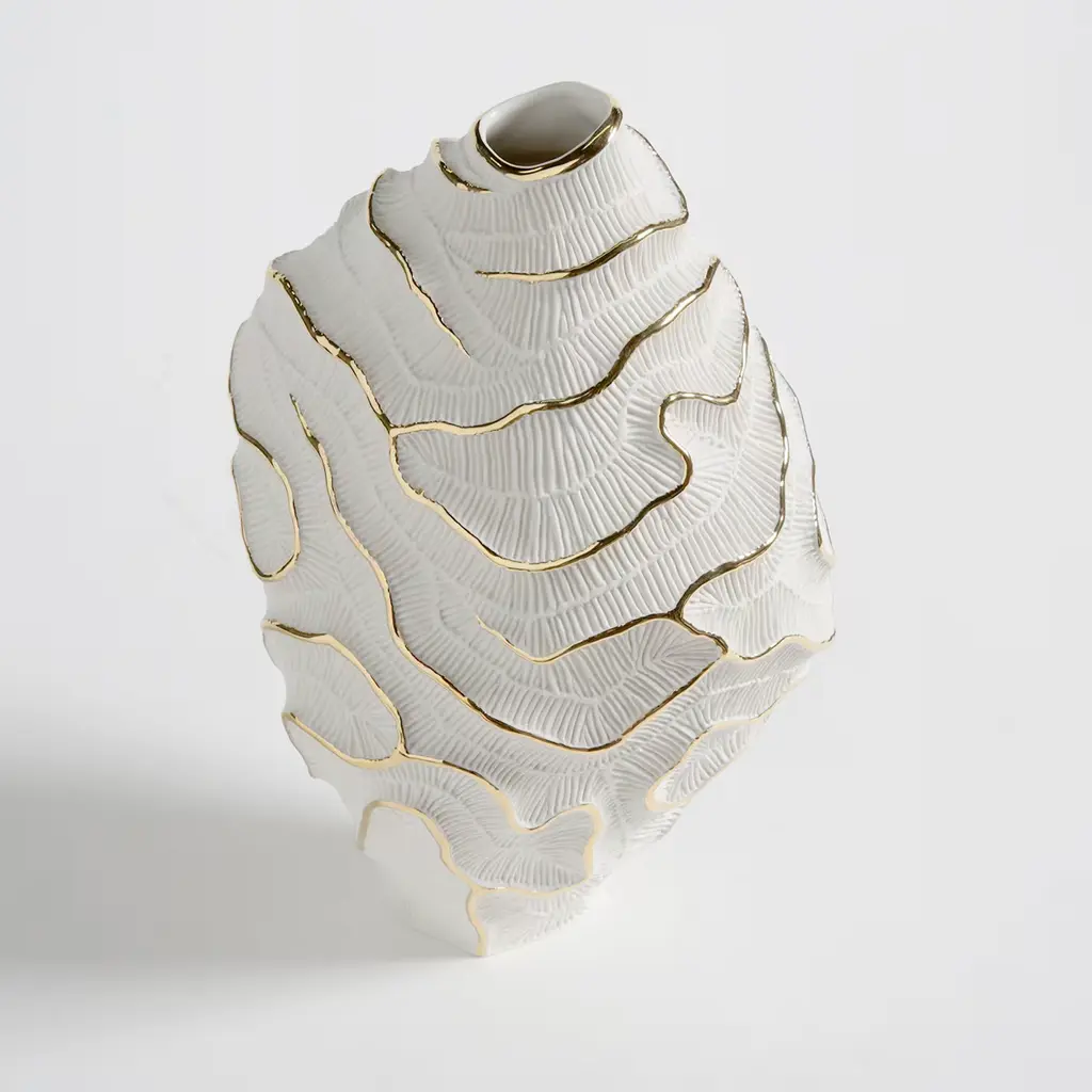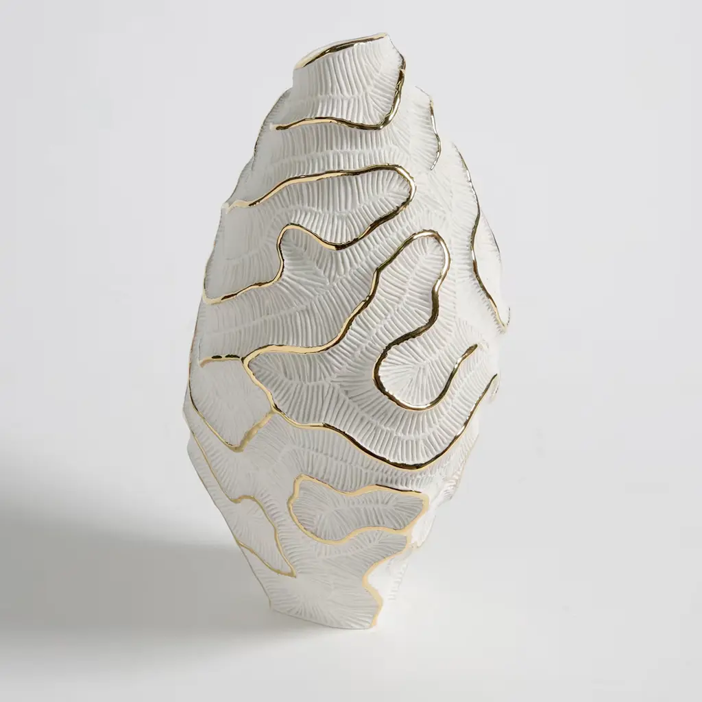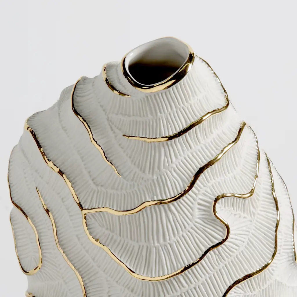 Fossils of madrepore inspire the minute texture decorating this striking vase of the Fossilia collection. A meticulously crafted mold and the use of unglazed porcelain, or "biscuit", make this piece an exquisite objet d'art. Details in 23K gold are applied by hand, making this vase even more precious.