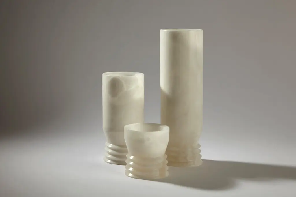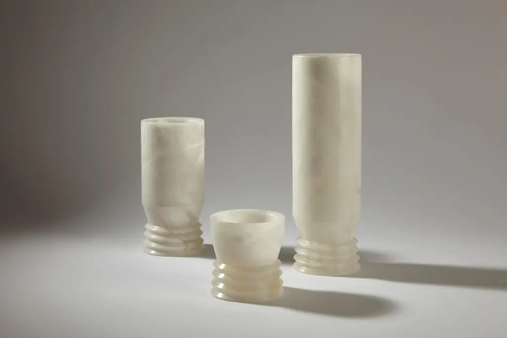 "Strato due" Vase in Tuscan Alabaster by Andrea GrecucciDimensions: 8.5 cm D x 18 cm H3.35” D x 7.09” H Material: Alabaster from Volterra Italy.Designer: Andrea Grecucci"Strato due" is part of a 3 vase set from the "Neocene" series created by Andrea Grecucci in 2021. The vases are sculpted out of monolithic blocks of the autochthonous Alabaster only found in the Volterra region of Tuscany, Italy. The artist has attempted to portray the sedimentary nature of Alabaster and glorify the tremendous amount of time it has taken for geological events to give life to this beautiful material. The Neocene series is a project developed as part of the group "Materie Prime" from Italy with which the artist is affiliated. The group's main ethos is to strategically select artisanal niche sectors struggling in today's current economic landscape; and giving them a breath of new life by creating unique pieces and limited editions. These collectibles aim to appreciate ancient artisanal practices, as in this case the "Alabastrai di Volterra" (alabaster artisans of Volterra) and bring their crafts and practices to the attention of those wishing to help preserve them.