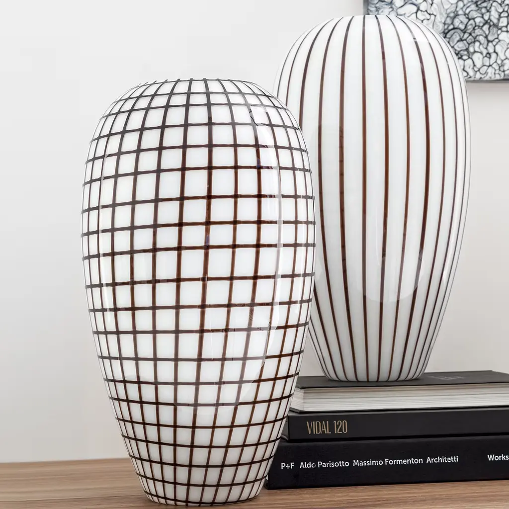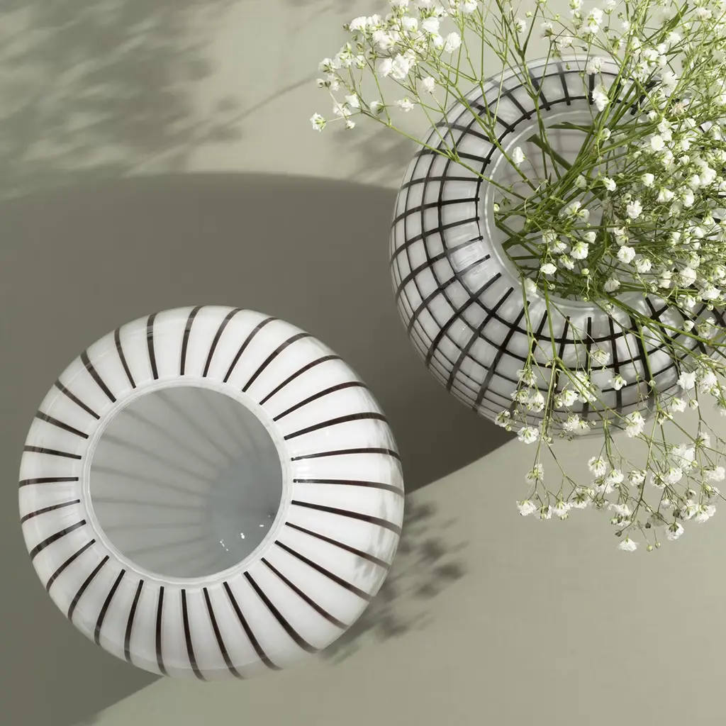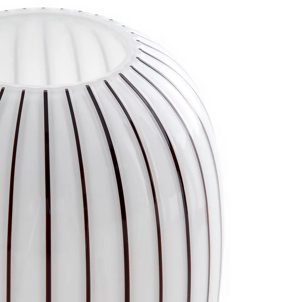 Stunning in its glamorous black-and-white aesthetic, this vase is a singular piece deftly mouth-blown from Murano glass and distinguished by a captivating striped pattern. Ancient tehcniques meet timeless flair in its bulging silhouette, where black glass sticks are applied to the white glass when still incandescent, a careful manual process named "canne" method.