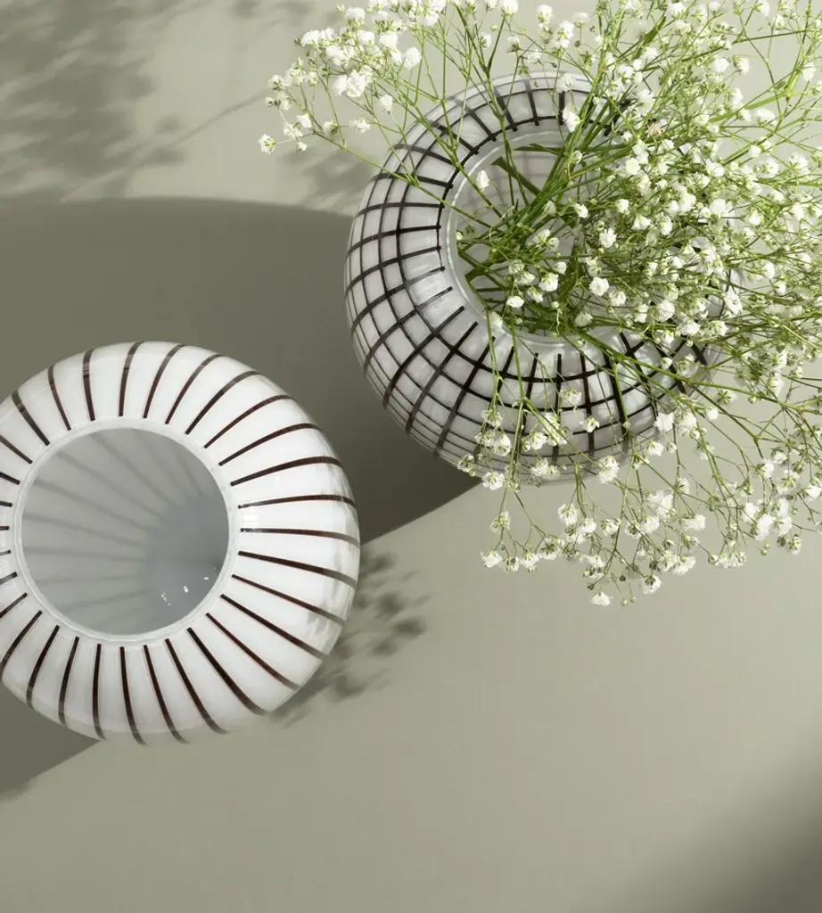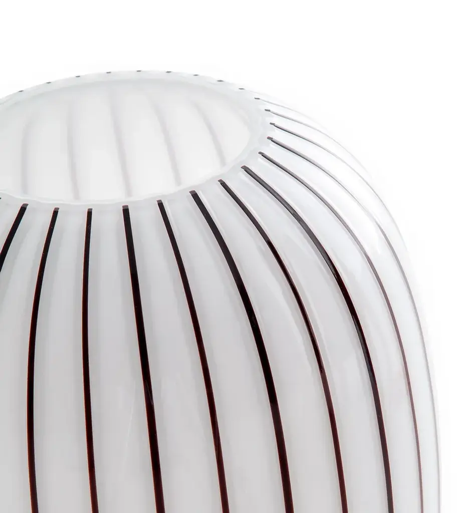 STRIPE is a mouth-blown white Murano glass vase crafted using the canework technique, which involves the application of small blown rods, juxtaposed with each other, in black monochrome glass.The Enjoy Collection is Morica Design’s most sparkling, dynamic collection. The items are lively, inspired by nature, and find their soul in the pastel shades that blend and play with the wood in an original, fresh manner. The distinctive feature of Enjoy Collection is the use of color, declined in functional furnishings and contemporary mood. Modern and refined products made with high quality materials and handcrafted in Italy.