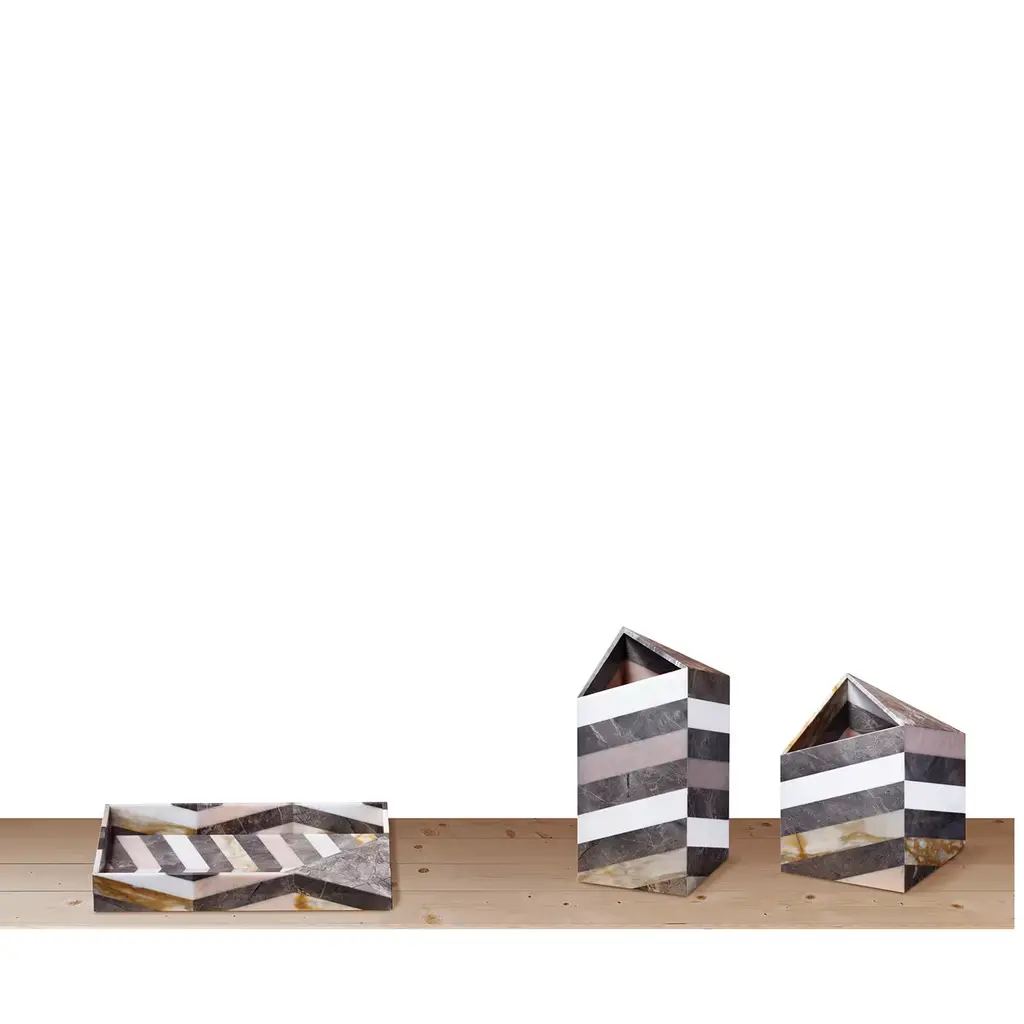 Part of a collection of vases and trays in asymmetric shapes and geometric layout of Fior di Pesco, Rosa Portogallo, Bianco Lasa and light Giallo Siena marble, this striking vase was designed by Patricia Urquiola and crafted by the masterful hands of the artisans at Budri. Either alone or paired with the other Striped Vase, this piece will be an exquisite addition to a contemporary decor.