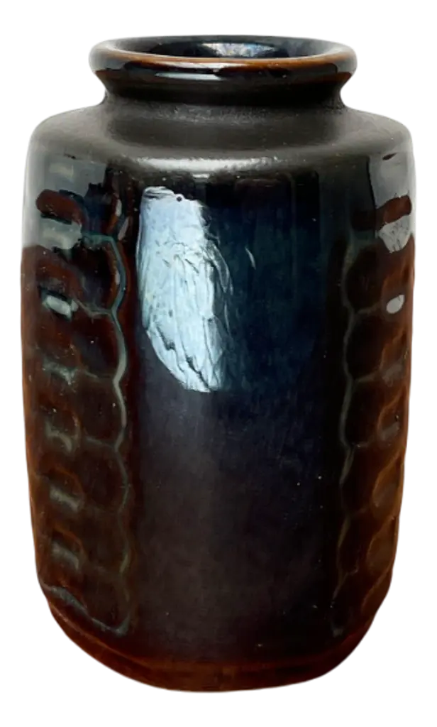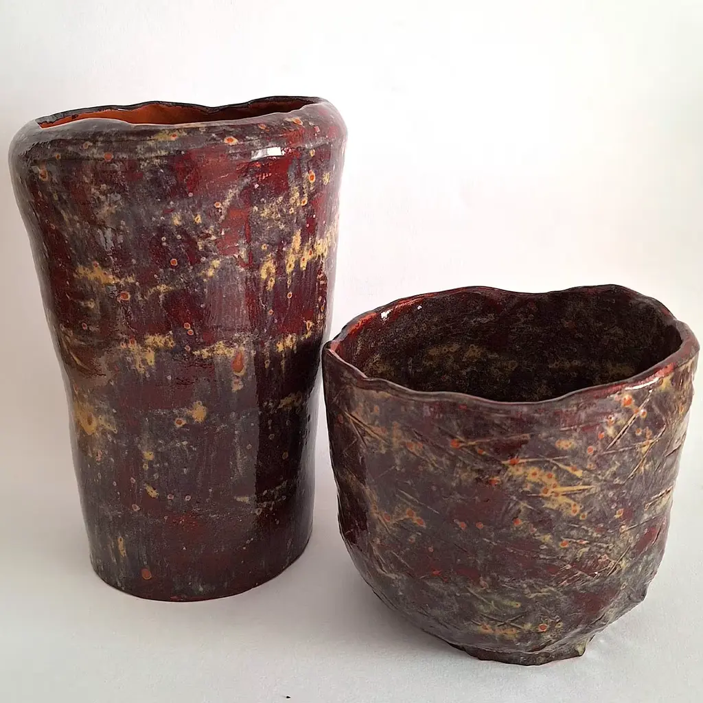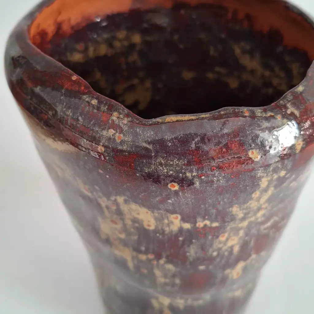 This red clay vase with ochre glaze, red speckles, and surface carvings is part of the Isole collection. It presents a unique combination of colors and textures. The red speckles seem to dance across the surface, creating a visual play reminiscent of molten lava. The intricate carvings add depth and movement, enhancing the dynamic interaction between the rich, fiery hues. This vase captures the raw, elemental beauty of volcanic landscapes, making it a striking and expressive piece.