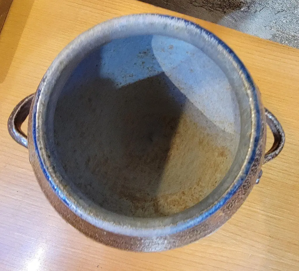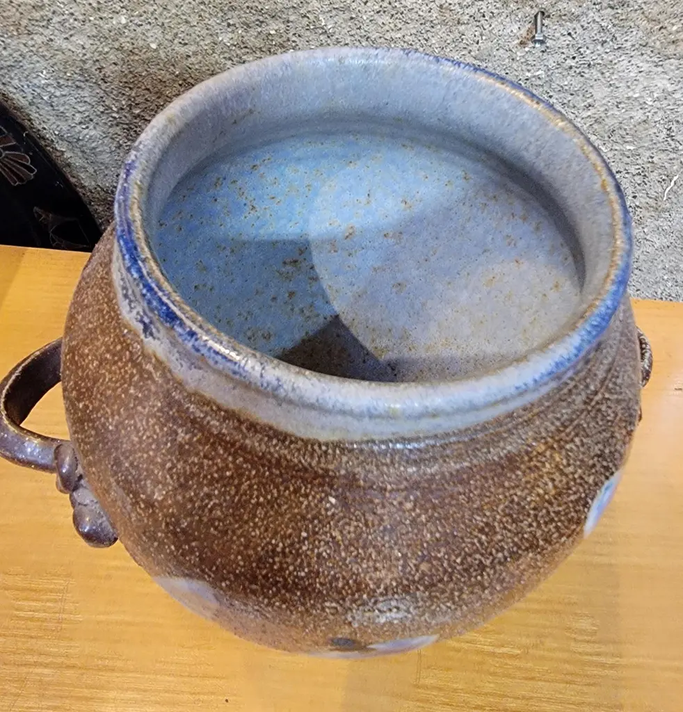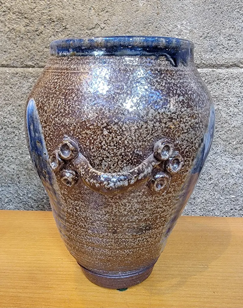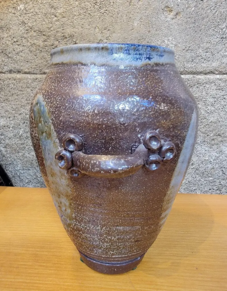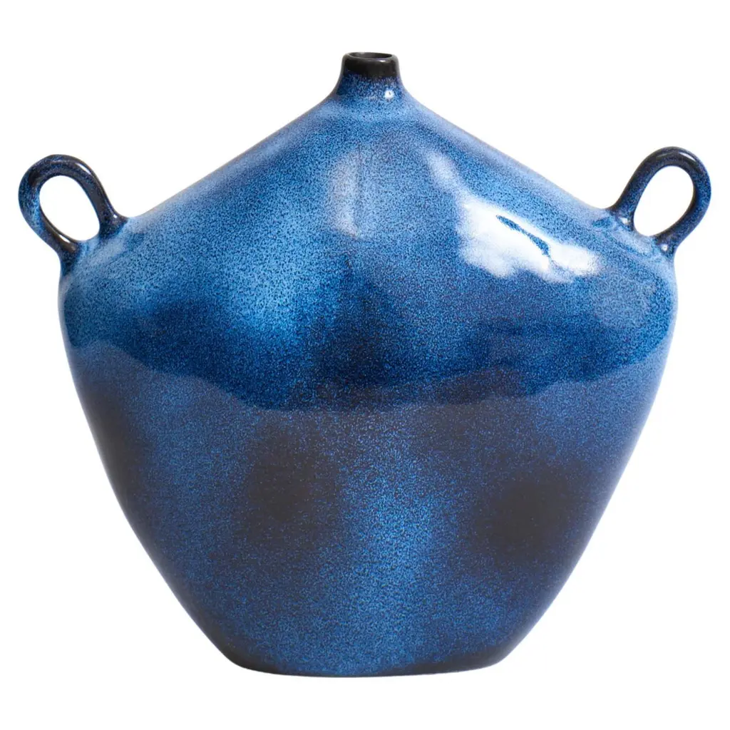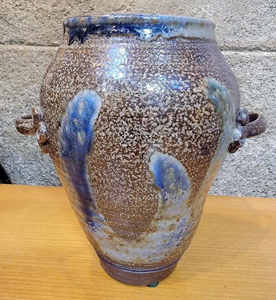 Studio pot by Herman Roderick Volz. Hand thrown earthenware vase with applied handles. Inscribed on base "Volz". Circa. 1970.7.13 inches High5 inches deep.6.75 inches wide.HERMAN RODERICK VOLZPainter, muralist, lithographer, set designer and ceramist. Formal training at the Art und Gewerbescule in Zurich and the Academy of Fine Arts, Vienna. Immigrated from Zurich to the U.S. in 1933, settling in the San Francisco Bay Area and became a citizen in 1938. During the Depression Volz was appointed supervisor in the Northern California Arts Project and supervisor for the Federal Building mural project at the G.G.I.E. Two of these large mosaic panels were later installed at the San Francisco City College among a panel created by Diego Rivera. Volz designed sets for MGM and Paramount Studios. He was politically active, vocal and often made social statements through his imagery.