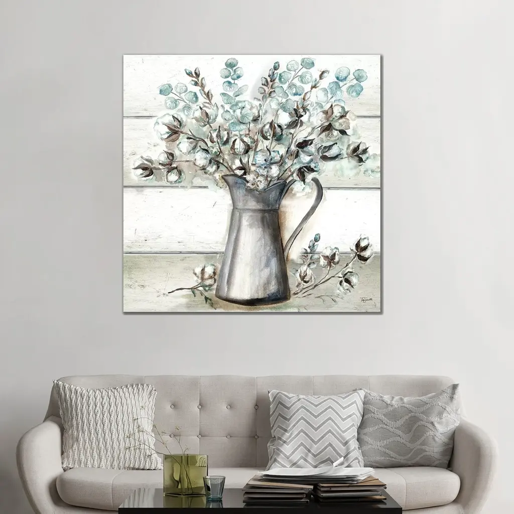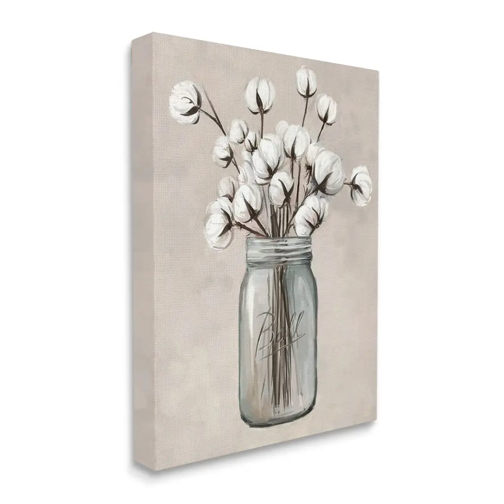 We create our stretched canvas to the highest standards. Using only the highest quality inks and canvas on Mimaki printers, we hand-cut and stretch each piece over a 1.5-inch thick wooden frame for hanging. As a result, the art comes ready to hang on the sturdy ledge with no installation required. Stupell Wall Art is made in the USA.Features: Dimensions: 16 x 1.5 x 20 InchesStretched Canvas Sizes Include Standard: 16 x 1.5 x 20 Large: 20 x 1.5 x 30 X-Large: 30 x 1.5 x 40 Oversized: 36 x 1.5 x 48Wall Art is Ready to Hang - No Installation or Hardware Needed. For Easy Set Up Lean or Layer Artwork on Shelf or Against Wall.Our stretched canvas is created with the highest standards. We use only the highest quality inks and canvas on our in house Mimaki printers, and then hand cut and stretch each piece over a 1.5 inch thick wooden frame for hanging. Made In USA.Artwork Relates To: Jar, Plant, Pottery, Mason Jar, Country, Farmhouse, Flower, Botanical, Cotton FlowerDesign by Ziwei Li