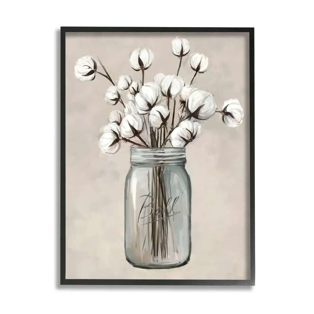 Add dimension to any room with our textured Framed Giclee Artwork. Our framed artwork is securely mounted into a 1.5-inch thick wood grain frame and ready to hang. Frames are available in three alluring styles: black, gray farmhouse and white. In addition, you should check out our oversized options if you want a statement piece. Stupell Wall Art is made in the USA.Features: Dimensions: 11 x 1.5 x 14 FramedFramed Giclee Sizes Include Standard: 11 x 1.5 x 14 Large: 16 x 1.5 x 20 Oversized: 24 x 1.5 x 30Wall Art is Ready to Hang - No Installation or Hardware Needed. For Easy Set Up Lean or Layer Artwork on Shelf or Against Wall.Our giclée prints are carefully mounted on a durable MDF backing, and then perfectly finished in a 1.5 inch thick woodgrain frame. Mounted frame colors include black, gray farmhouse and white. Made In USA.Artwork Relates To: Jar, Plant, Pottery, Mason Jar, Country, Farmhouse, Flower, Botanical, Cotton FlowerDesign by Ziwei Li