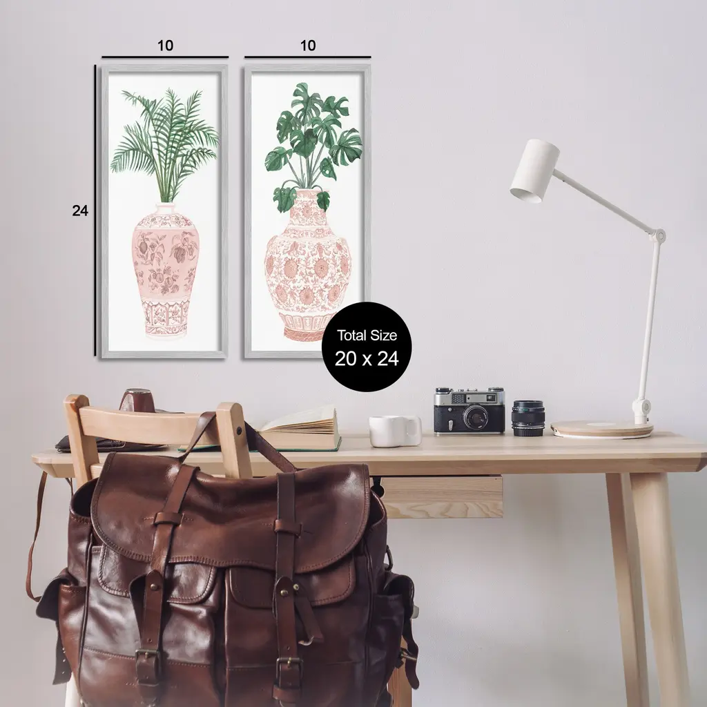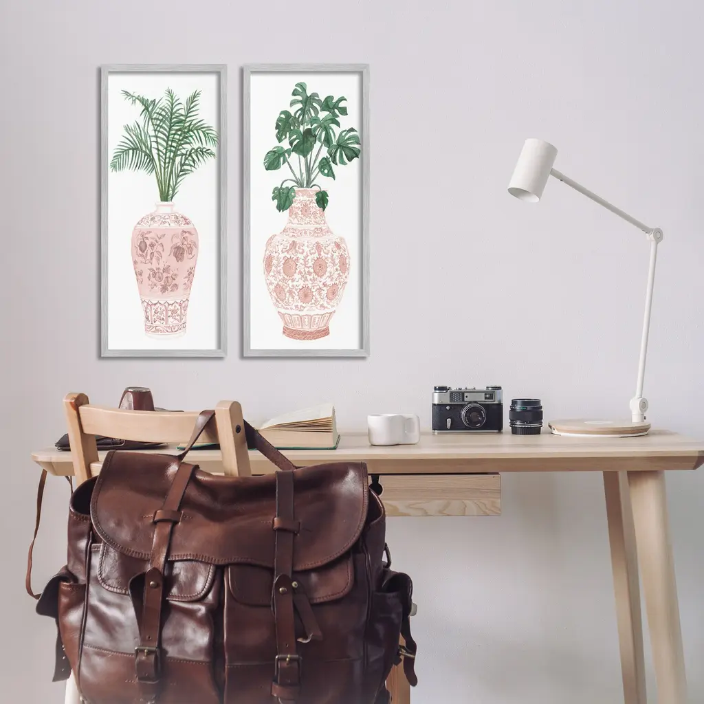Fill any space in your home or office with our Framed Wall Art Sets. Our framed artwork is securely mounted into a 1.5-inch thick wood grain frame and ready to hang. Frames are available in three alluring styles: black, gray farmhouse and white. Stupell Wall Art is made in the USA.Features: Dimensions: 2 Piece Set, Each Panel is 10 x 1.5 x 24 FramedTwo Piece Framed Giclee Sets are available as 10"x24" or 13"x30" Panels. All Framed Giclee Panels have a 1.5" Depth. Wall Art is Ready to Hang with Hardware Free Hanging. No installation required. For Easy Set Up Lean or Layer Artwork on Shelf or Against Wall.Curated Wall Art Sets make it easy for you complete the theme for any room. Our giclée prints are carefully mounted on a durable MDF backing, and then perfectly finished in a 1.5 inch thick woodgrain frame. Mounted frame colors include black, gray farmhouse and white. Made In USA.Artwork Relates To: Pottery, Jar, Vase, Plant, Potted Plant, Planter, Leaf, Pattern, MonsteraDesign by Melissa Wang