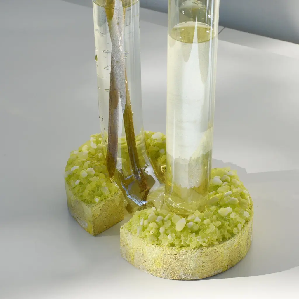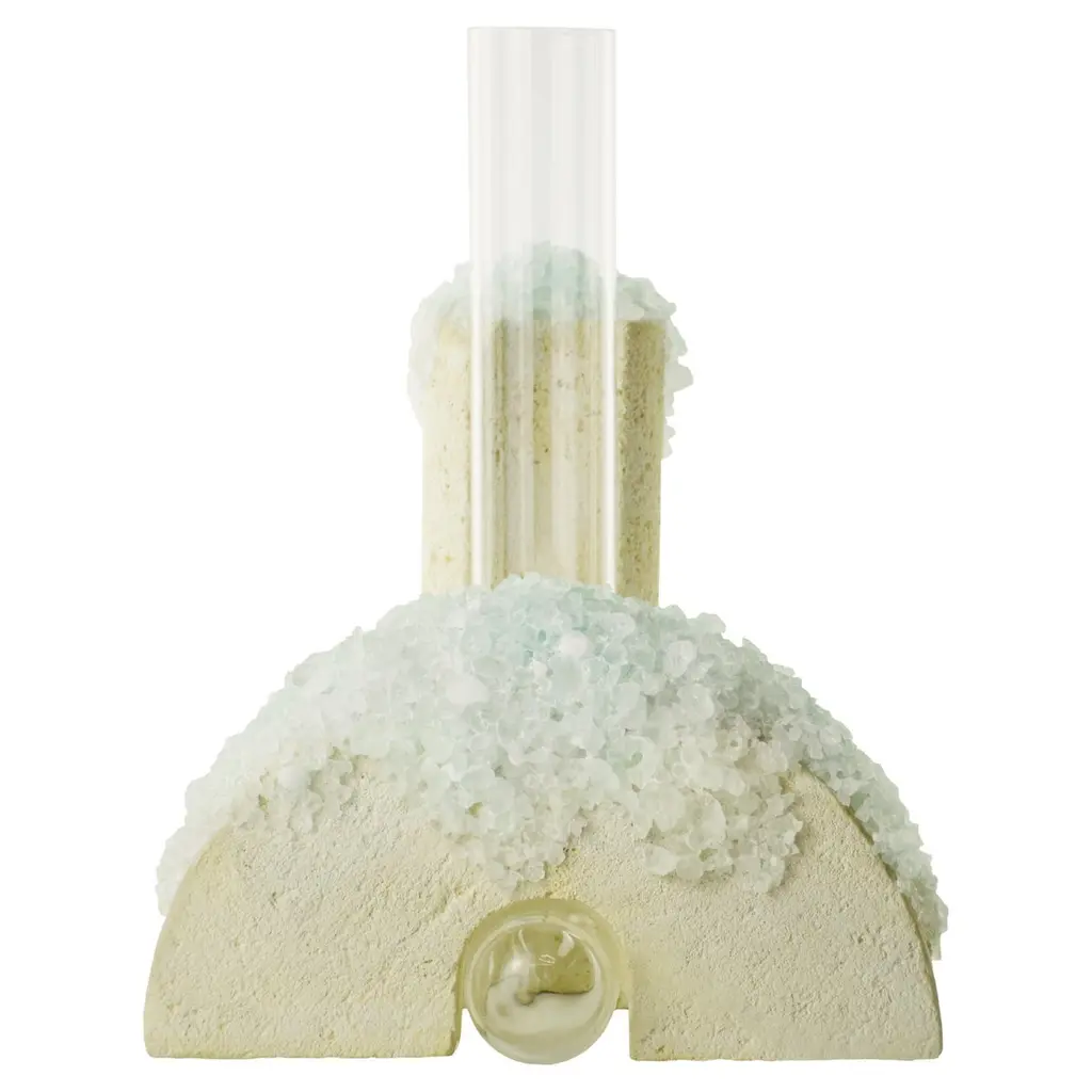 Summer Cochlea del Risveglio Seasons Edition Vase by Coki BarbieriDimensions: W 24 x D 14 x H 30 cm.Materials: Handcrafted stone made with Matera stone fragments, sedimentary rocks of the Italian Apennines and pure water, Italian rock salt crystals, yellow mineral pigments from Italian soils, yellow painted borosilicate glass.Cochlea del Risveglio - SEASONS EDITION - SummerEmbellished with Italian rock salt crystals colored with natural pigments from the Italian subsoil, this vase from the Cochlea collection (inspired by the metamorphosis of snails) represents architecture and nature united together: curved and geometric shapes resulting from glass and sustainable stone.Like all COKI products, it is entirely made in Italy with raw materials processed according to the highest standards of recovery of virgin stones and using only substances that are not harmful to humans and the environment, without components of animal origin.The particular technique Glaciazione makes it possible to unite crystals and the handcrafted stone created from fragments of historical stones found in Matera (Città dei Sassi, UNESCO World Heritage, European Capital of Culture) and sedimentary rocks of the Italian Apennines, recovered and reprocessed following a sustainable production cycle. This material research is originalfrom the COKI studio and uses a natural chemical and physical adhesion process between the two materials. The result is a composite material, biodegradable in water, so it is recommended not to wet the stone part and always keep it away from sources of humidity.A precious objects collection made in Italy with natural and vegan origin materials, conceived by architectural and product designer Coki Barbieri and created by the local craftsmen to expand a new slow living awareness and surround oneself with a few objects, capable of staying alongside us over time.The climate emergency and increased future anxiety push our work to imagine alternative ways of living, producing, and consuming. For that Coki Barbieri uses notions of geology, chemistry, and design culture to create new products (and materials) from fragments and waste from natural products (such as stone and minerals).Coki Barbieri established her eponymous studio-workshop in Rimini in 2017, bringing to life a sustainable way of conceiving the product design for home. Nature inspires her environmentally conscious creations, which are imbued with emotional energy while maintaining their aesthetic impact and practical functionality. Coki collaborates with talented Italian craftsmen to produce one-of-a-kind homeware objects capable of unlocking new synergies between concepts, materials, and use.