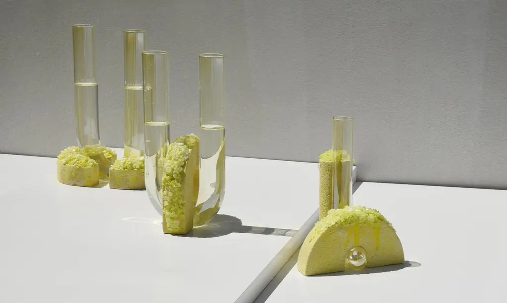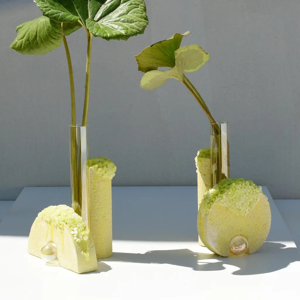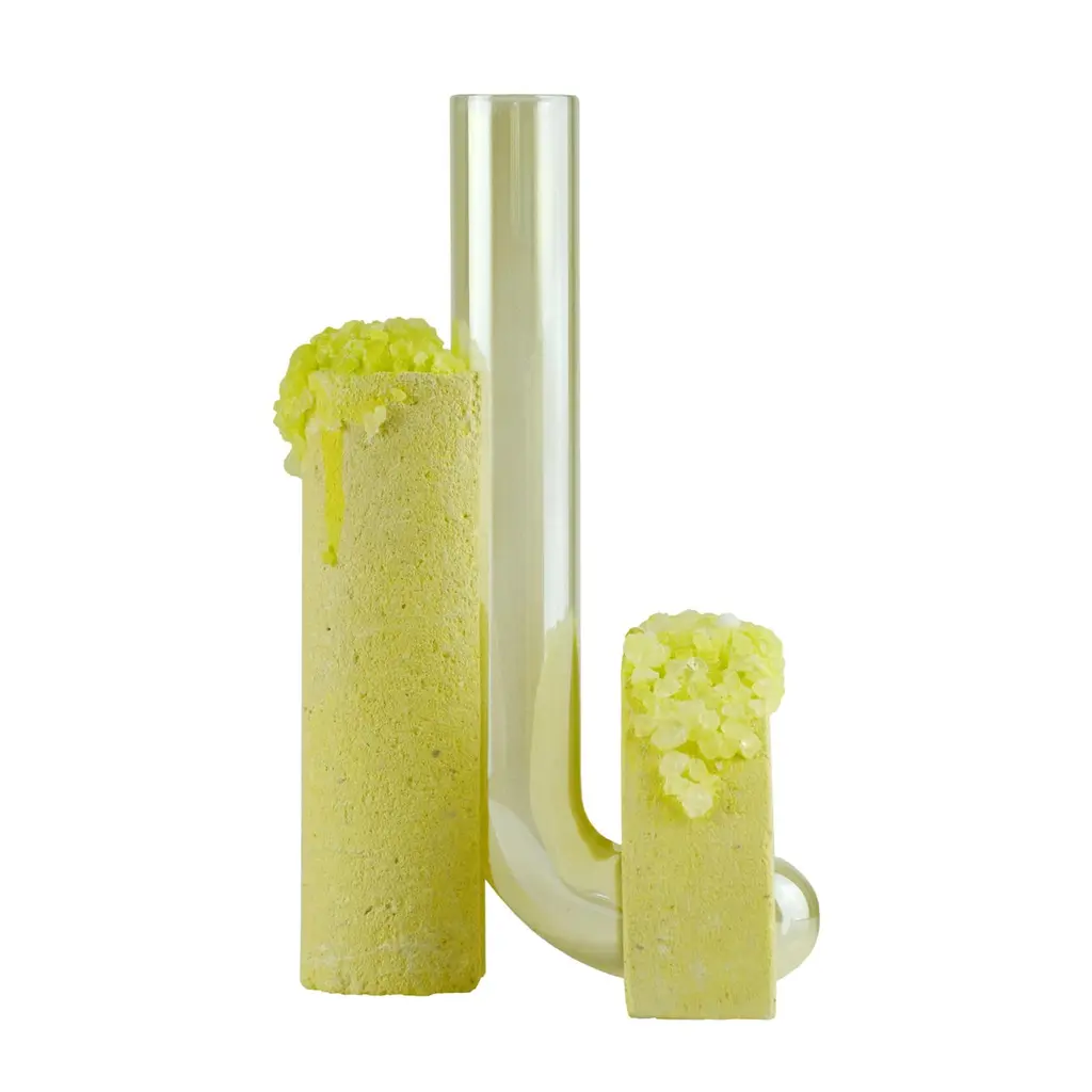Summer Cochlea della Metamorfosi 1 Seasons Edition Vase by Coki Barbieri.Dimensions: W 18,5 x D 15 x H 24 cm.Materials: Handcrafted stone made with Matera stone fragments, sedimentary rocks of the Italian Apennines and pure water, Italian rock salt crystals, yellow mineral pigments from Italian soils, yellow painted borosilicate glass.Cochlea della Metamorfosi 1 - SEASONS EDITION - SummerEmbellished with Italian rock salt crystals colored with natural pigments from the Italian subsoil, this vase from the Cochlea collection (inspired by the metamorphosis of snails) represents architecture and nature united together: curved and geometric shapes resulting from glass and sustainable stone.Like all COKI products, it is entirely made in Italy with raw materials processed according to the highest standards of recovery of virgin stones and using only substances that are not harmful to humans and the environment, without components of animal origin.The particular technique Glaciazione makes it possible to unite crystals and the handcrafted stone created from fragments of historical stones found in Matera (Città dei Sassi, UNESCO World Heritage, European Capital of Culture) and sedimentary rocks of the Italian Apennines, recovered and reprocessed following a sustainable production cycle. This material research is originalfrom the COKI studio and uses a natural chemical and physical adhesion process between the two materials. The result is a composite material, biodegradable in water, so it is recommended not to wet the stone part and always keep it away from sources of humidity.A precious objects collection made in Italy with natural and vegan origin materials, conceived by architectural and product designer Coki Barbieri and created by the local craftsmen to expand a new slow living awareness and surround oneself with a few objects, capable of staying alongside us over time.The climate emergency and increased future anxiety push our work to imagine alternative ways of living, producing, and consuming. For that Coki Barbieri uses notions of geology, chemistry, and design culture to create new products (and materials) from fragments and waste from natural products (such as stone and minerals).Coki Barbieri established her eponymous studio-workshop in Rimini in 2017, bringing to life a sustainable way of conceiving the product design for home. Nature inspires her environmentally conscious creations, which are imbued with emotional energy while maintaining their aesthetic impact and practical functionality. Coki collaborates with talented Italian craftsmen to produce one-of-a-kind homeware objects capable of unlocking new synergies between concepts, materials, and use.