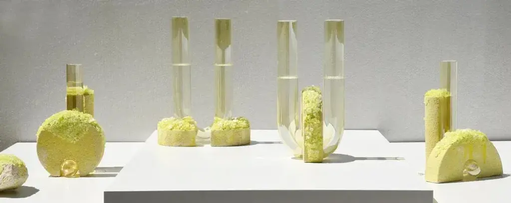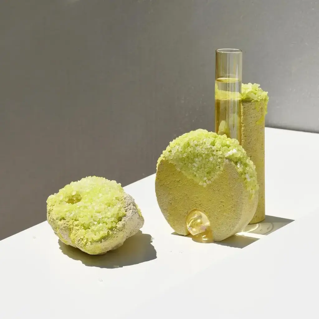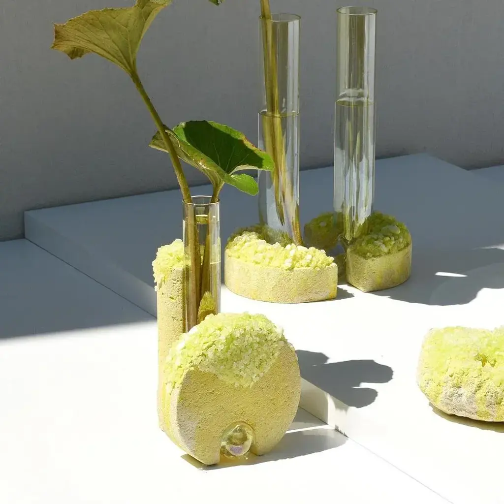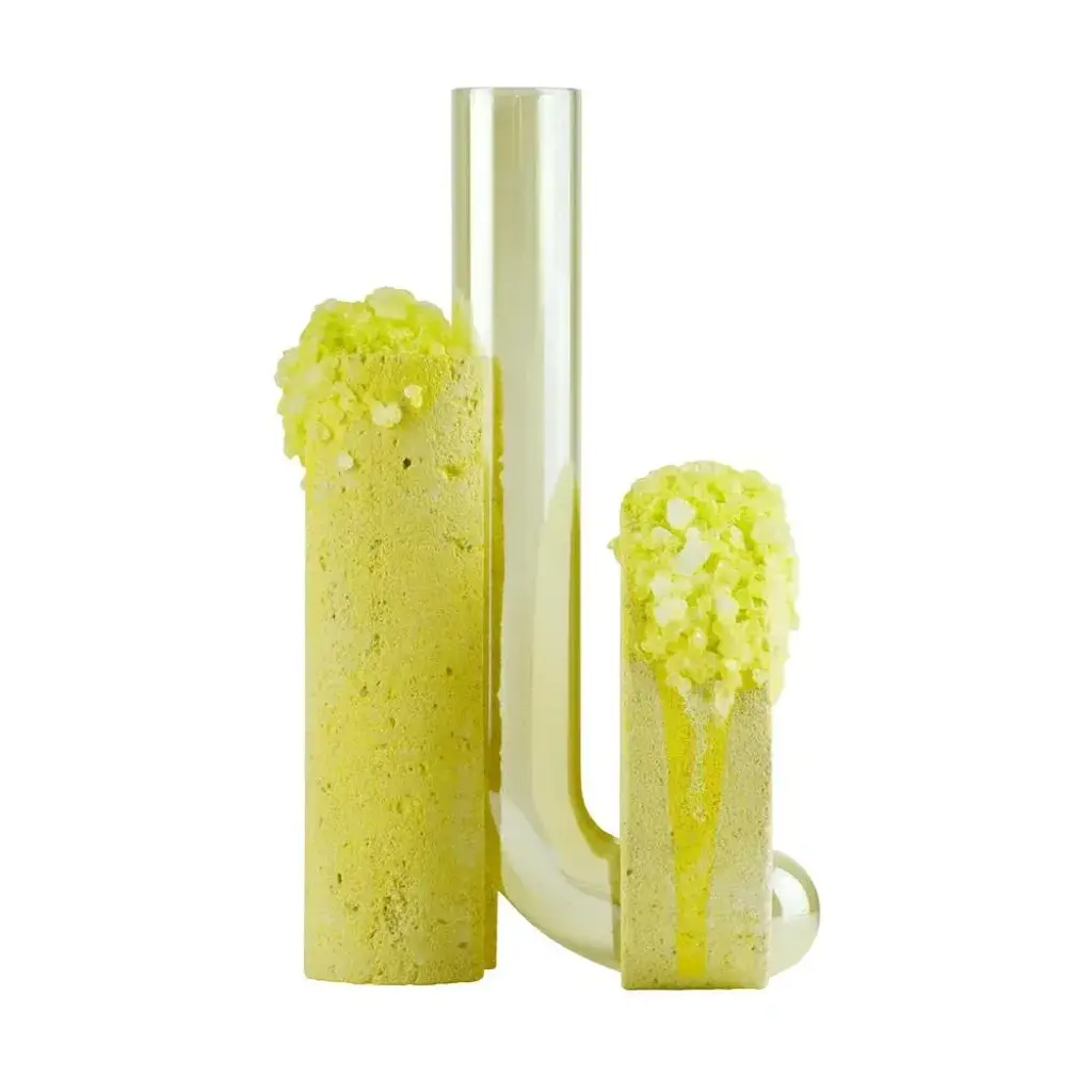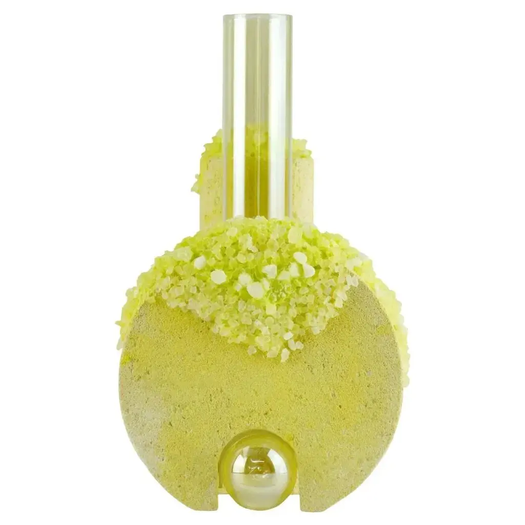 Summer cochlea della metamorfosi 2 seasons edition vase by coki barbieri dimensions: w 14 x d 15 x h 24 cm. Materials: handcrafted stone made with matera stone fragments, sedimentary rocks of the italian apennines and pure water, italian rock salt crystals, yellow mineral pigments from italian soils, yellow painted borosilicate glass. Cochlea della metamorfosi 2 - seasons edition - summer embellished with italian rock salt crystals colored with natural pigments from the italian subsoil, this vase from the cochlea collection (inspired by the metamorphosis of snails) represents architecture and nature united together: curved and geometric shapes resulting from glass and sustainable stone. Like all coki products, it is entirely made in italy with raw materials processed according to the highest standards of recovery of virgin stones and using only substances that are not harmful to humans and the environment, without components of animal origin. The particular technique glaciazione makes it possible to unite crystals and the handcrafted stone created from fragments of historical stones found in matera (città dei sassi, unesco world heritage, european capital of culture) and sedimentary rocks of the italian apennines, recovered and reprocessed following a sustainable production cycle. This material research is original from the coki studio and uses a natural chemical and physical adhesion process between the two materials. The result is a composite material, biodegradable in water, so it is recommended not to wet the stone part and always keep it away from sources of humidity. A precious objects collection made in italy with natural and vegan origin materials, conceived by architectural and product designer coki barbieri and created by the local craftsmen to expand a new slow living awareness and surround oneself with a few objects, capable of staying alongside us over time. The climate emergency and increased future anxiety push our work to imagine alternative ways of living, producing, and consuming. For that coki barbieri uses notions of geology, chemistry, and design culture to create new products (and materials) from fragments and waste from natural products (such as stone and minerals).