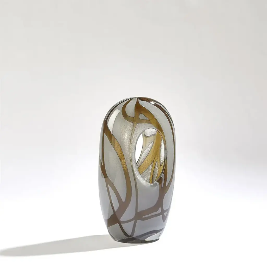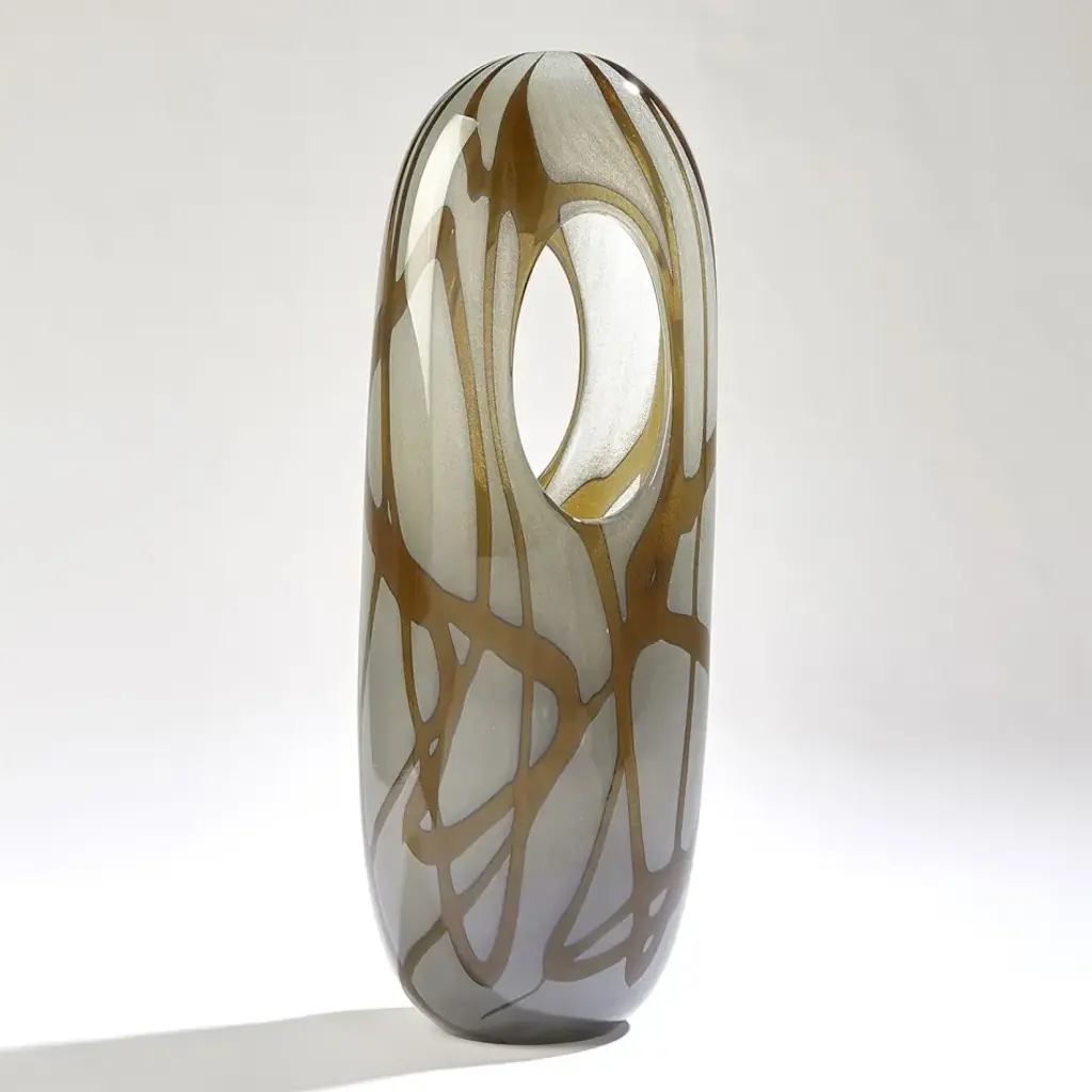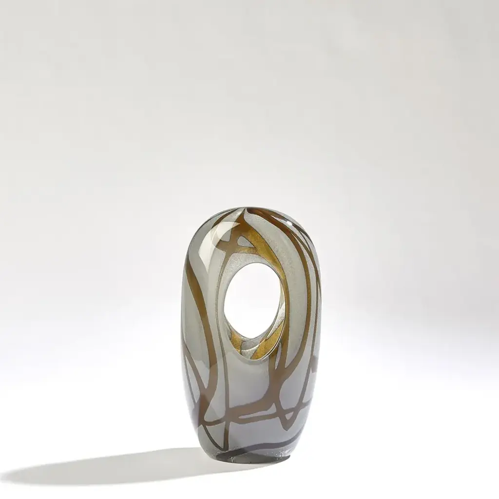 Beautiful art glass vase with a unique hole cut straight through the middle. Amber and grey colored glass tubes are formed together in molten state to achieve the design. From a fashion forward perspective, Global Views offers accessories, furniture, statement lighting, and an assortment of rugs and mirrors to add beauty and joy to your home.