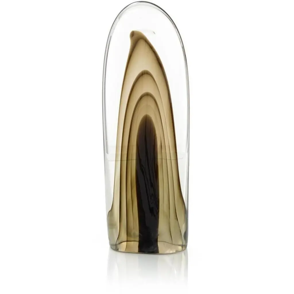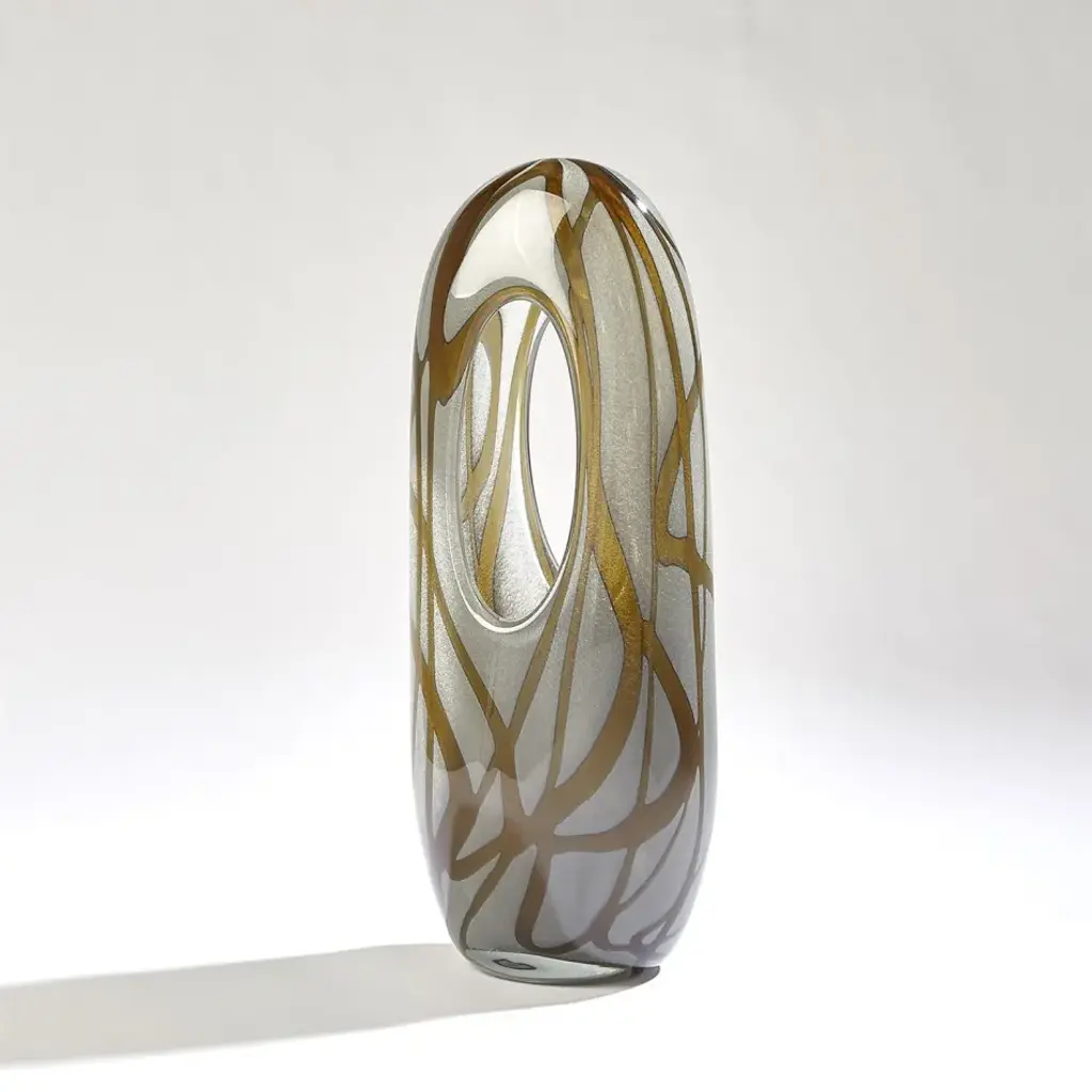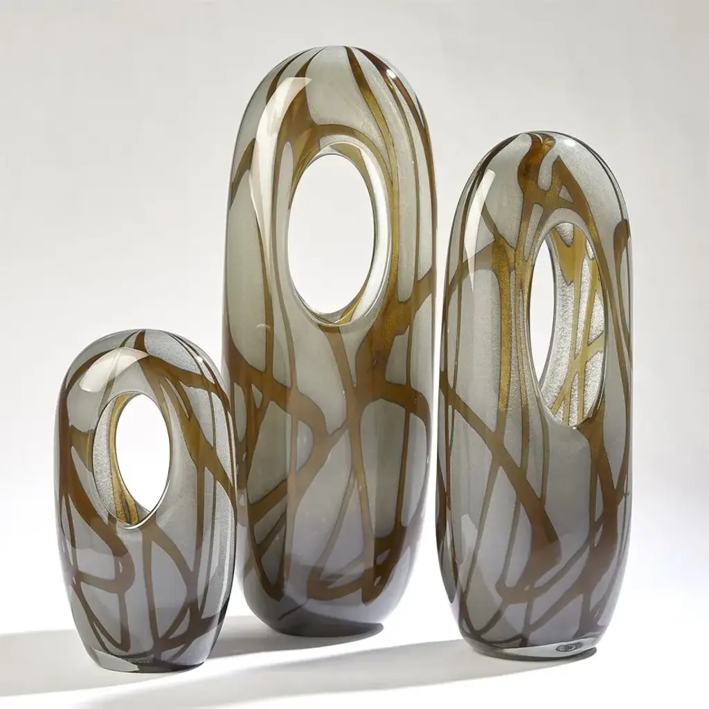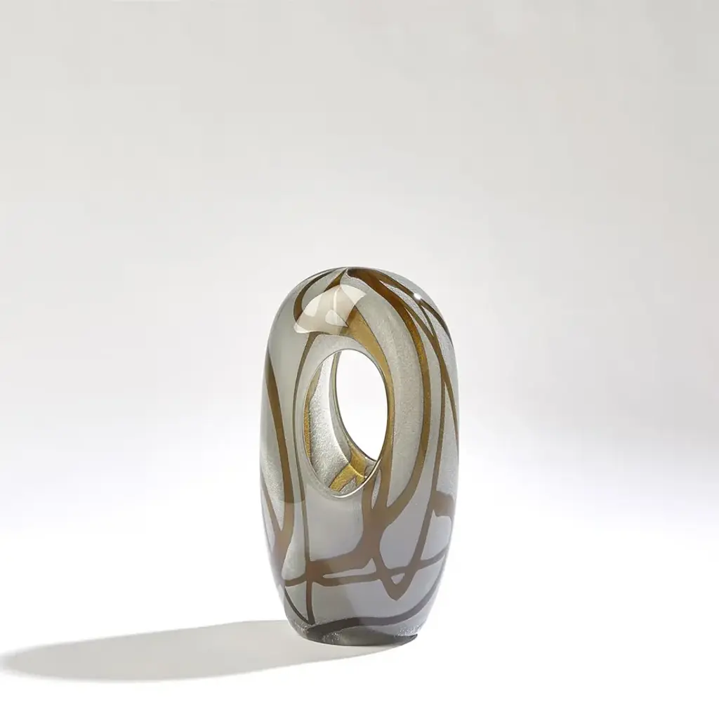 Beautiful art glass vase with a unique hole cut straight through the middle. Amber and grey colored glass tubes are formed together in molten state to achieve the design. From a fashion forward perspective, Global Views offers accessories, furniture, statement lighting, and an assortment of rugs and mirrors to add beauty and joy to your home.