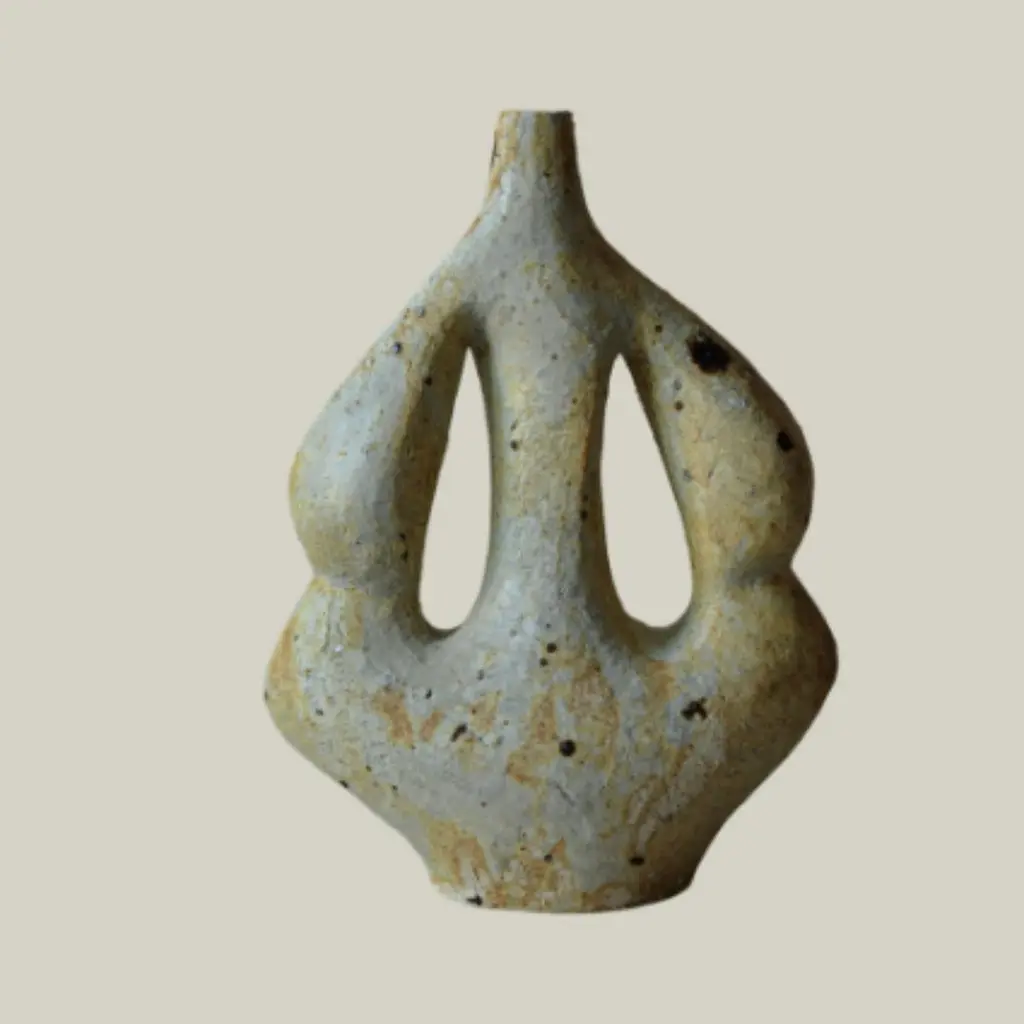 Sympoiesis no 99 vessel by Studio Viv LeeUnique and signedDimensions: W 26.5 x D 10.5 x H 26.5 cmMaterials: white and crank stoneware, glaze containing foraged oyster shells.All vessels are coil built, unique and signed. They are for decorative use only as they may not be watertight.MAKER'S HISTORYViv Lee was born in Hong Kong and studied at Glasgow School of Art. After graduating, she remained in Glasgow and is still based there today, creating ceramics inspired by the beautiful irregularity of nature. Rather than seeking perfect symmetry in her work, Viv looks to organic forms – particularly the human body – and embraces the imperfect. Each piece is a unique work of art, which also serves a functional purpose. Her hand-built stoneware lamps have been exclusively created for The New Craftsmen.THE PROCESSUsing the slow, hand-building techniques of pinching and coiling clay, Viv is guided by an intuitive response to her material. Sometimes Viv begins work with a loosely formed idea in her mind, but if the process of coiling clay draws her in another direction, she tries to remain fluid. The lamps are lightly textured and hand painted in several coats of underglaze and glaze, in a neutral palette of whites and earthy tones. The resulting ‘Wabi Sabi’ quality produces one of a kind pieces.