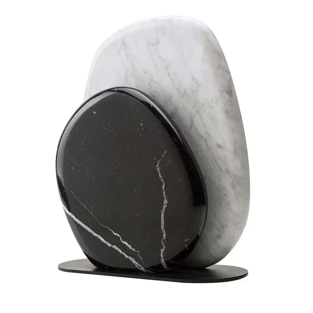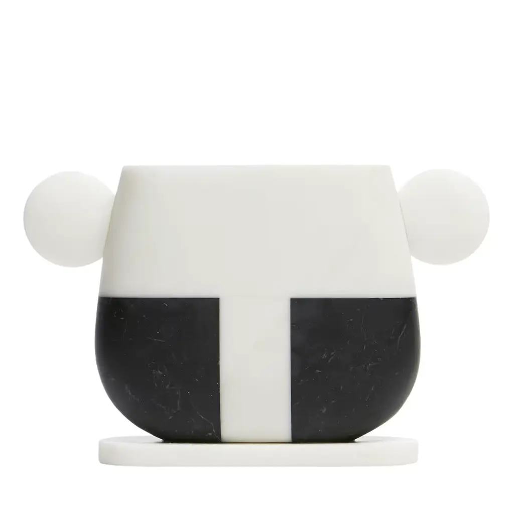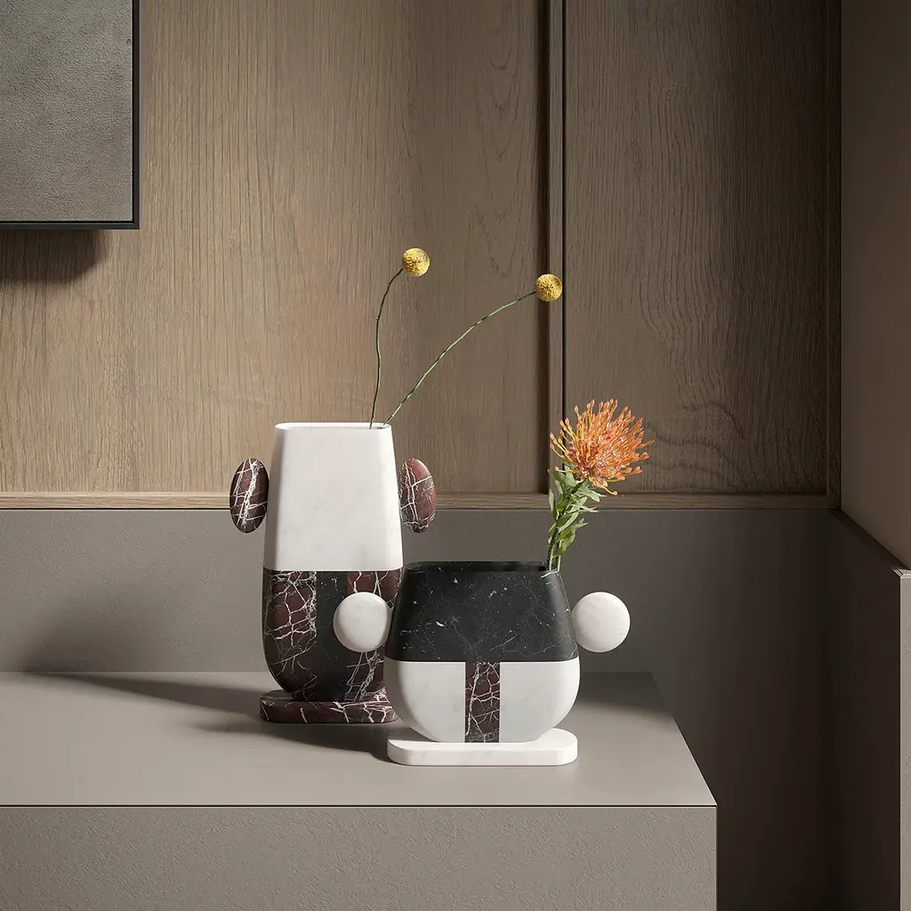 Designer Matteo Cibic pays homage to renowned Baroque sculptor Pietro Tacca with this one-off vase combining prized white Michelangelo, black Marquina, and red Levanto marbles in a fine harmony of proportions and hues. Comprised of an elongated base, a flattened body, and two disks placed at the sides, the design will elevate a contemporary home or private study. Displaying fresh flowers requires the addition of vials or jars since the piece is not water-tight. Please note that marbles and stones are natural materials and they can differ also if coming from the same quarry or the same block. The product shown may differ from purchased items. Every piece is unique. Vases made of various marbles cannot guarantee water tightness, better not to use for cut flowers unless with vials for each flower, an internal glass/plastic jar or gel water pearls.