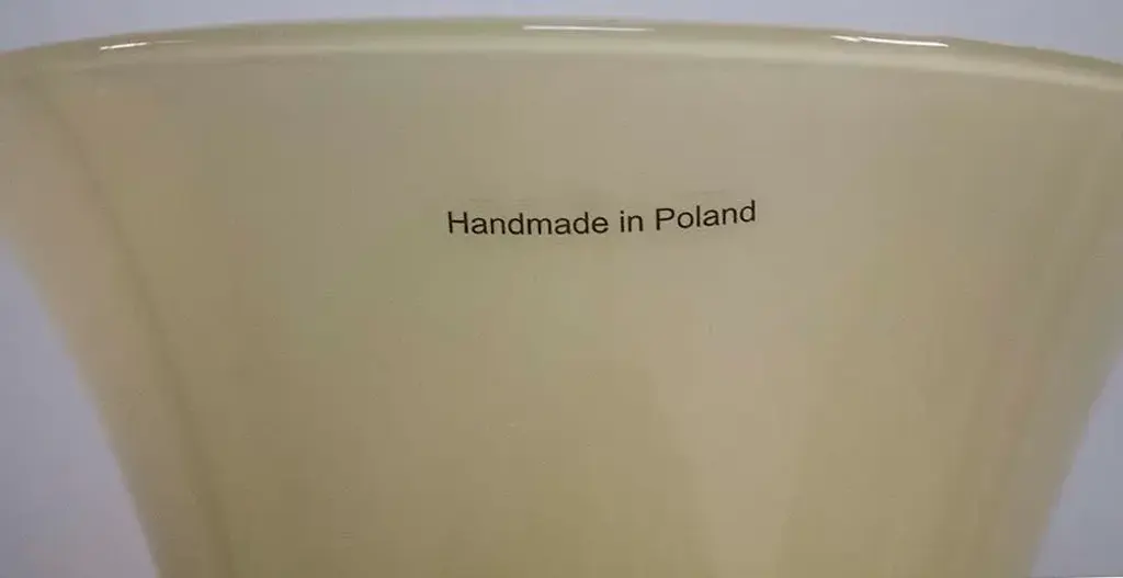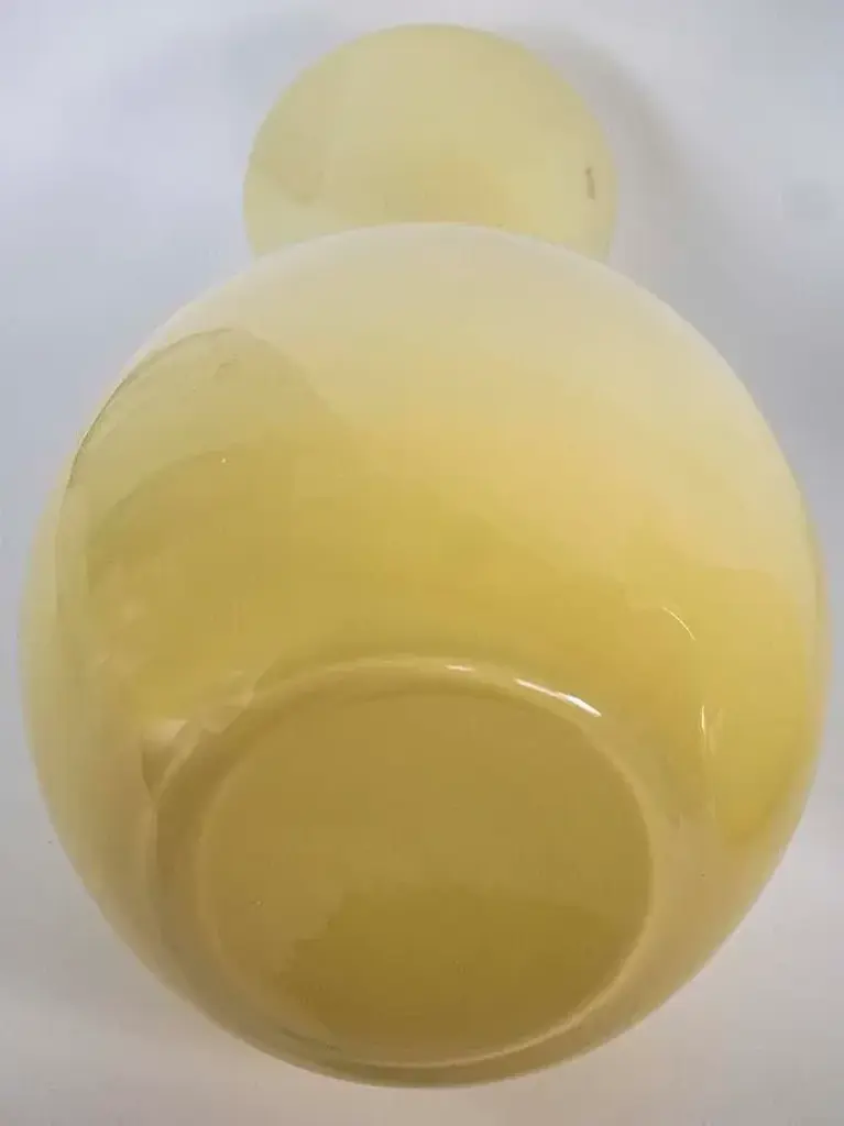 High End Art Glass Vase Made in Poland as shown on label in photo. There are two available. Think how striking these would be as a pair perhaps sitting on plant stands at an entryway or? Measurements: 18 1/2" High x 31" Circumference at widest part, Width 10", Width 9 Lbs. Price reduced several times to offset packing charge
