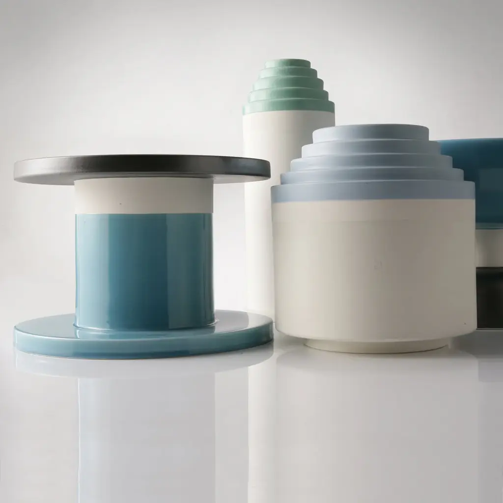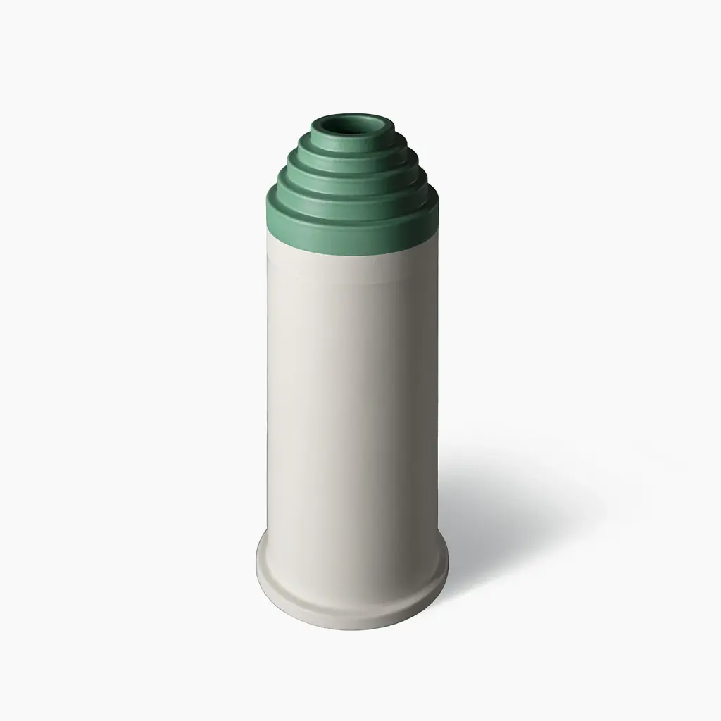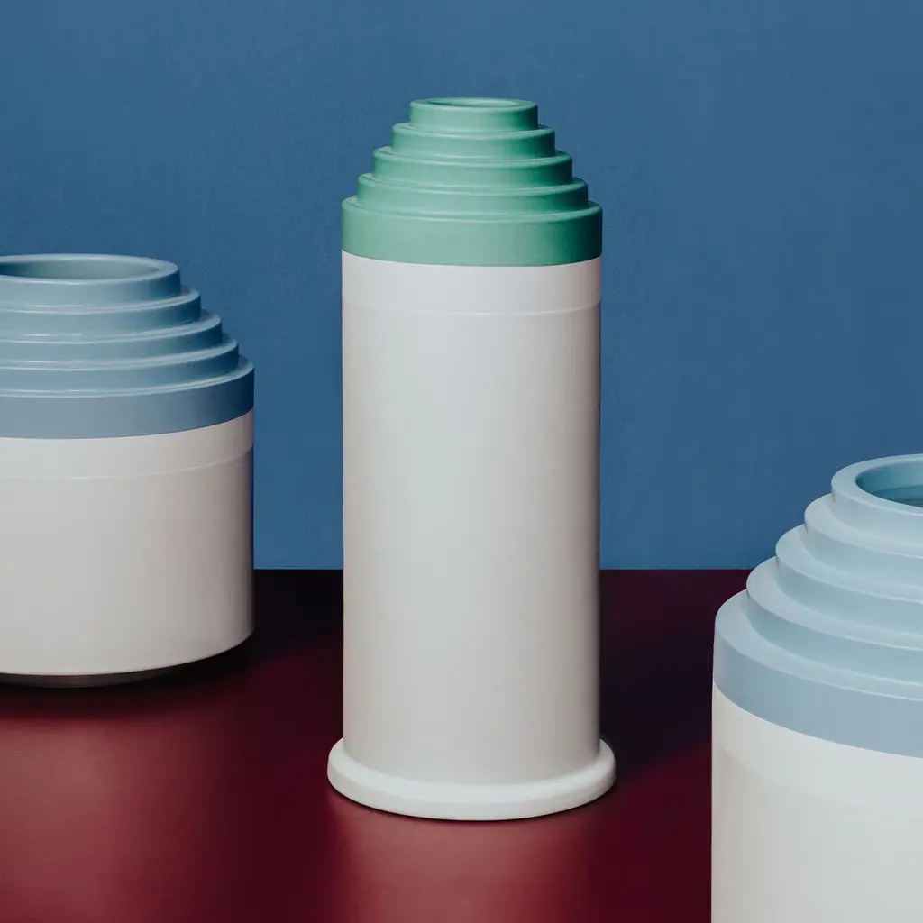 This simple yet elegant vase was designed by the Italian architect Ettore Sottsass exclusively for Bitossi. It features a cylindrical shape in white clay, topped with five concentric circles that decrease in size to form a small mouth at the rim. Placed alone or with other objects in complementing hues, this piece will make an elegant statement on a console or in an entryway.