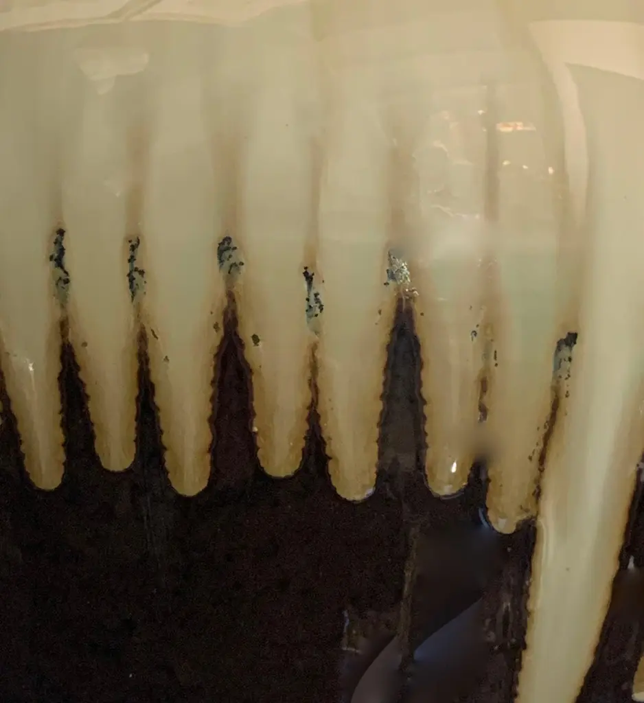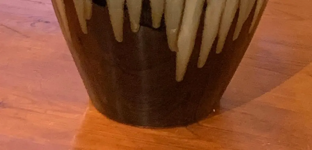Contemporary Chinese ceramic vase with decorative drip glaze.Vertical drip pattern on dark brown iridescent glazed bottom.Hints of deep blue are exposed beneath the dark brown lip.Two are available and sold individually.