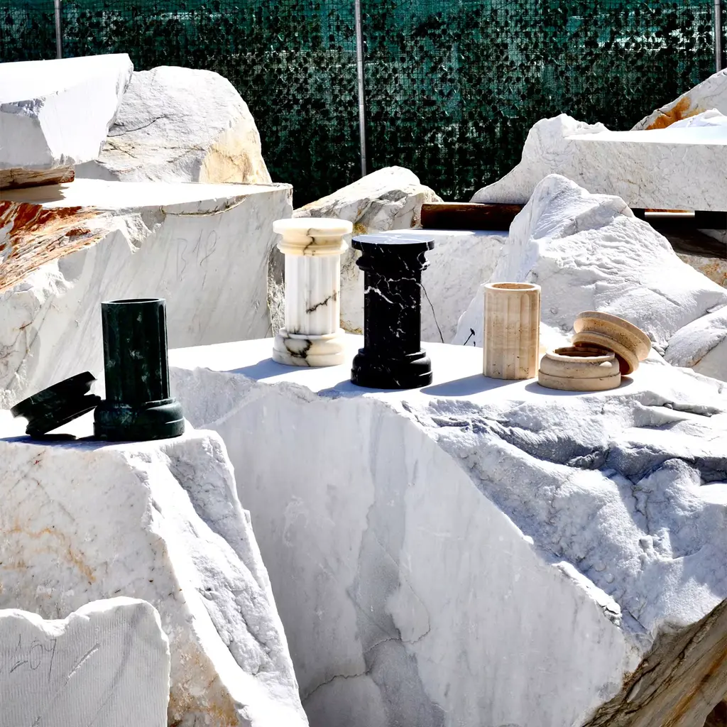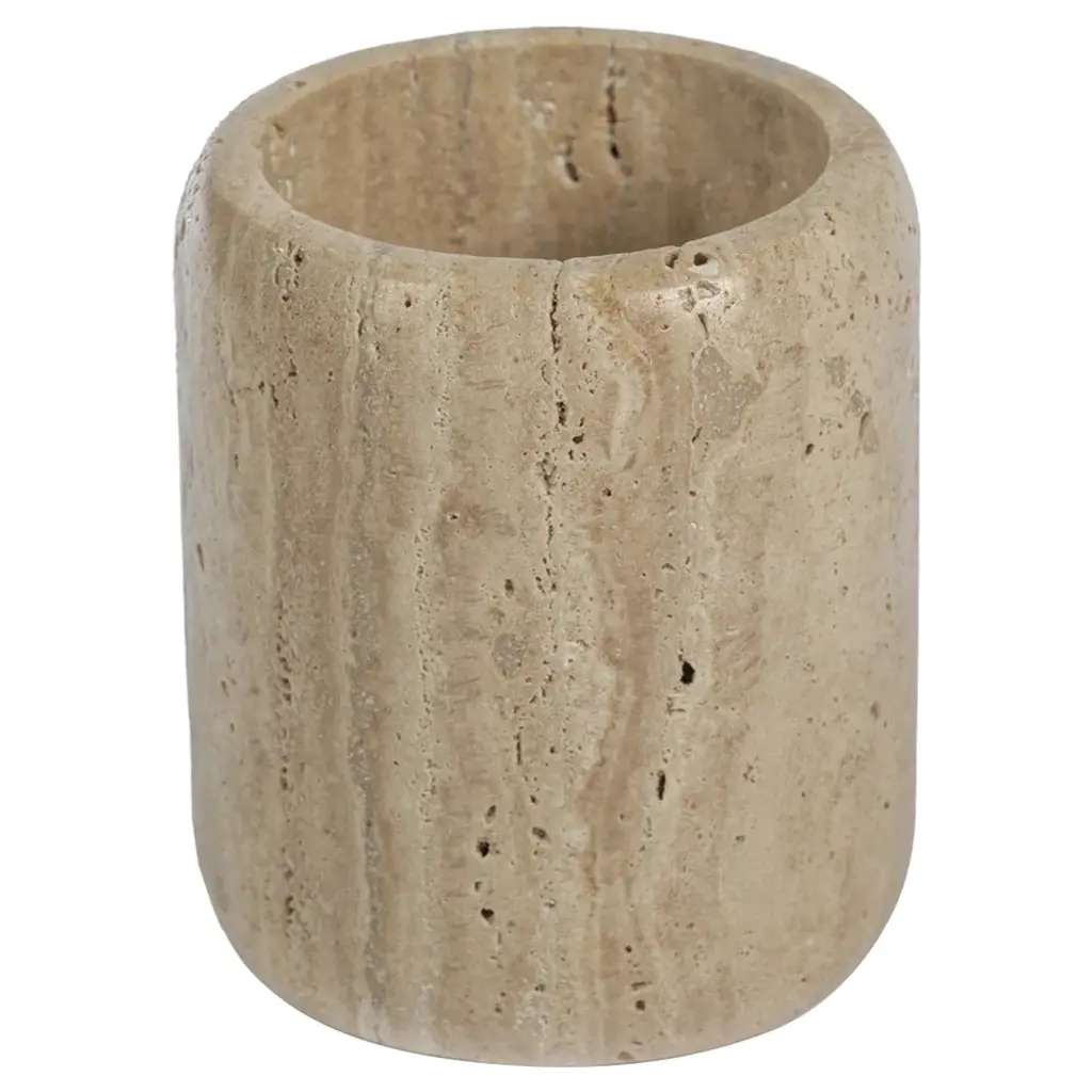 TAN is the central part of the decorative vase POR TAN TE, contributing to its overall modular design. This part can be used independently as an elegant decorative element or combined with the other two parts to complete the full vase. Designed in collaboration with SuonareStella, this vase is crafted from satin Travertino marble, a material that imparts natural elegance, with each piece being unique due to its distinctive veining.