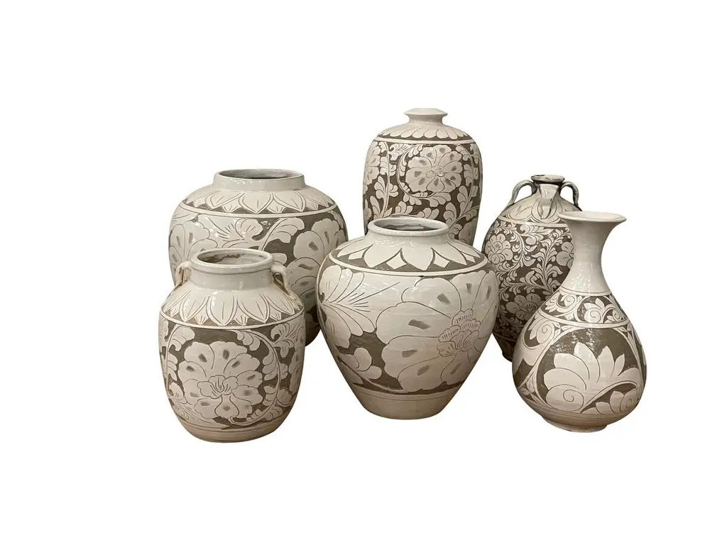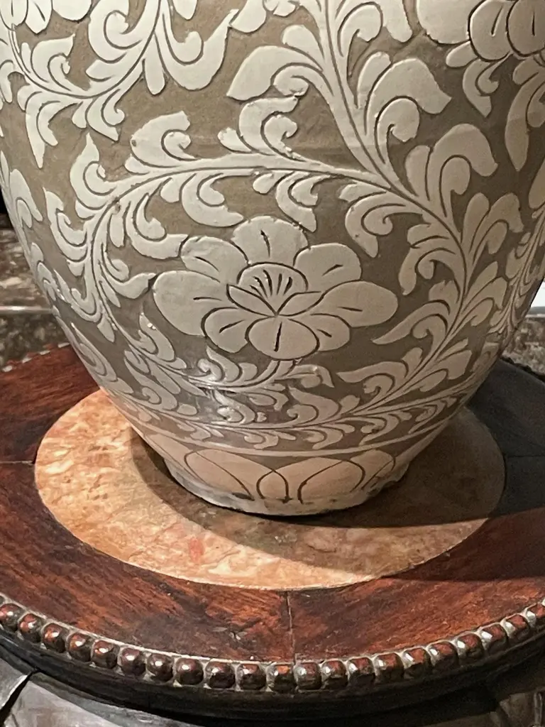 Contemporary Chinese tan ground with cream floral pattern overlay.Four small handles at opening.Two available and sold individually.