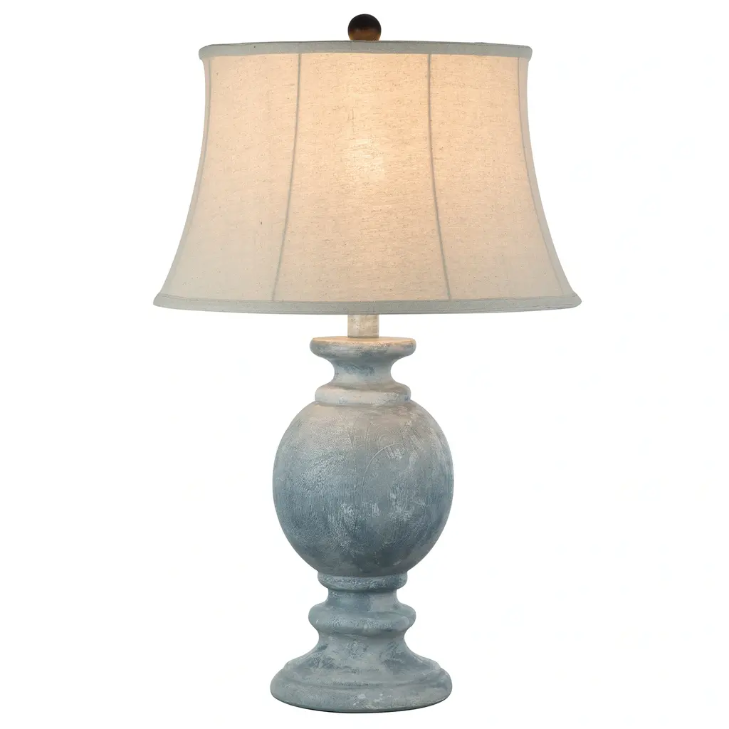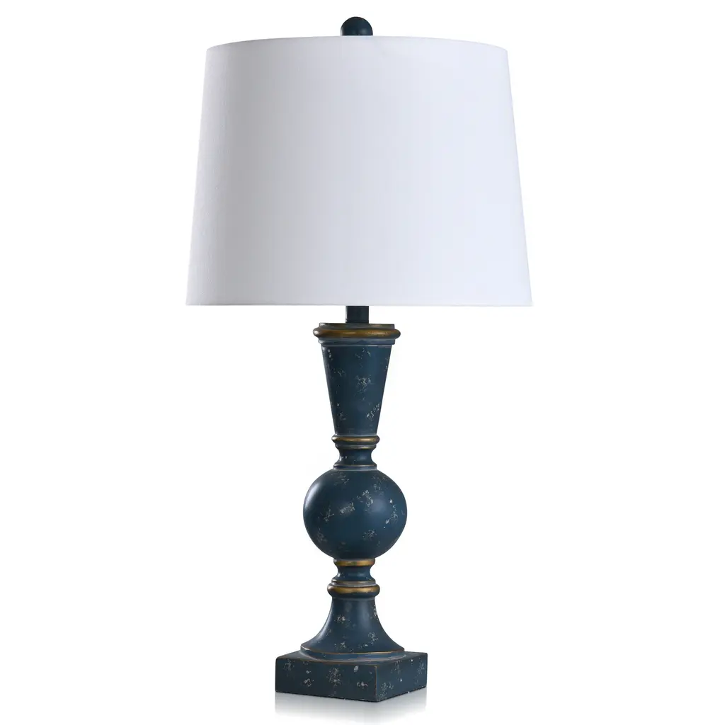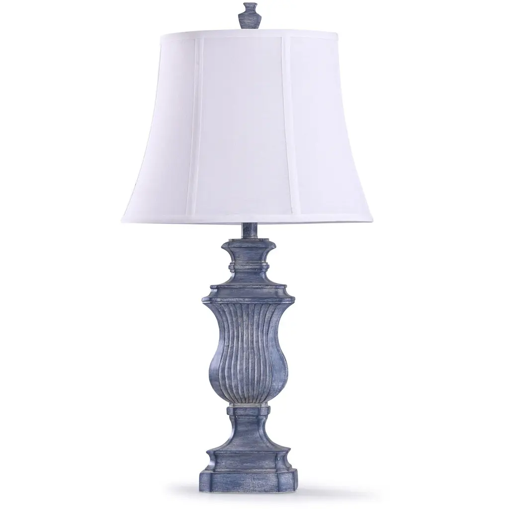 Farmhouse style is on full display in this traditional table lamp. With a blue denim finish covering the polyresin frame, the body presents an appealing rustic aesthetic. The off-white shade, made from polyester and linen, includes a white trim that offers a stylish accent. Any office, bedroom or living room will get a decorative boost from this traditional lamp.Features:Rustic/ Farmhouse/ TraditionalIncludes an On-off Switch switch located at the neck of the lampShade Shape: BellRequires 1 x 60 watt Incandescent bulb(s) ( not included)Due to lighting and monitor differences, actual colors and finishes may vary slightly from what appears online.