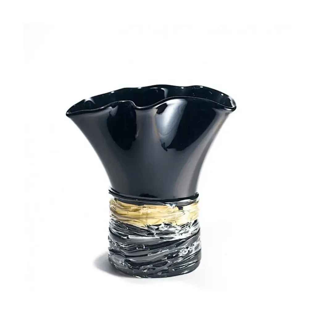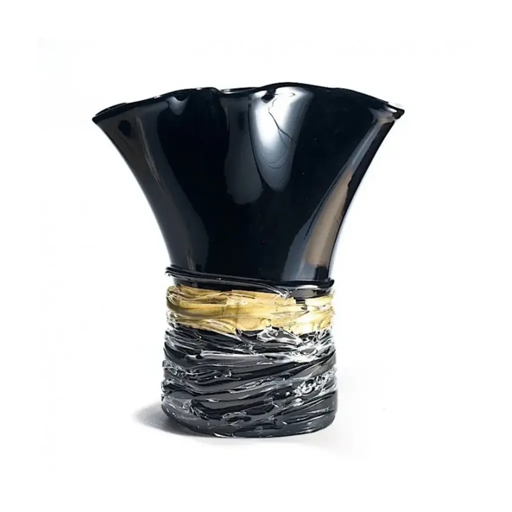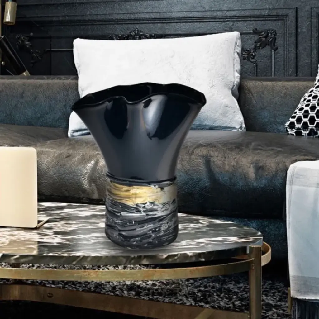 TARTARO is a wonderful Murano Glass black vase enriched with golden crystal filaments. A valuable solution for a special gift as well as a great modern furniture idea. Incandescent filaments of blue, green, and amber glass envelop this line of hand-blown glass vases, giving life to glass artworks that leave you in awe at first sight. The unique shape of these decorative vases, made in Italy, is sinuous and almost fluid. These exceptional handcrafted vases were forged in the renowned workshops of Murano, thanks to a powerful blend of passion, talent, and unparalleled skills rooted in decades of glassmaking experience. All our products are artisanal and of the highest production quality. Non-substantial variations in shape, size, color, and/or minor imperfections are inevitable and are typical of manual glasswork, highlighting the artisanal craftsmanship.