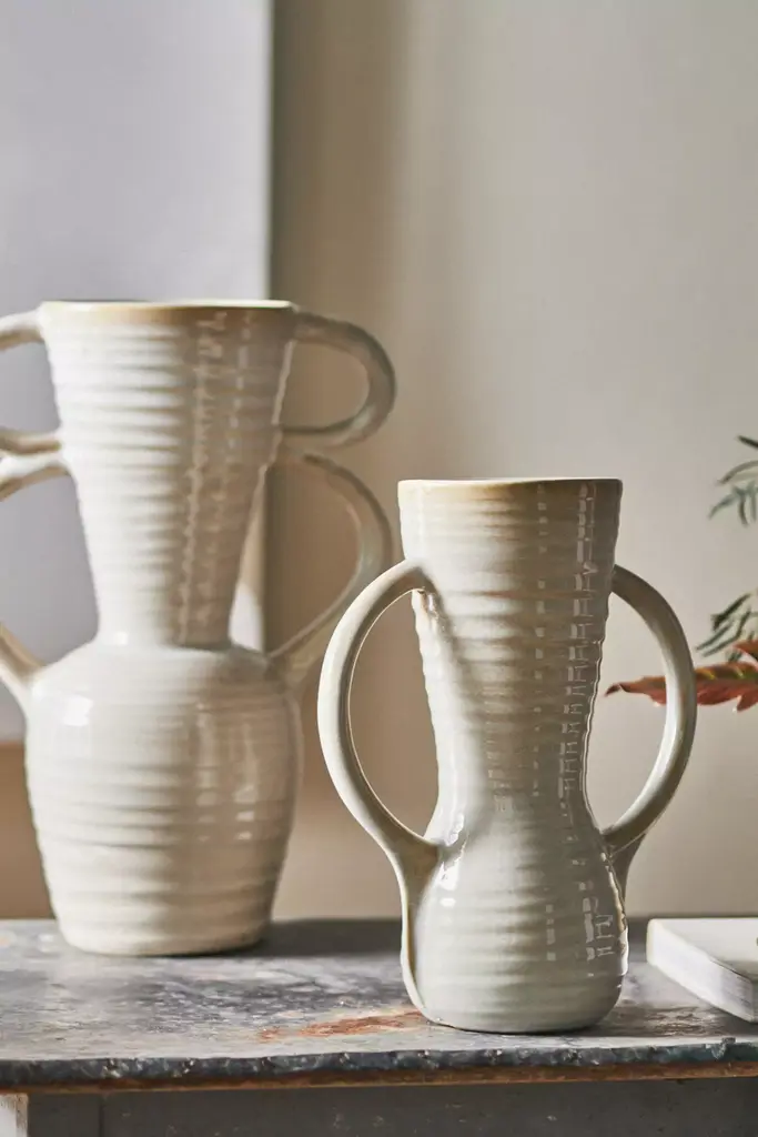 With its oversized handles and round yet tapered shape, this vase combines functionality with modern design, making it a striking centerpiece for any space.